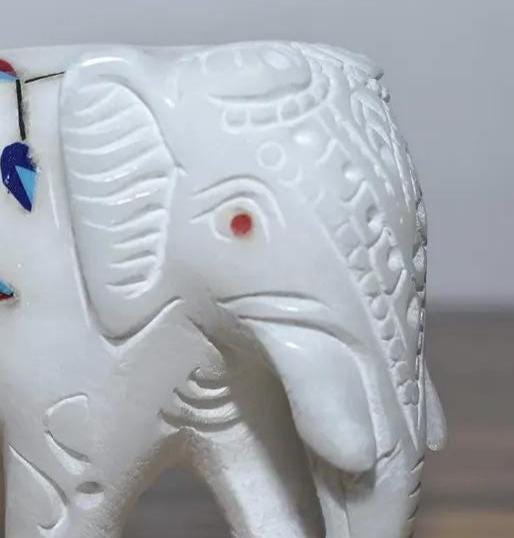 Carved from solid white marble, the elephant features intricate engraved detailing along the head and trunk, complemented by a hand-inlaid flower motif in rich red, blue, and green tones.