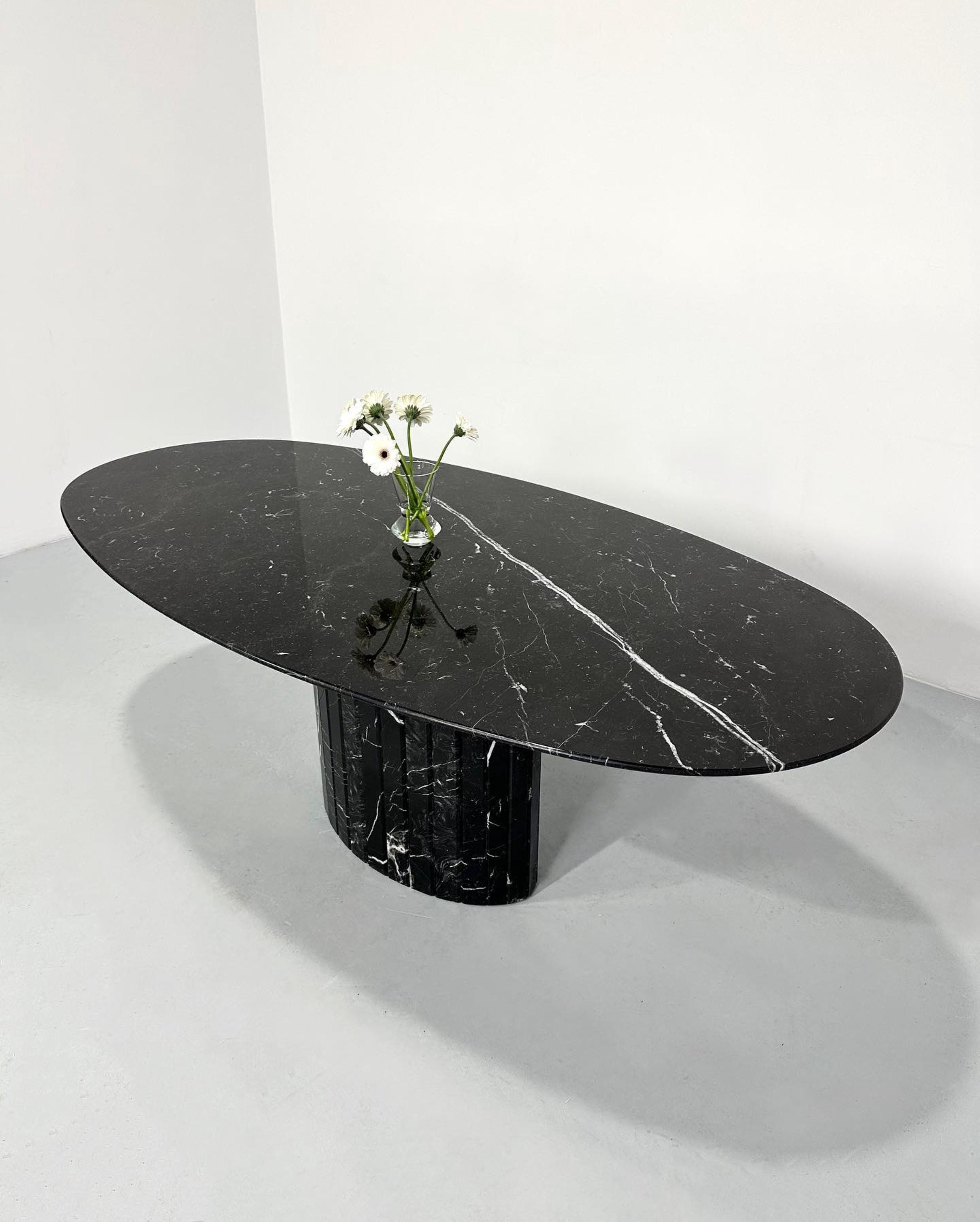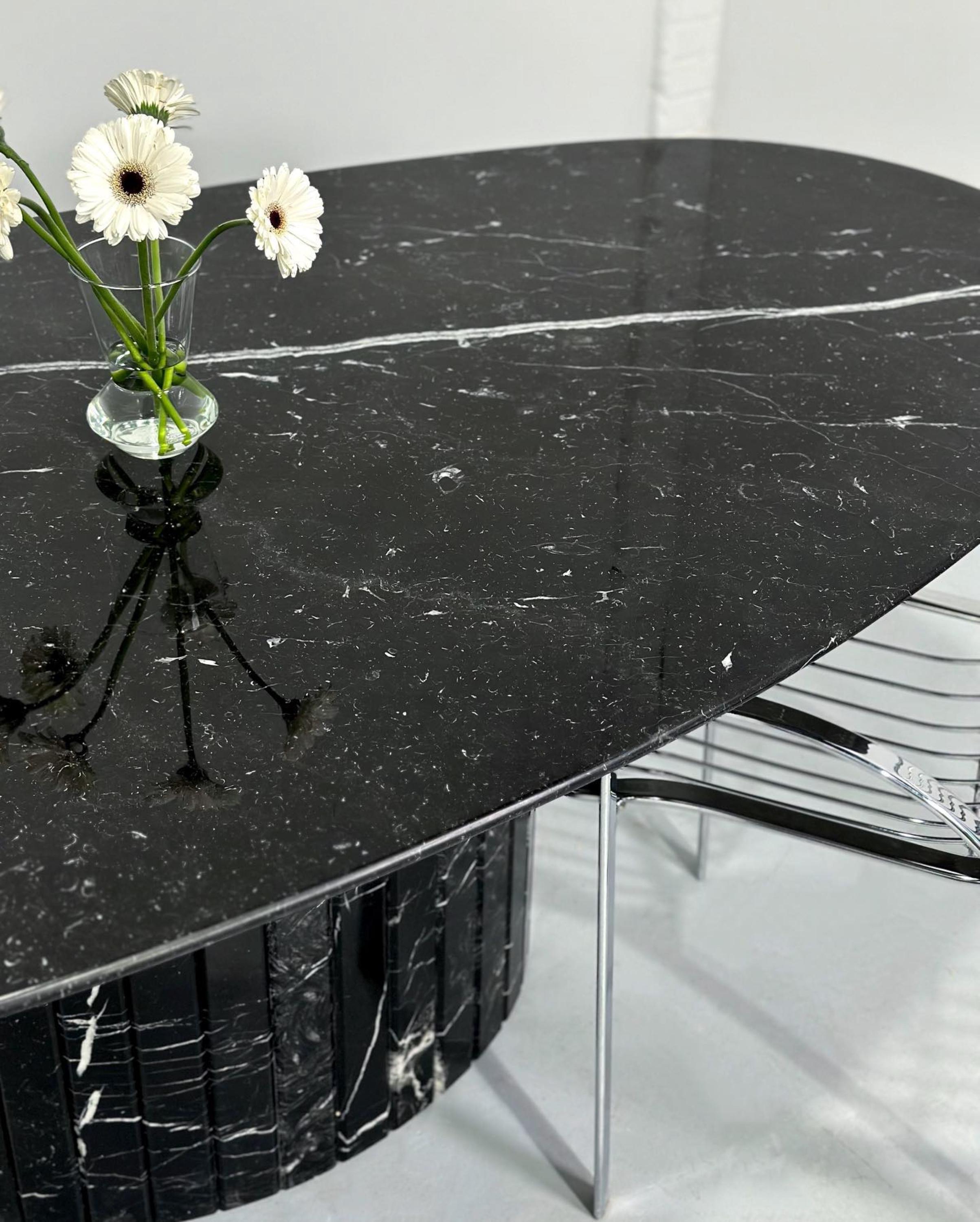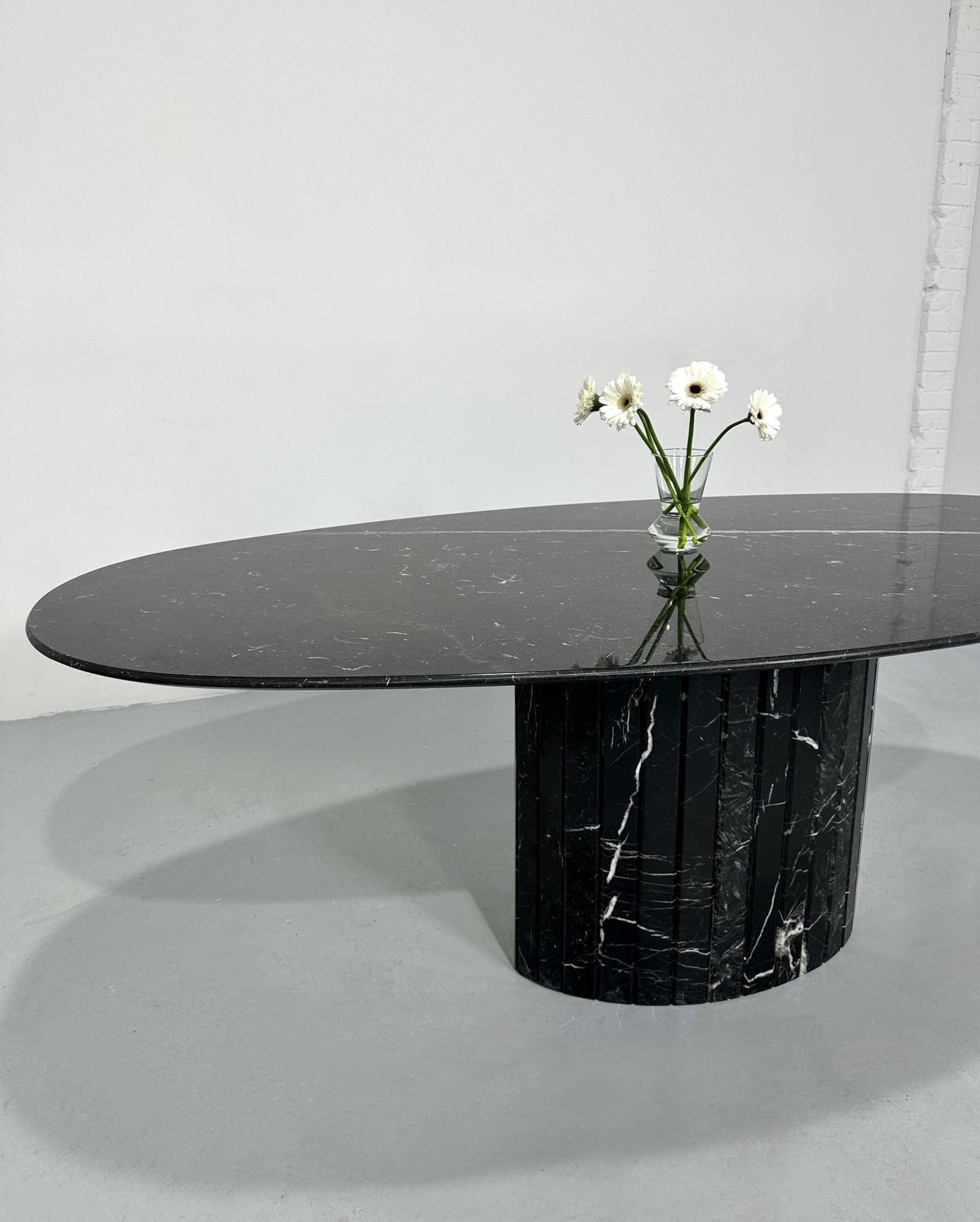 Elevate your interior with this handcrafted Nero Marquina marble table, a masterpiece of modern luxury. Featuring a sleek oval tabletop with striking white natural veining, this design exudes sophistication and balance. The solid fluted marble base adds architectural character and stability, creating a sculptural centerpiece that blends art with function.