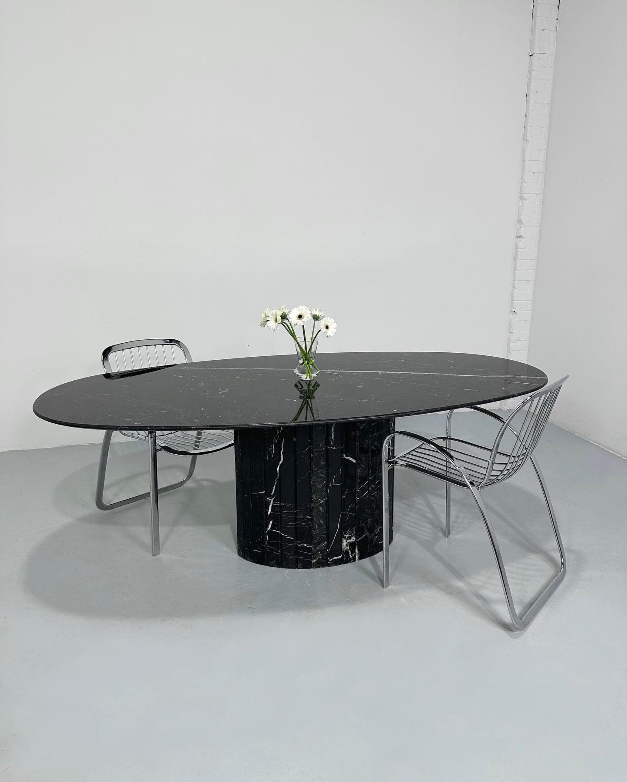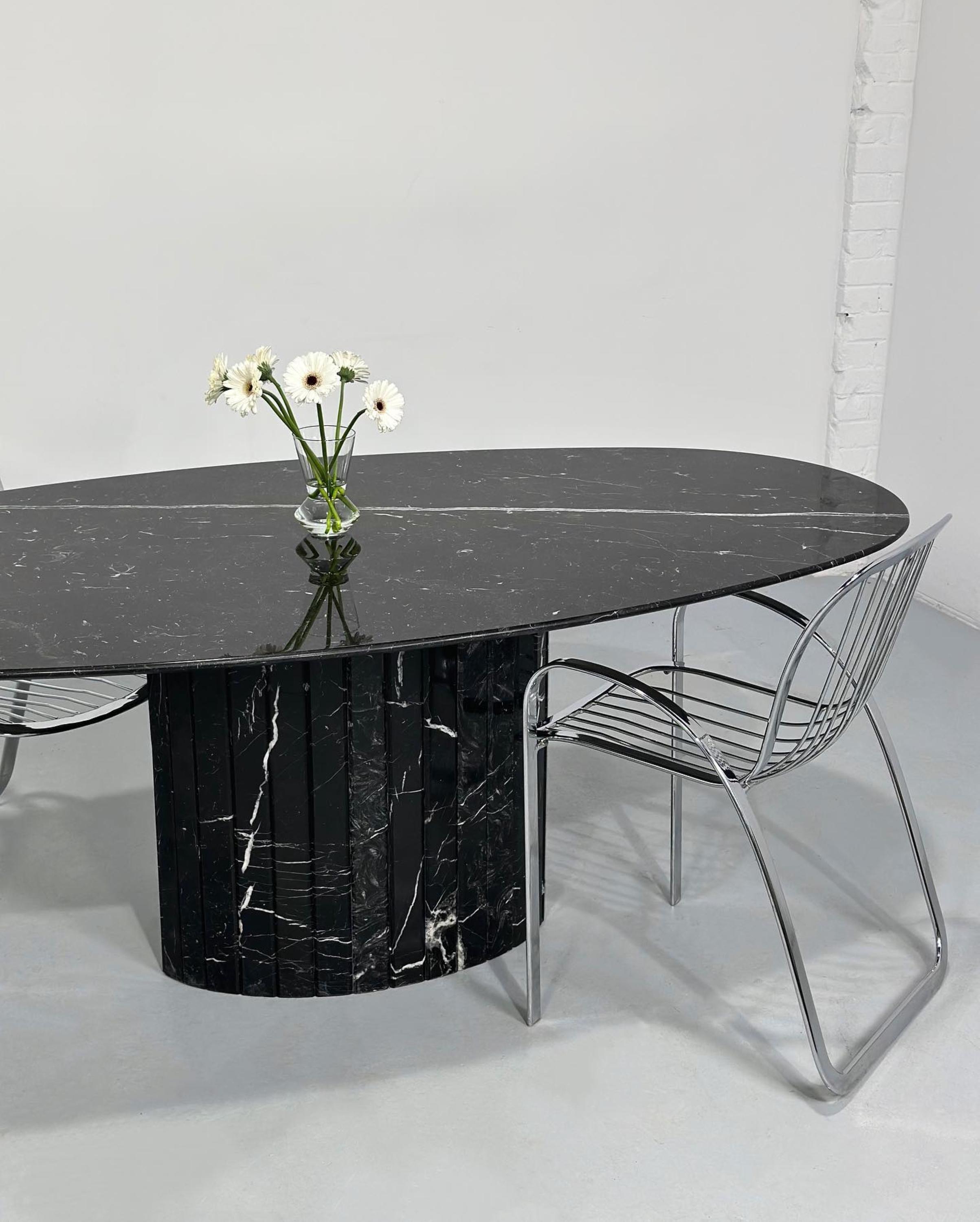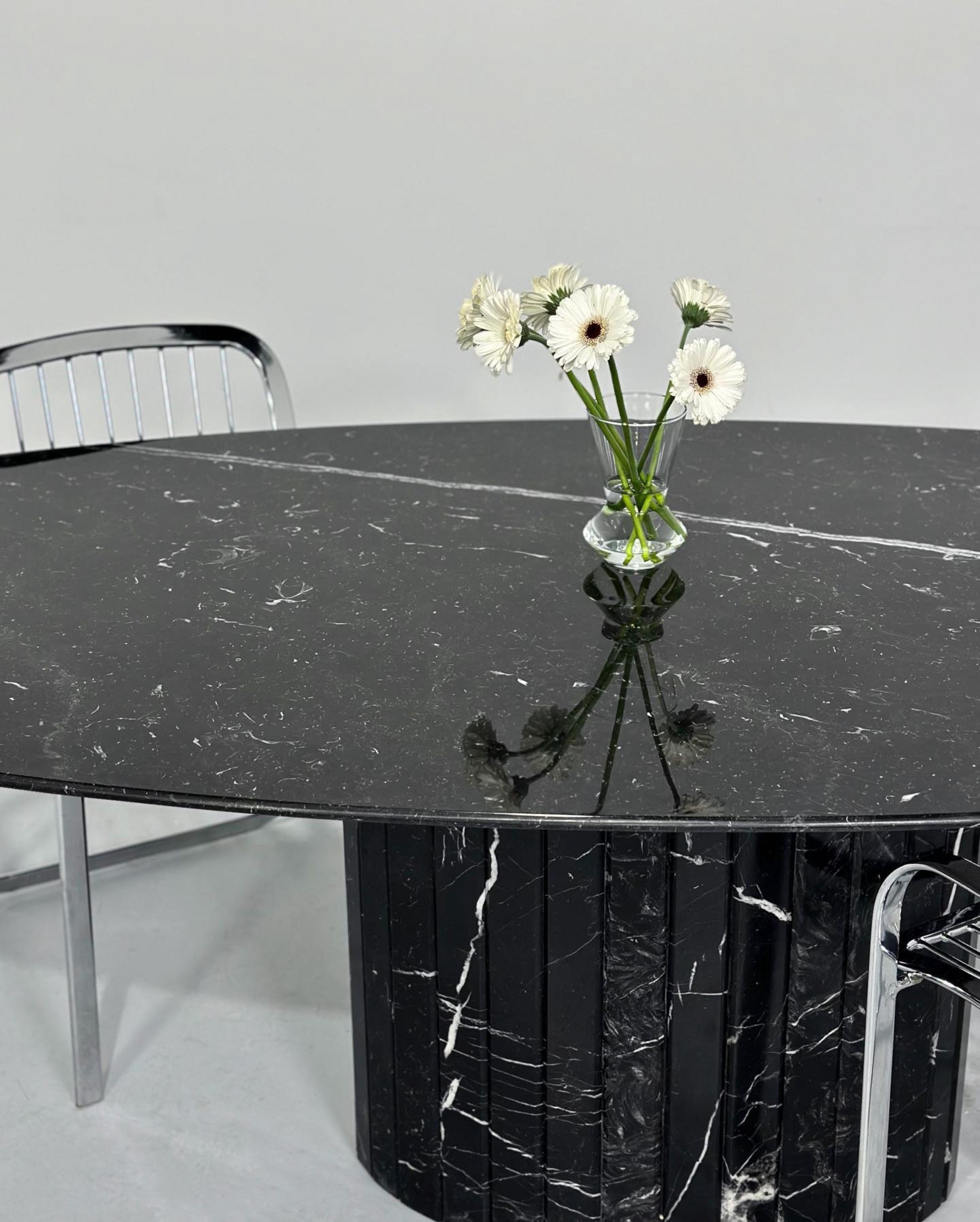 Elevate your interior with this handcrafted Nero Marquina marble table, a masterpiece of modern luxury. Featuring a sleek oval tabletop with striking white natural veining, this design exudes sophistication and balance. The solid fluted marble base adds architectural character and stability, creating a sculptural centerpiece that blends art with function.