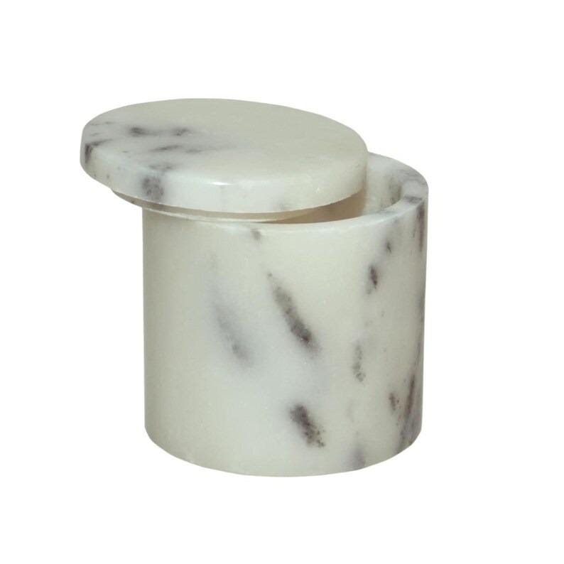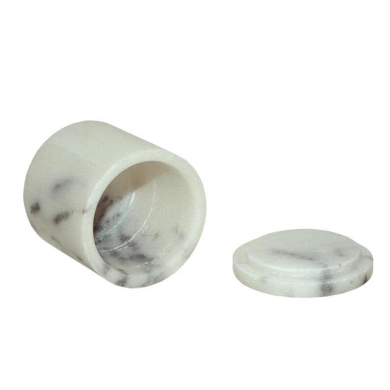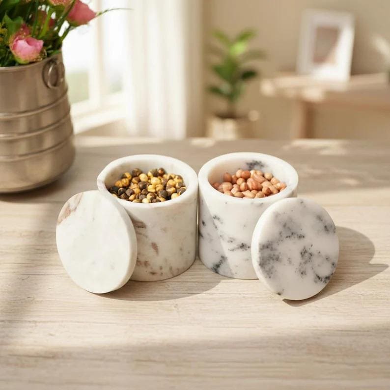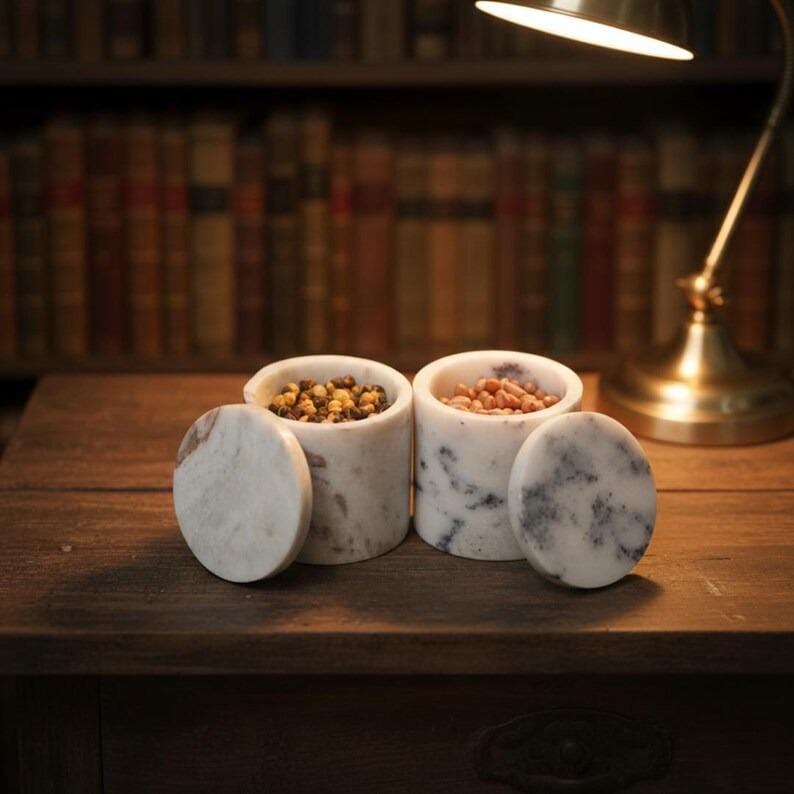 Upgrade your kitchen organization with this elegant set of two marble spice jars. Crafted from solid natural marble with unique veining, each jar comes with a snug-fitting lid to keep spices, herbs, salt, or small pantry items fresh and accessible.