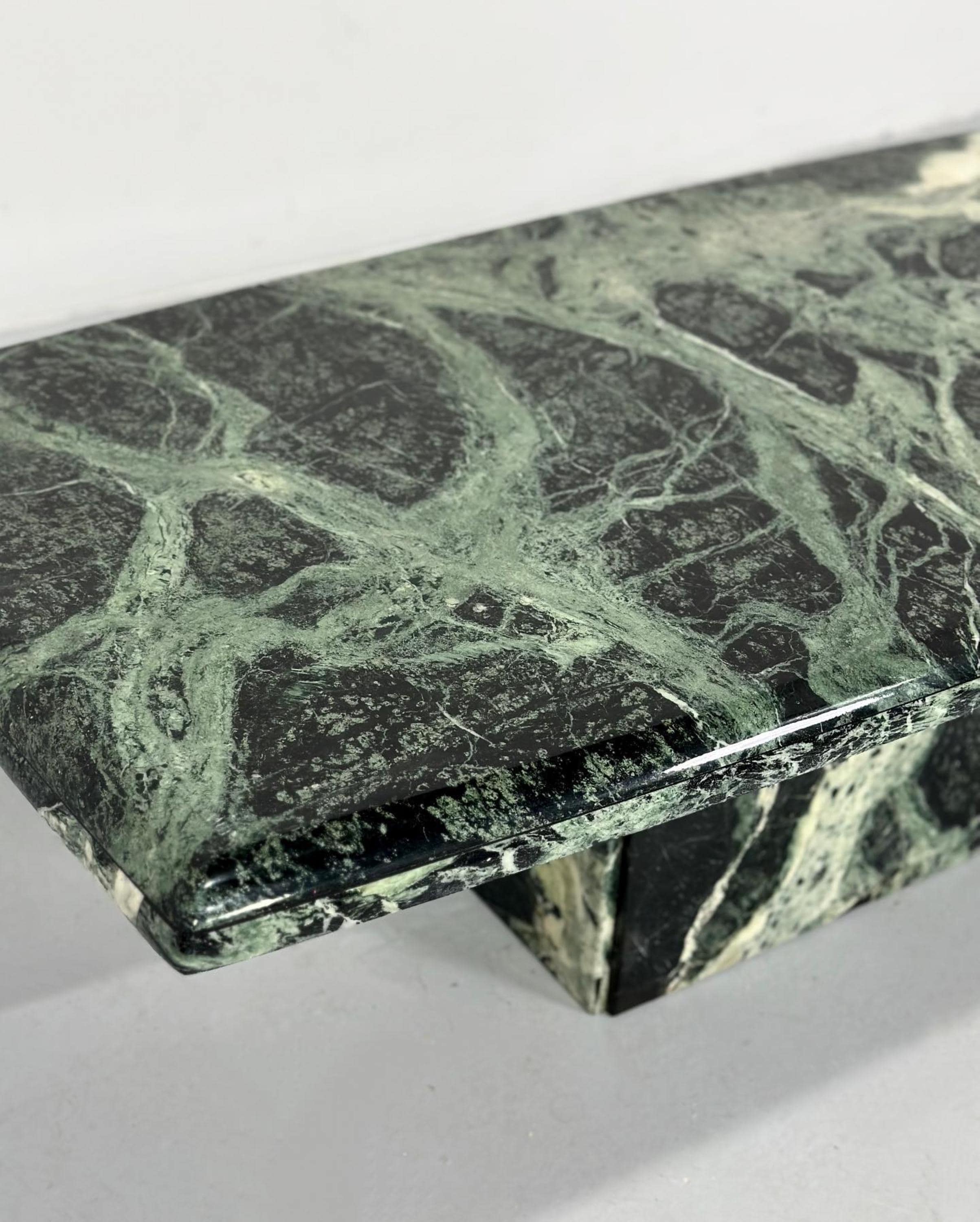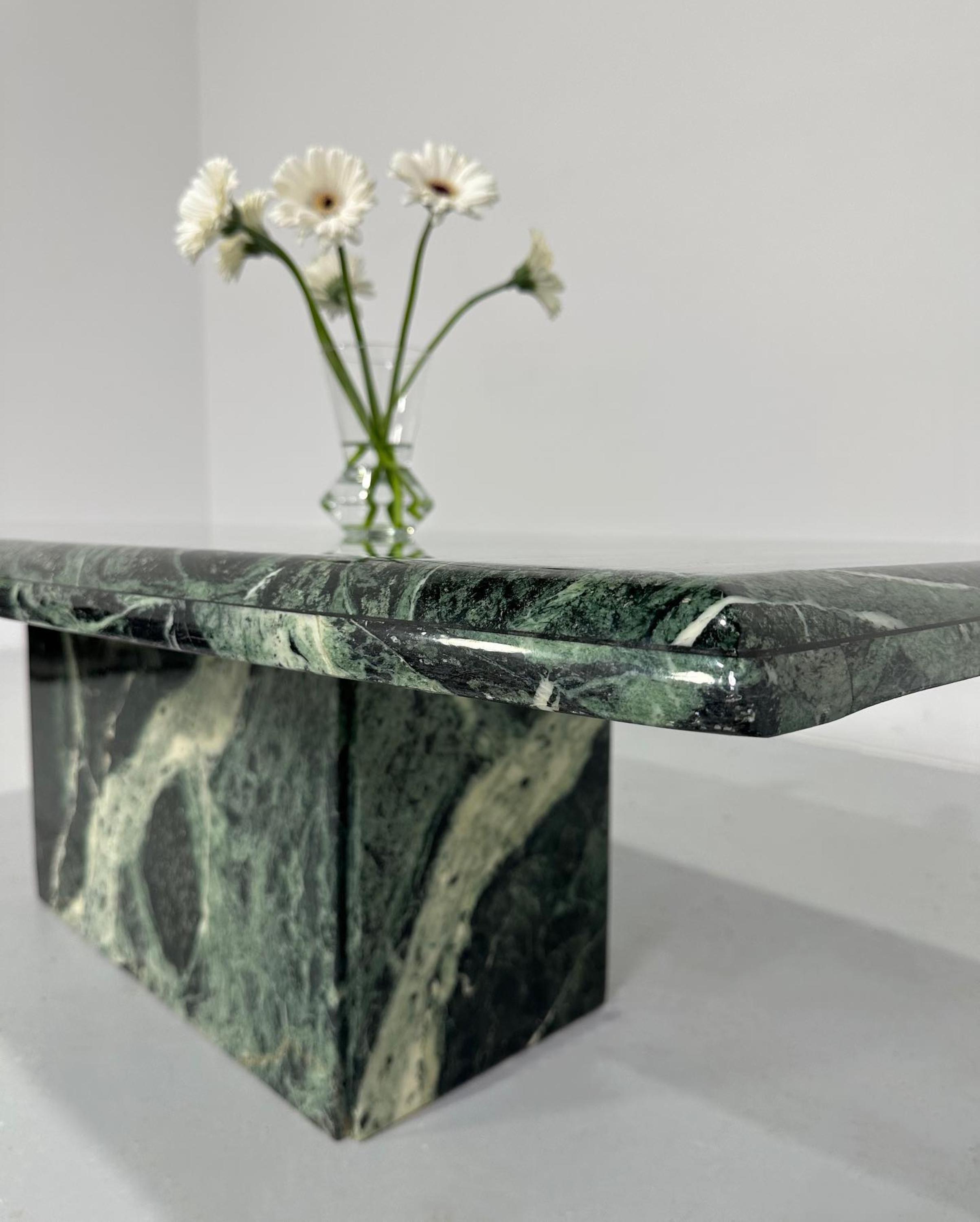 Each table is meticulously carved and polished by skilled artisans using premium-grade forest green marble, a stone celebrated for its mesmerizing blend of emerald tones, intricate white veining, and rich organic patterns. The result is a luxurious surface that reflects light beautifully while preserving the unique texture of natural stone.