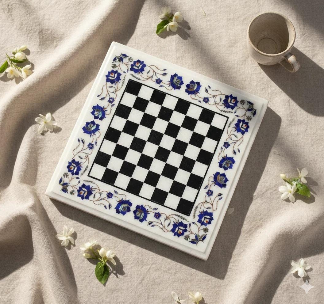 Experience the pinnacle of royal craftsmanship with this exquisite marble chessboard. Meticulously handcrafted, this piece features the traditional Pietra Dura technique, where semi-precious stones are precision-cut and inlaid into solid white marble.