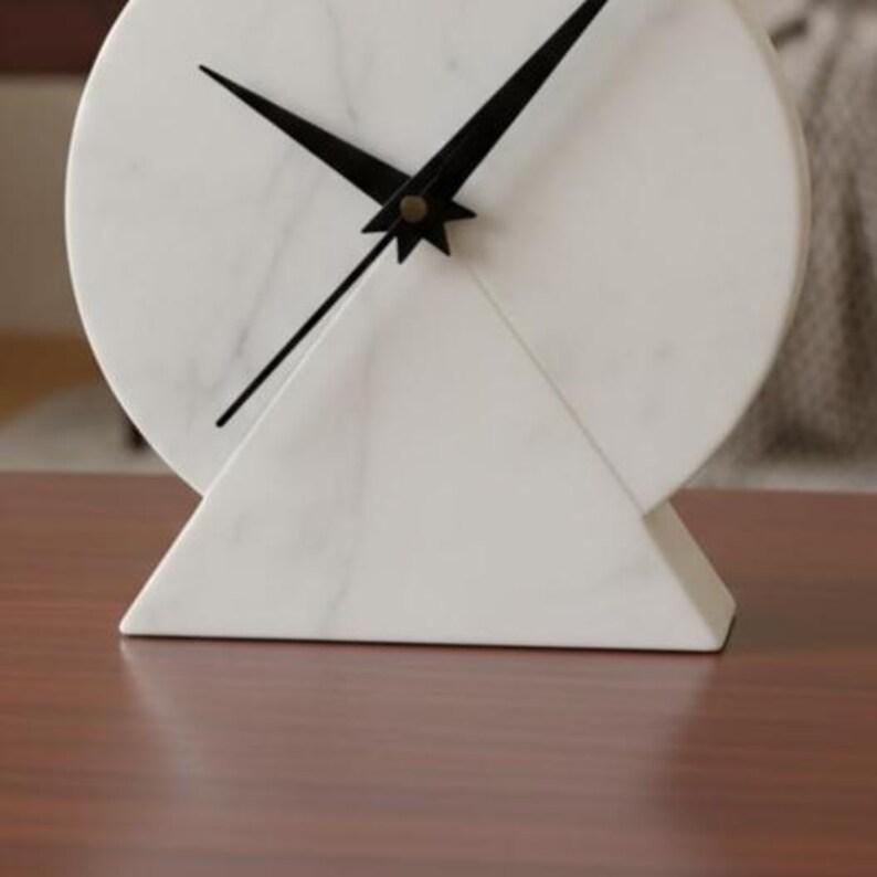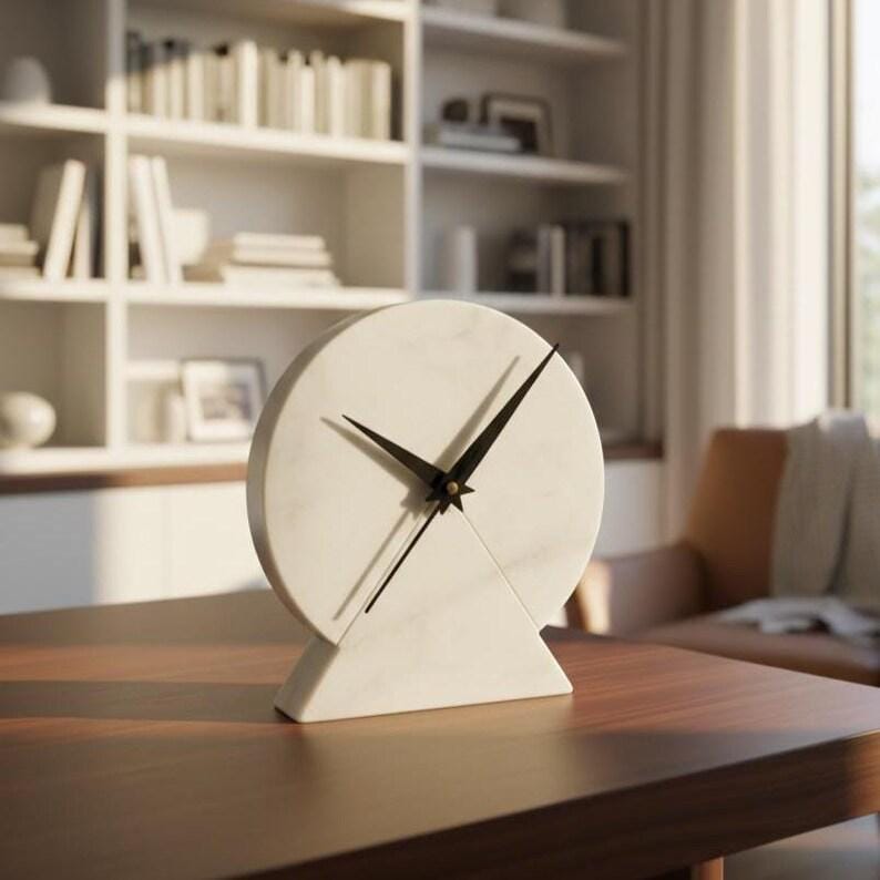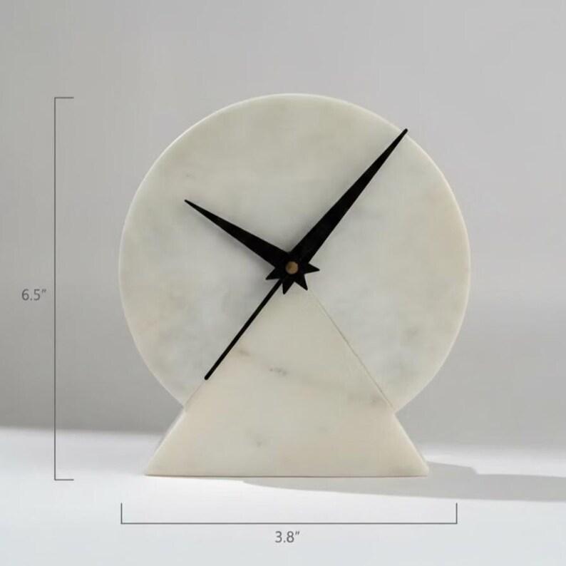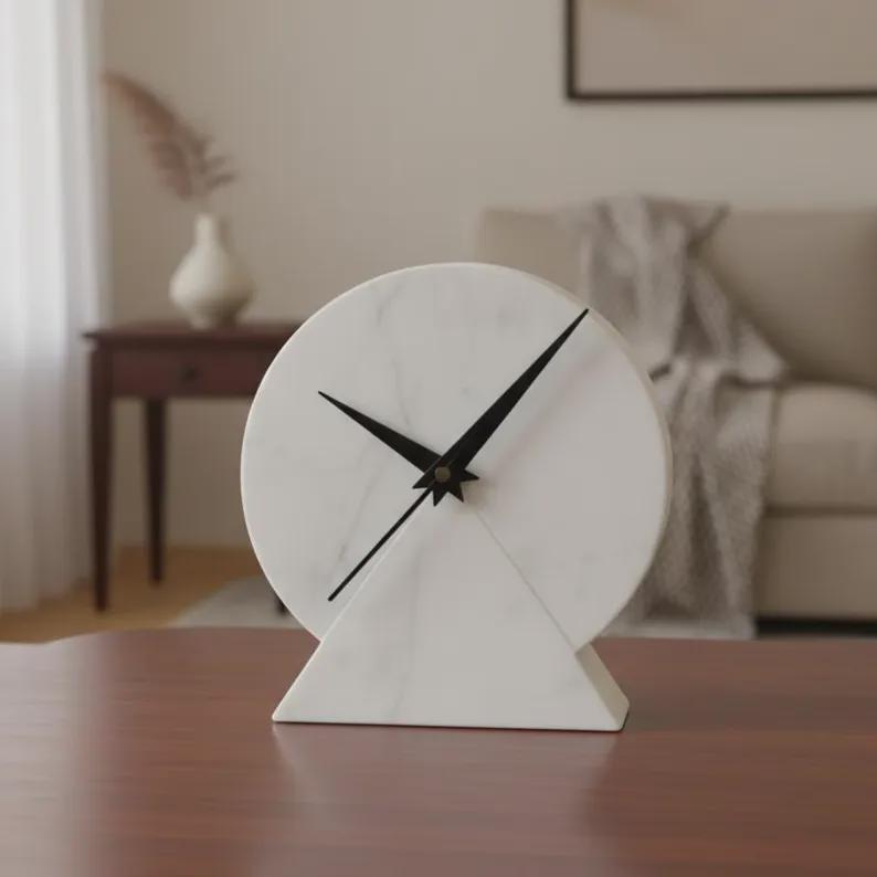 Elevate your space with this elegant modern marble desk clock, designed to blend simplicity with timeless sophistication. Crafted from smooth white stone with subtle natural veining, this round clock features bold black hands that create a striking contrast against the clean, minimalist face.