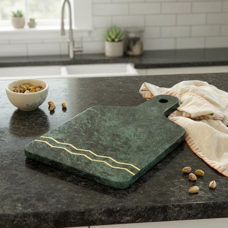 Elevate your kitchen and entertaining space with this stunning green marble cutting board featuring an elegant gold inlay design. Crafted from solid natural stone, this board combines timeless beauty with modern sophistication, making it both a functional kitchen essential and a statement décor piece.