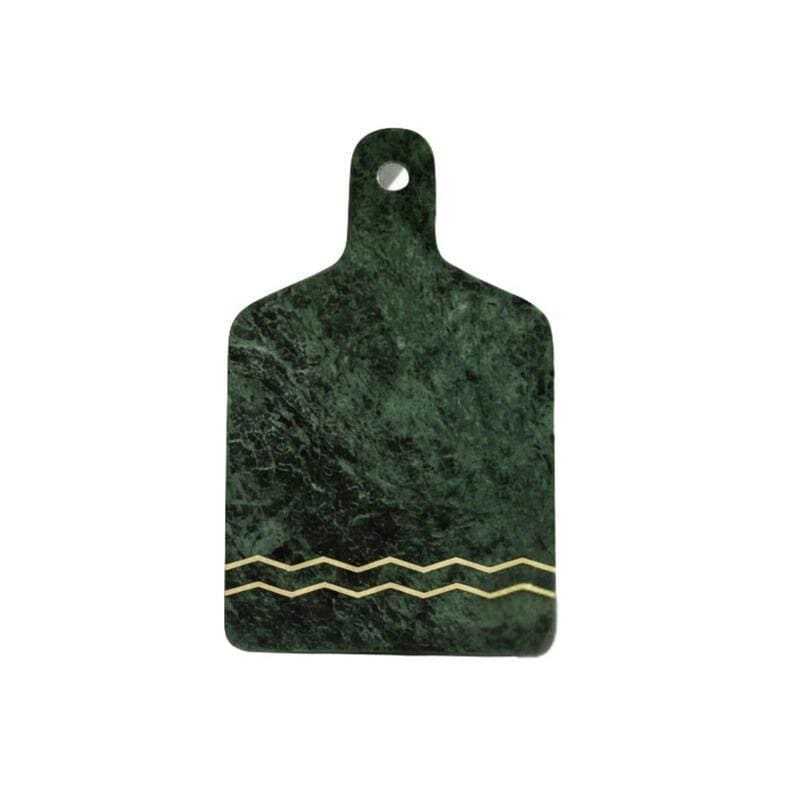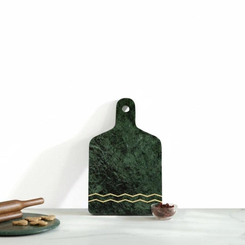 The rich green marble showcases unique natural veining, ensuring that every piece is one of a kind. The sleek gold inlay detail adds a refined, contemporary touch that beautifully contrasts against the deep stone tones. Whether used for food prep, serving charcuterie, or styling your countertop, this board effortlessly enhances any space.