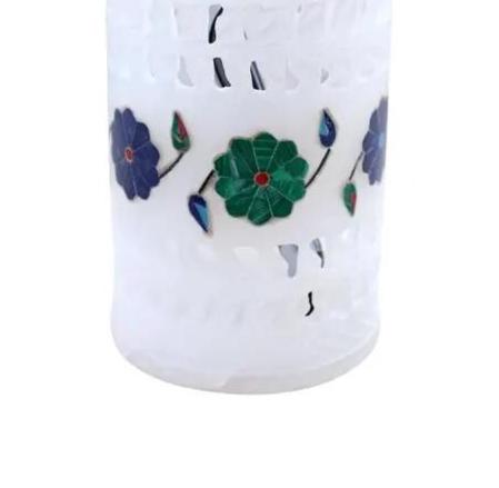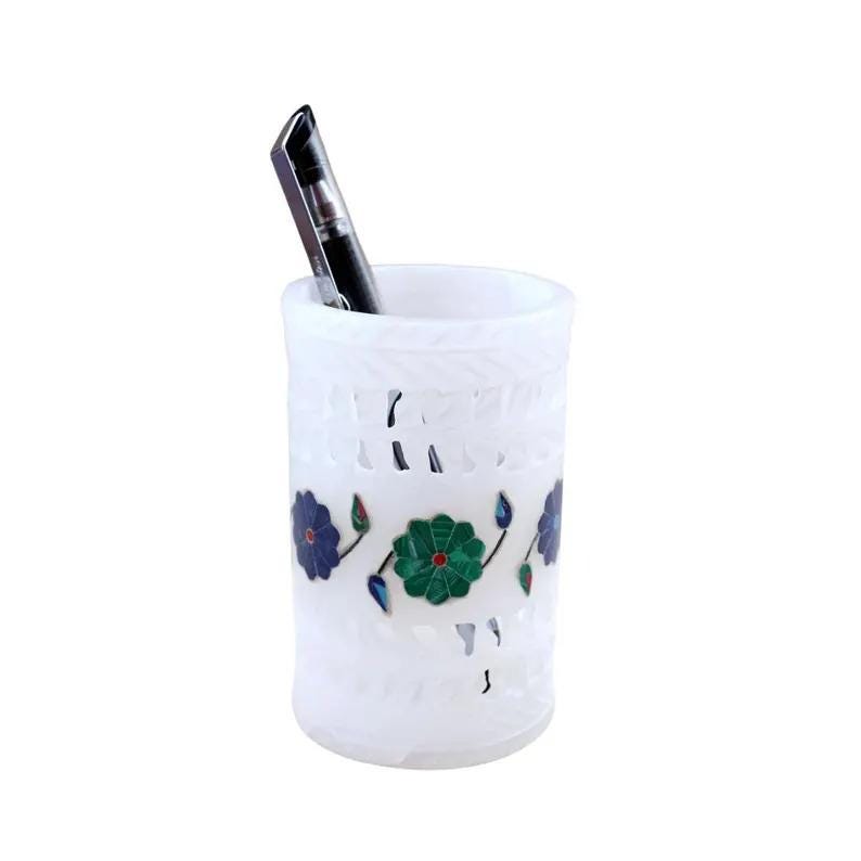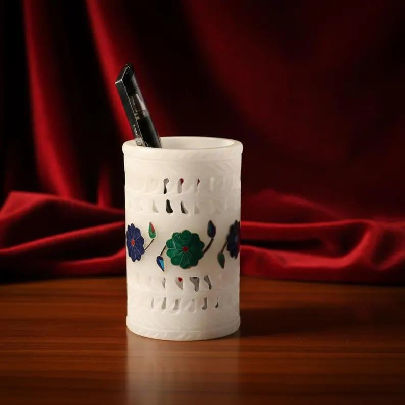 Add timeless elegance to your workspace with this beautifully handcrafted white marble pen holder featuring intricate floral inlay detailing. Carefully carved from solid natural marble, this decorative desk organizer showcases delicate openwork patterns and vibrant stone inlay flowers in rich green, blue, and red tones.