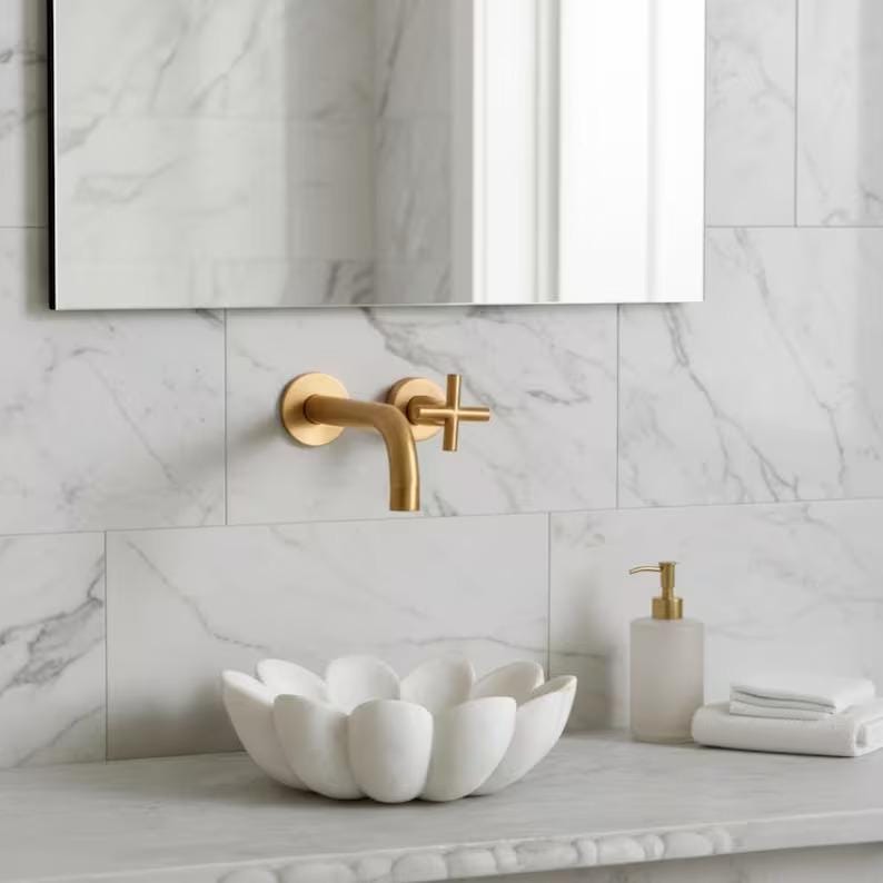 Pairs beautifully with brushed gold or matte black wall-mounted faucets