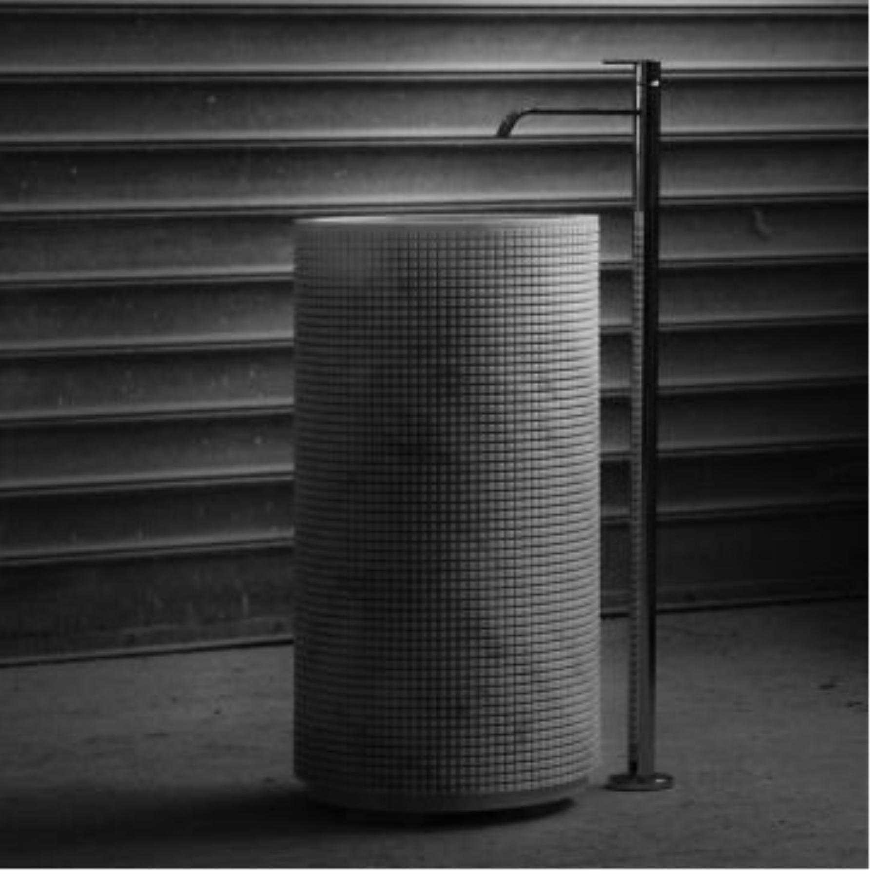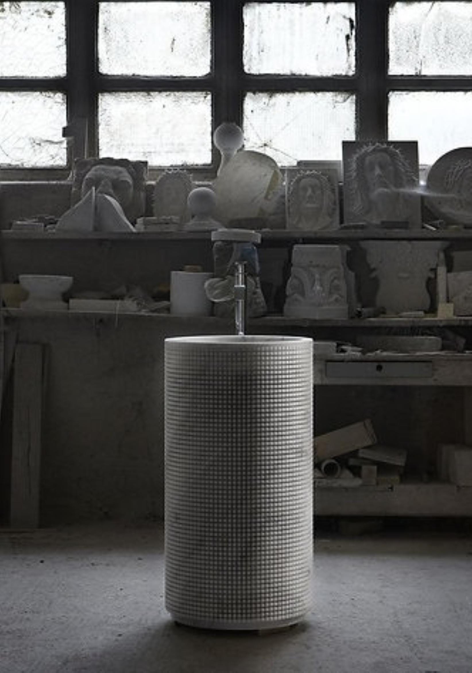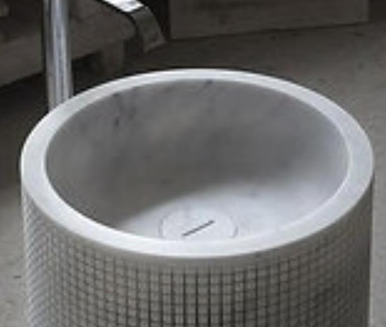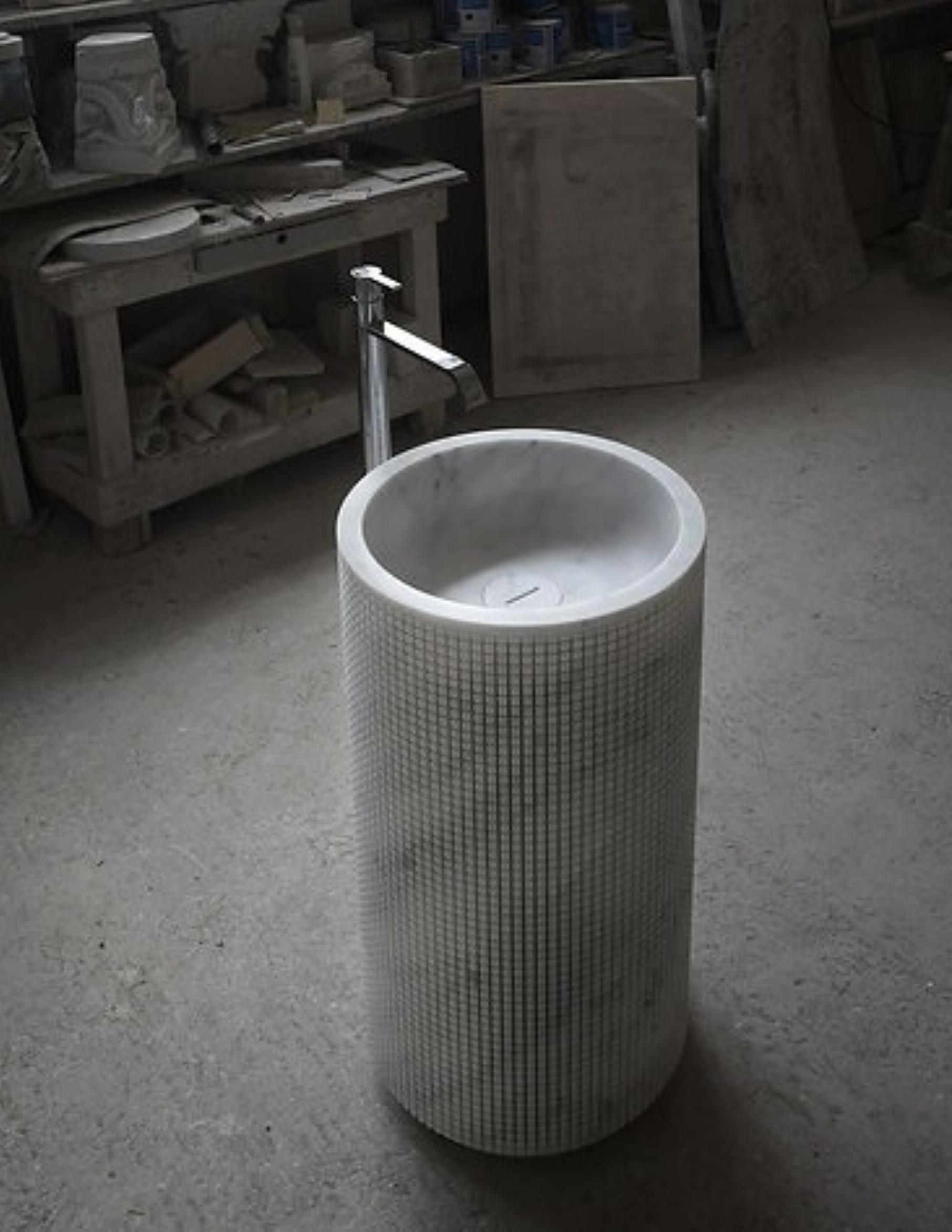 The cylindrical pedestal form is wrapped in a meticulously carved pixel pattern, creating a subtle play of light and shadow across the natural marble surface. The result is a tactile, visually dynamic piece that transforms any bathroom into a modern sanctuary.