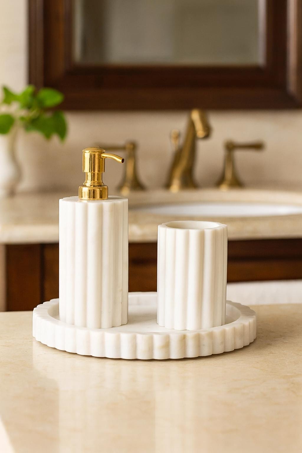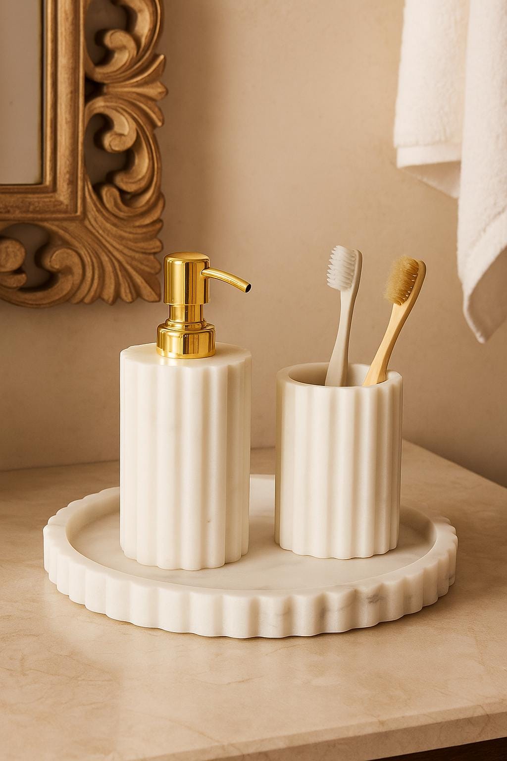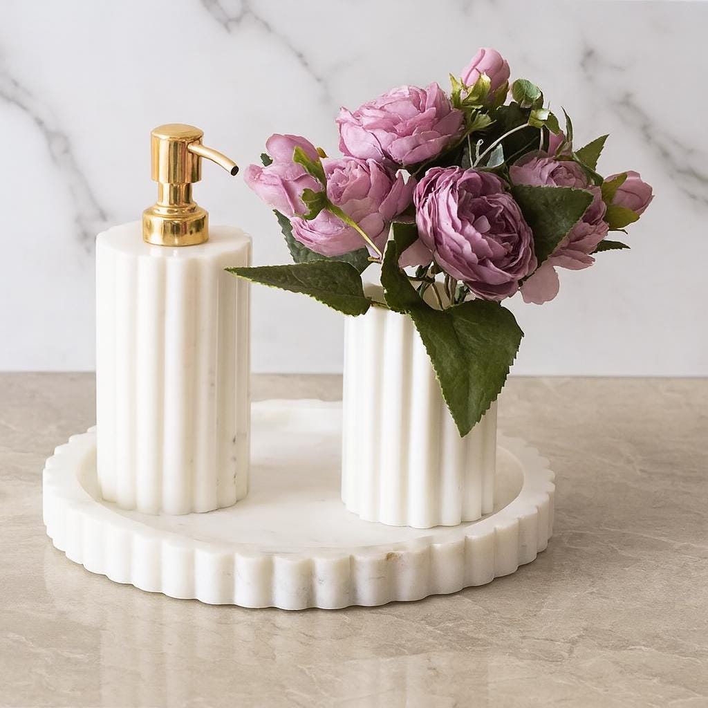 Bring timeless elegance to your bathroom or vanity with this handcrafted White Marble Bathroom Accessory Set, beautifully designed to elevate your daily rituals. The set features a fluted soap dispenser with a gold pump, a matching tumbler, and a round scalloped-edge marble tray, creating a perfect harmony of luxury and simplicity.