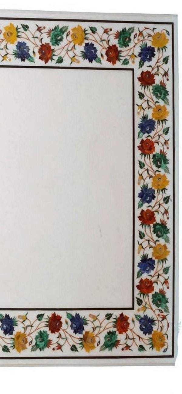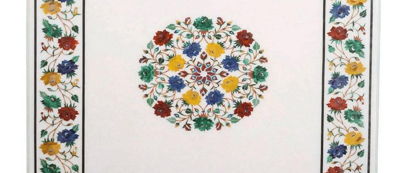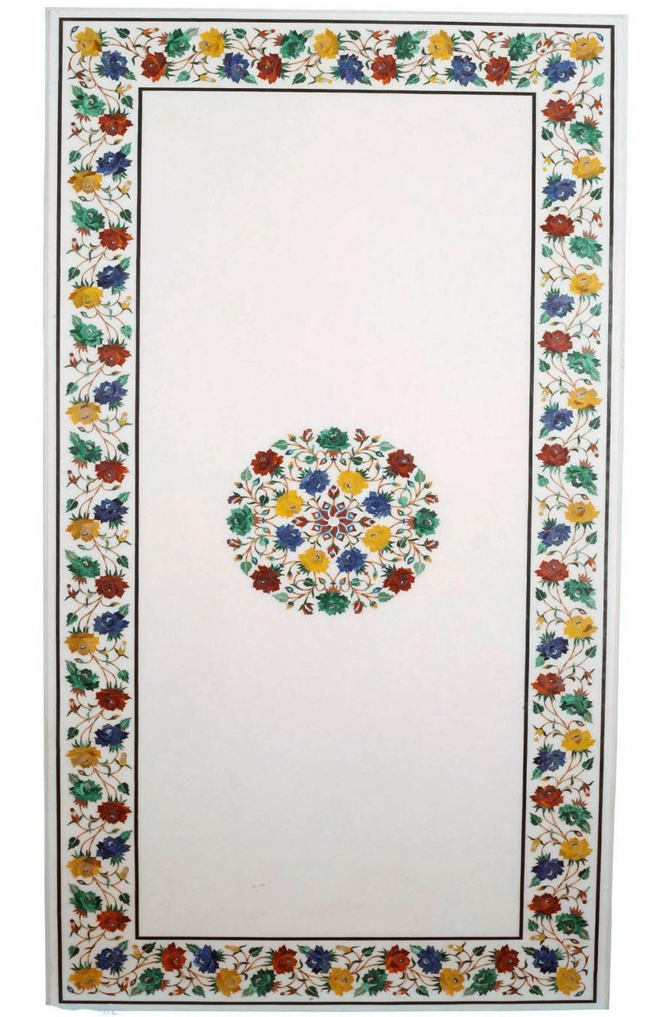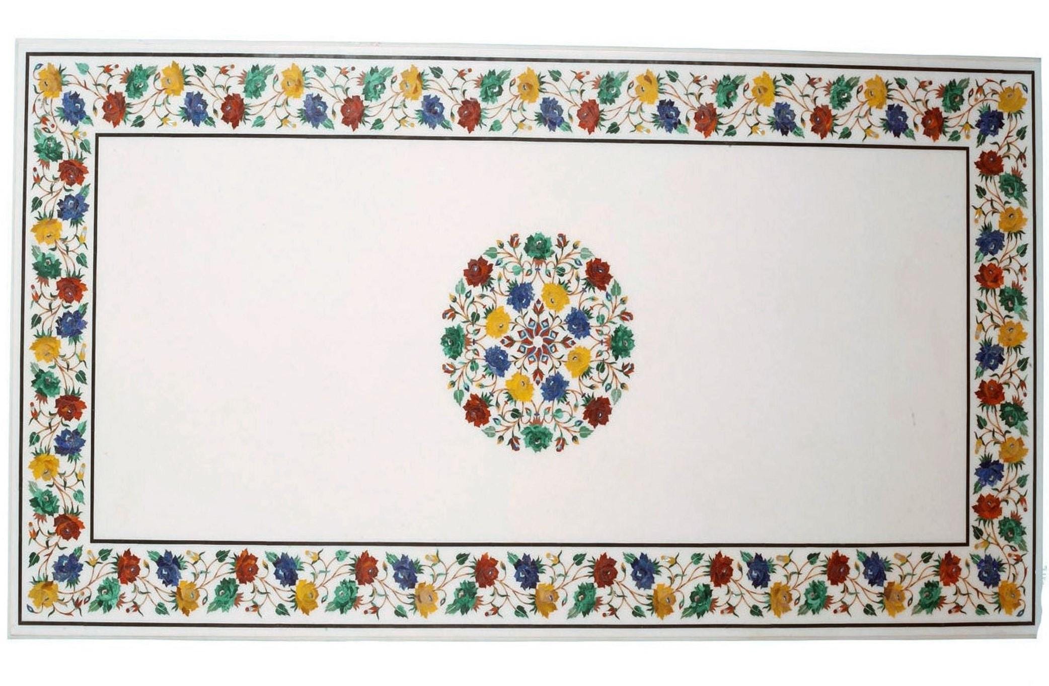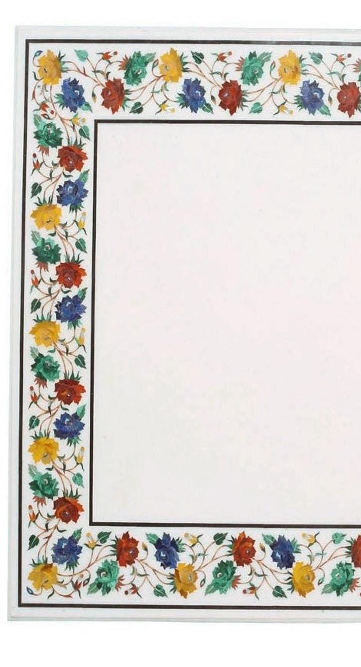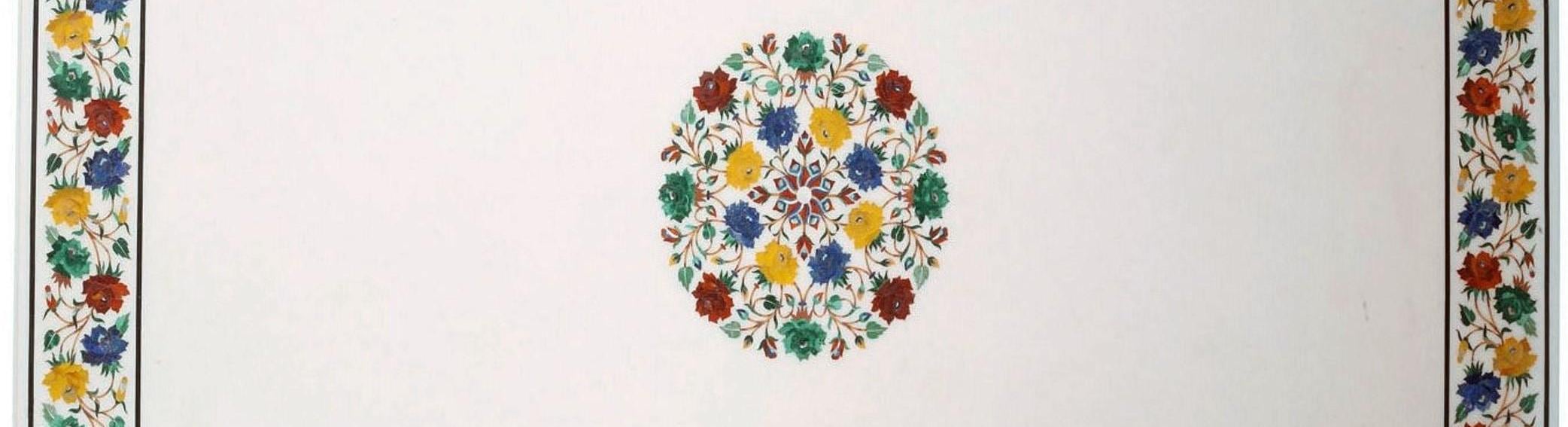 Enhance your home with this elegant handmade marble inlay table top, crafted from premium white marble and decorated with a vibrant floral border and intricate central medallion. This design beautifully blends traditional craftsmanship with timeless luxury.