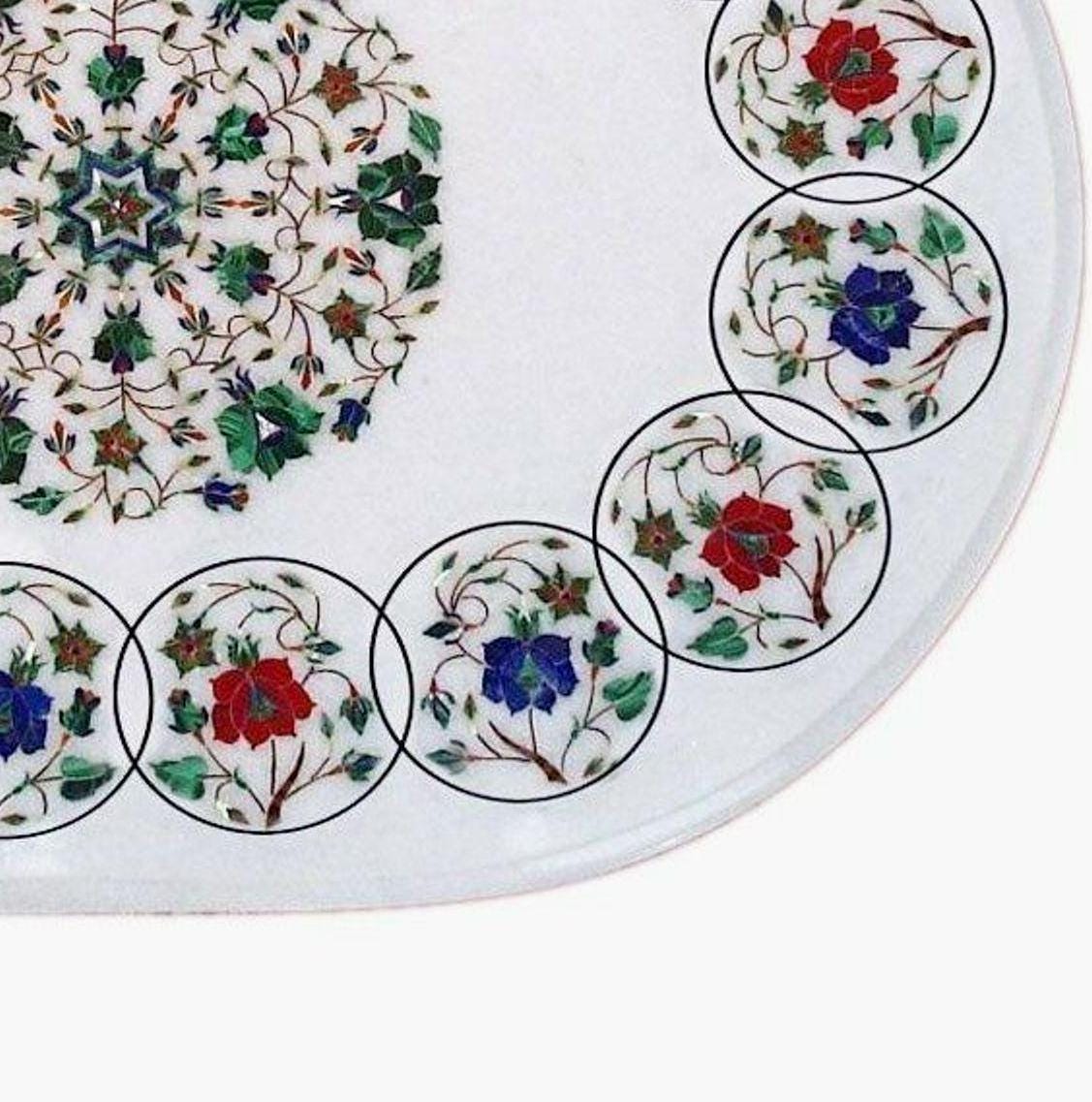 Enhance your space with this elegant oval marble inlay table top, handcrafted from premium white marble and decorated with vibrant semi-precious stone inlay. The design showcases a stunning central floral mandala medallion, surrounded by a unique circular floral border that creates a balanced and luxurious appearance.