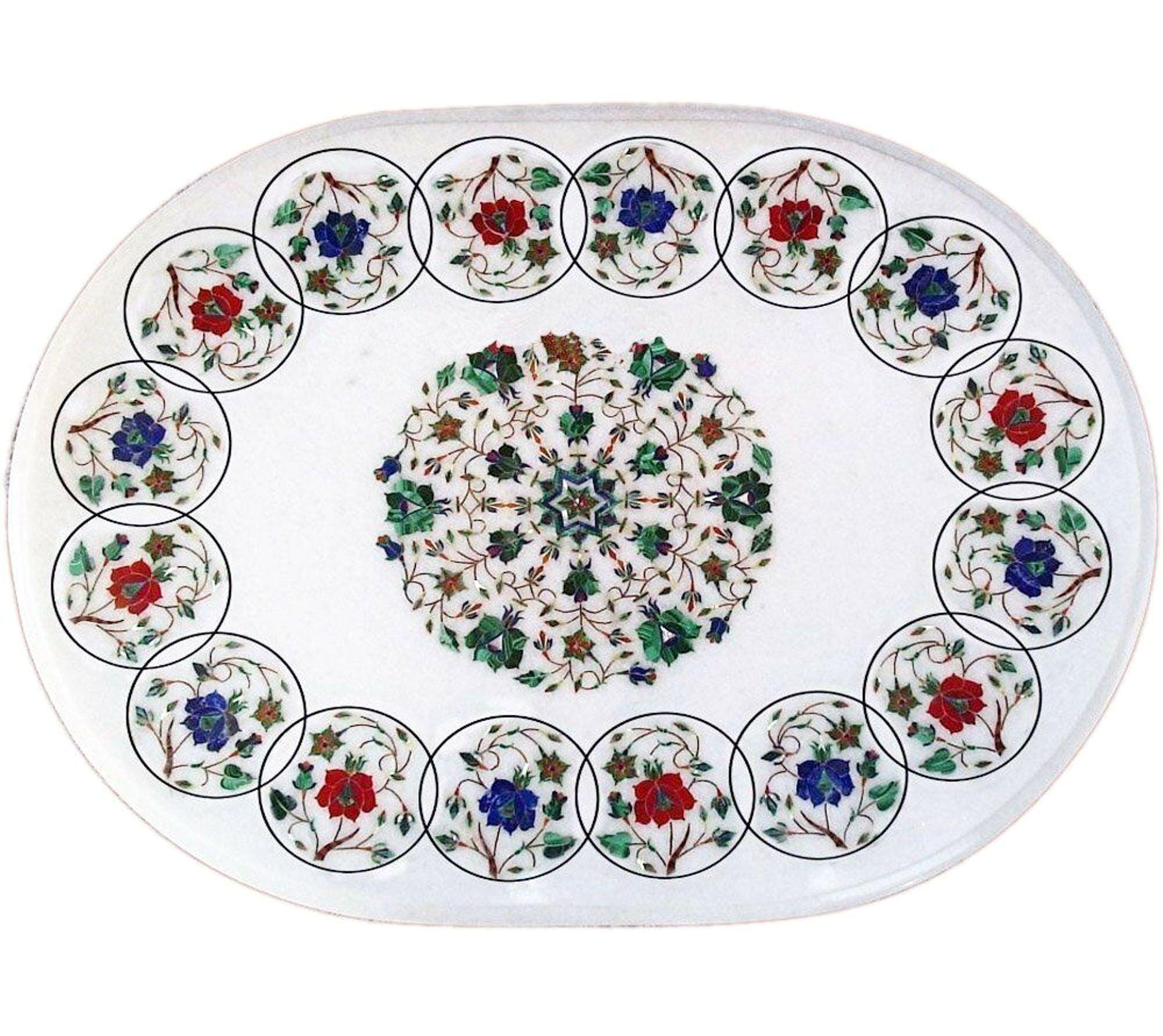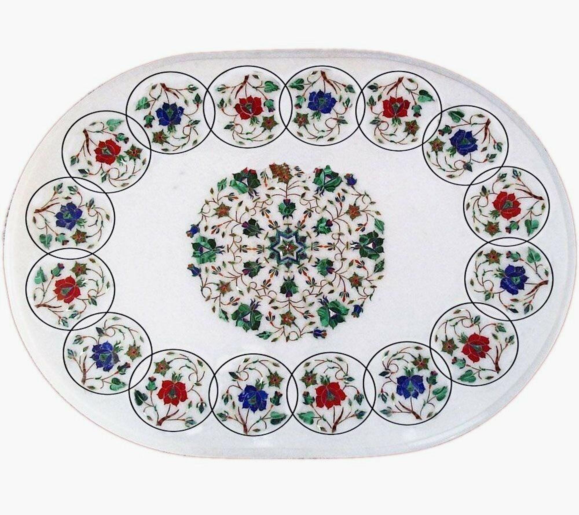 Oval Marble Table Top: Semiprecious Stone Inlay, Handmade Pietra Dura Art