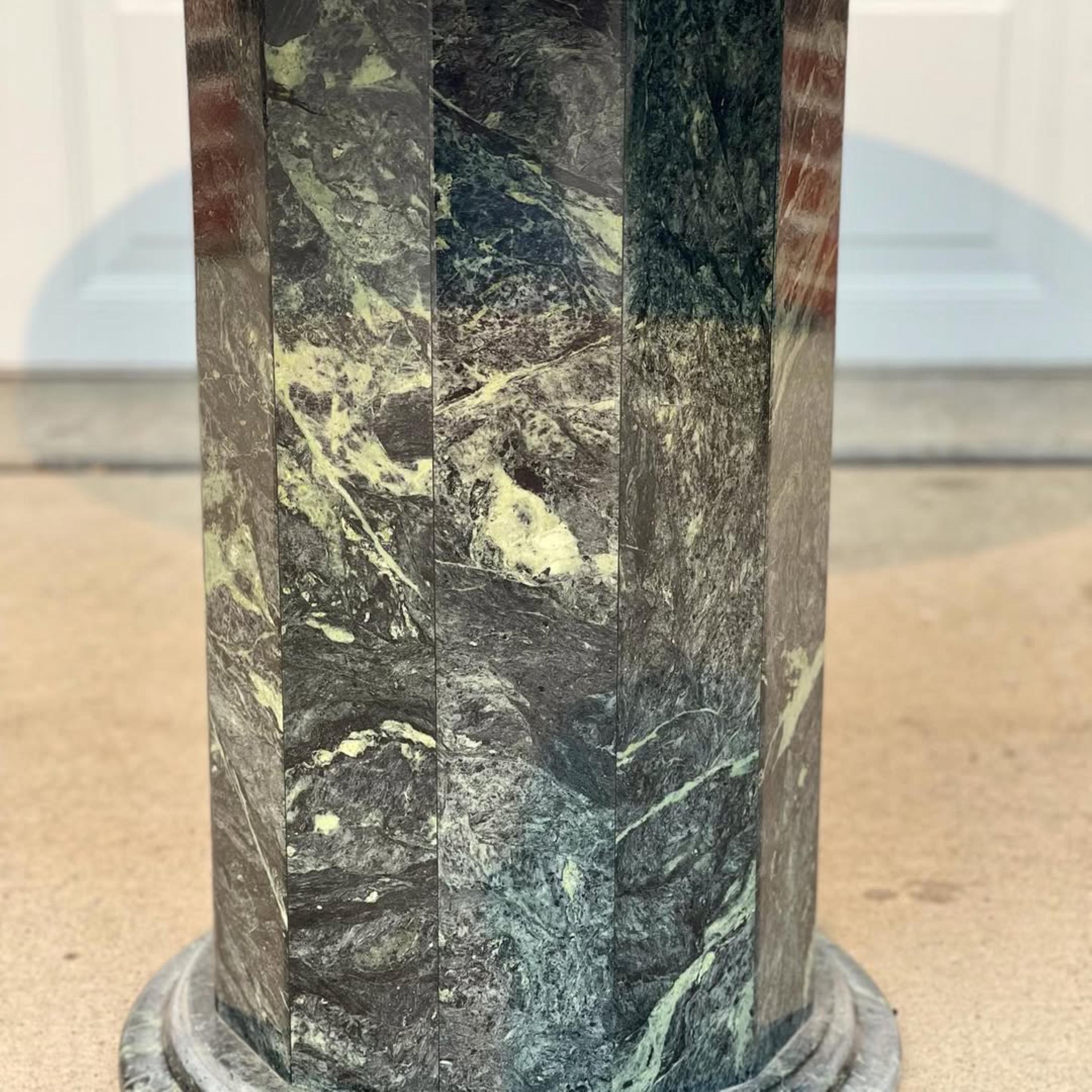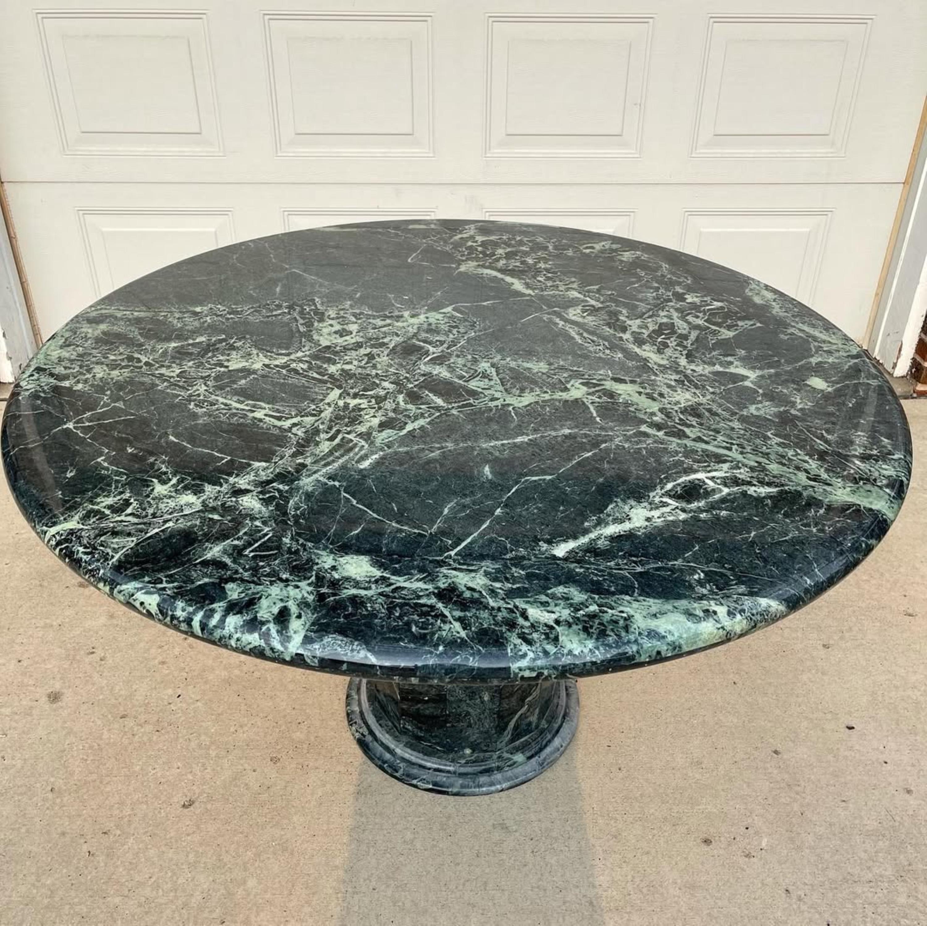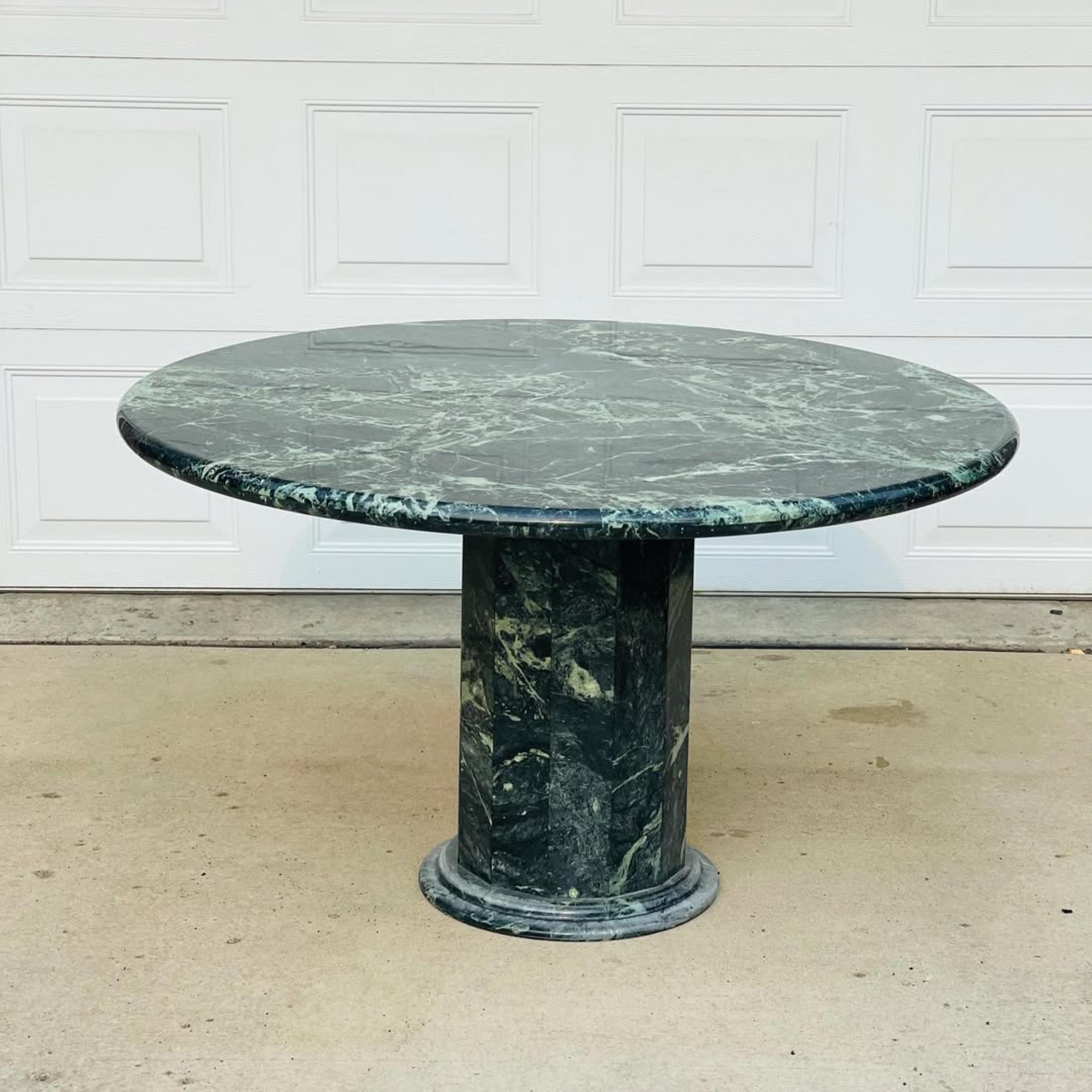 Infuse your space with timeless beauty and sophistication with this Handcrafted Green Marble Pedestal Table. Made from 100% genuine forest green marble, this exquisite piece combines natural artistry with modern luxury. The table features a smooth round top resting on a bold sculptural pedestal base, creating an elegant focal point that enhances both contemporary and classic interiors.