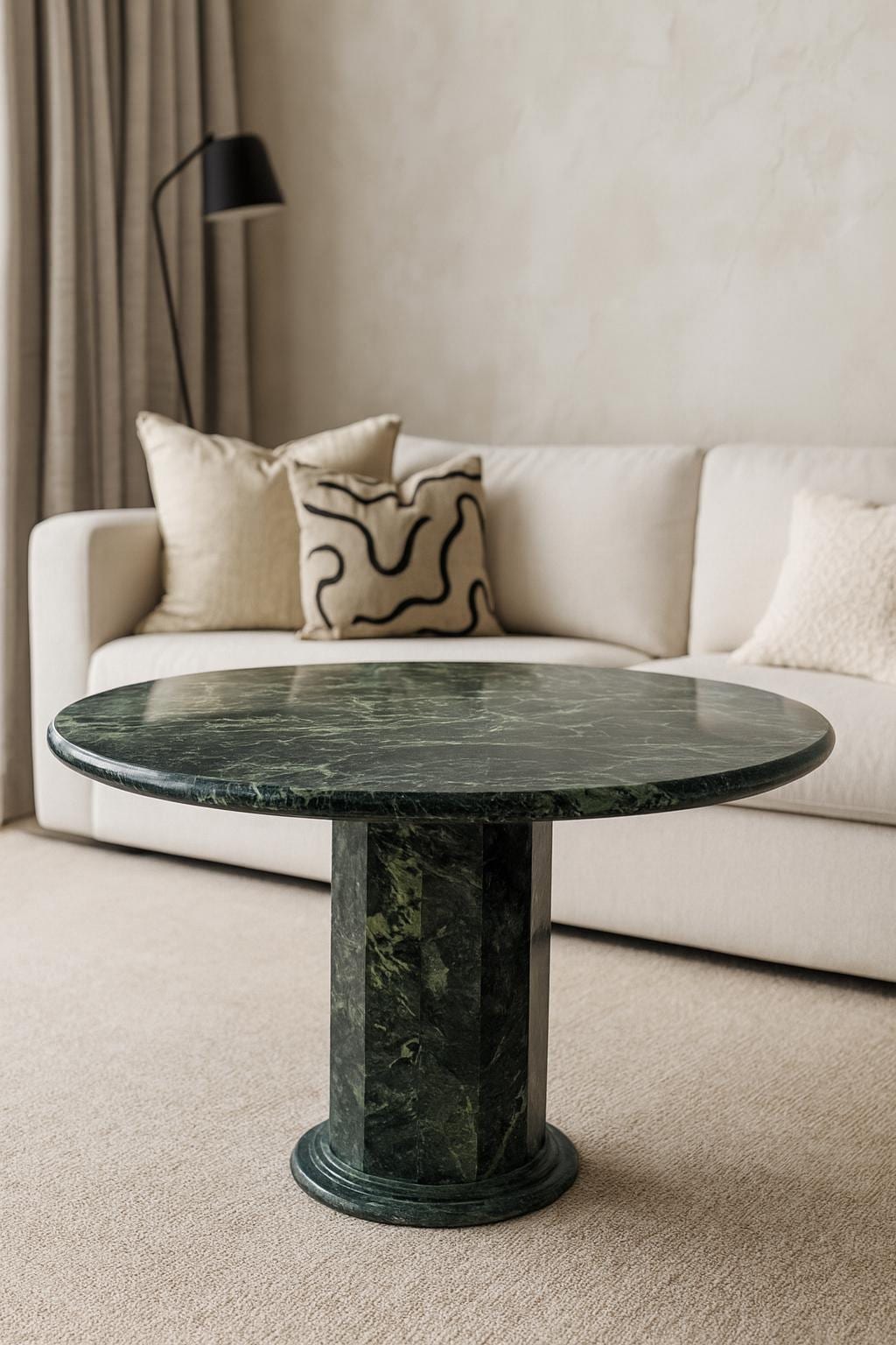 Each table is individually hand-polished by skilled artisans, highlighting the marble’s unique veining and deep green tones—ensuring that every piece is one-of-a-kind. Its glossy finish adds a luxurious touch, making it ideal for use as a coffee table, side table, or statement accent piece in living rooms, lounges, or dining areas.