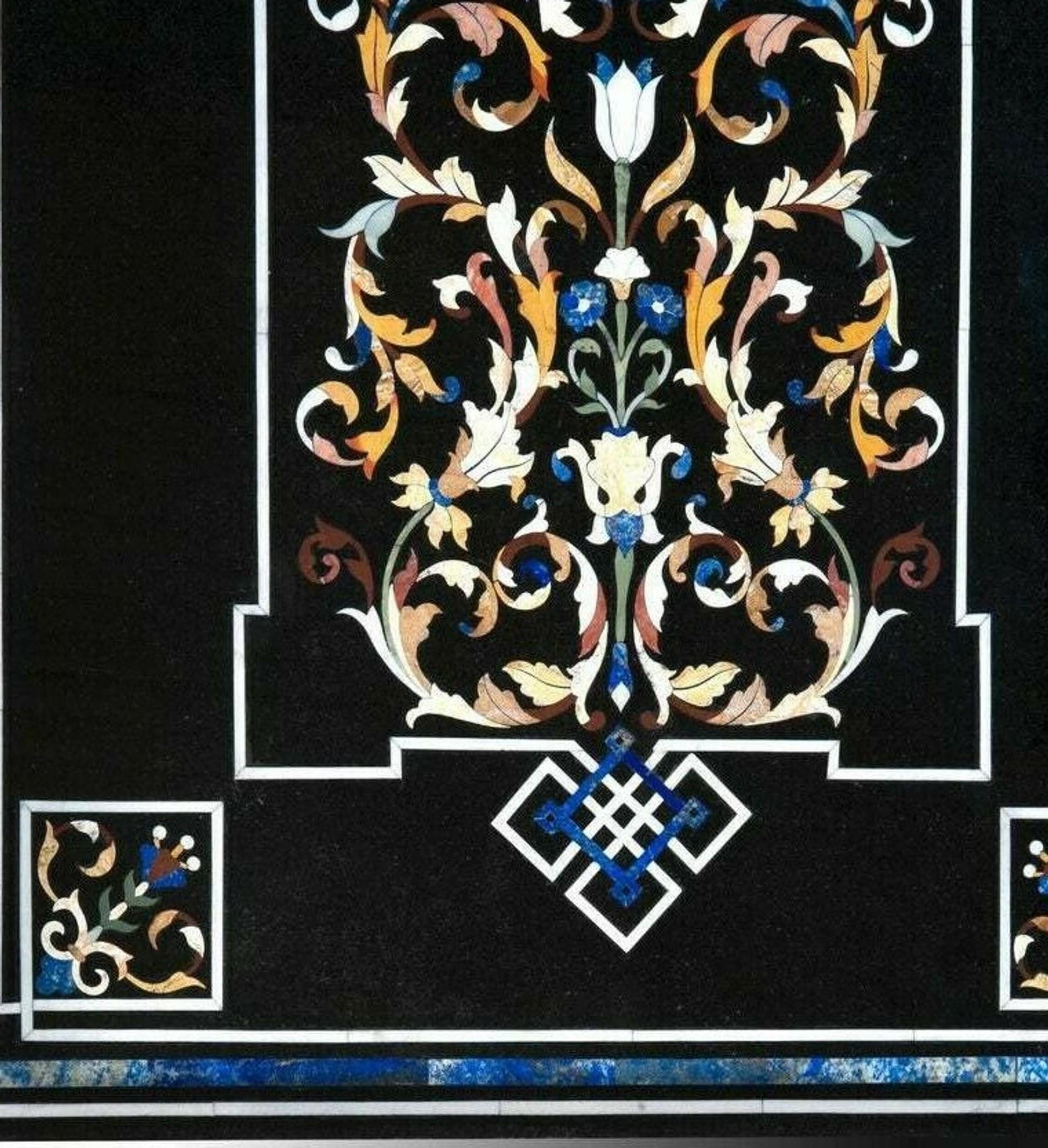 The dramatic black background enhances the vibrant colors of the inlaid stones, allowing the scrolling floral composition to stand out with depth and elegance. The symmetrical layout creates balance, making it ideal as:
