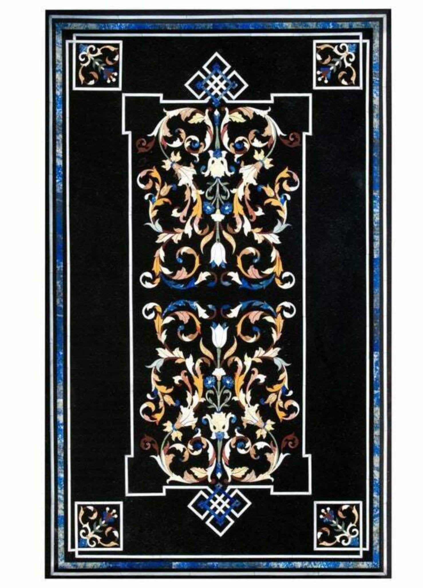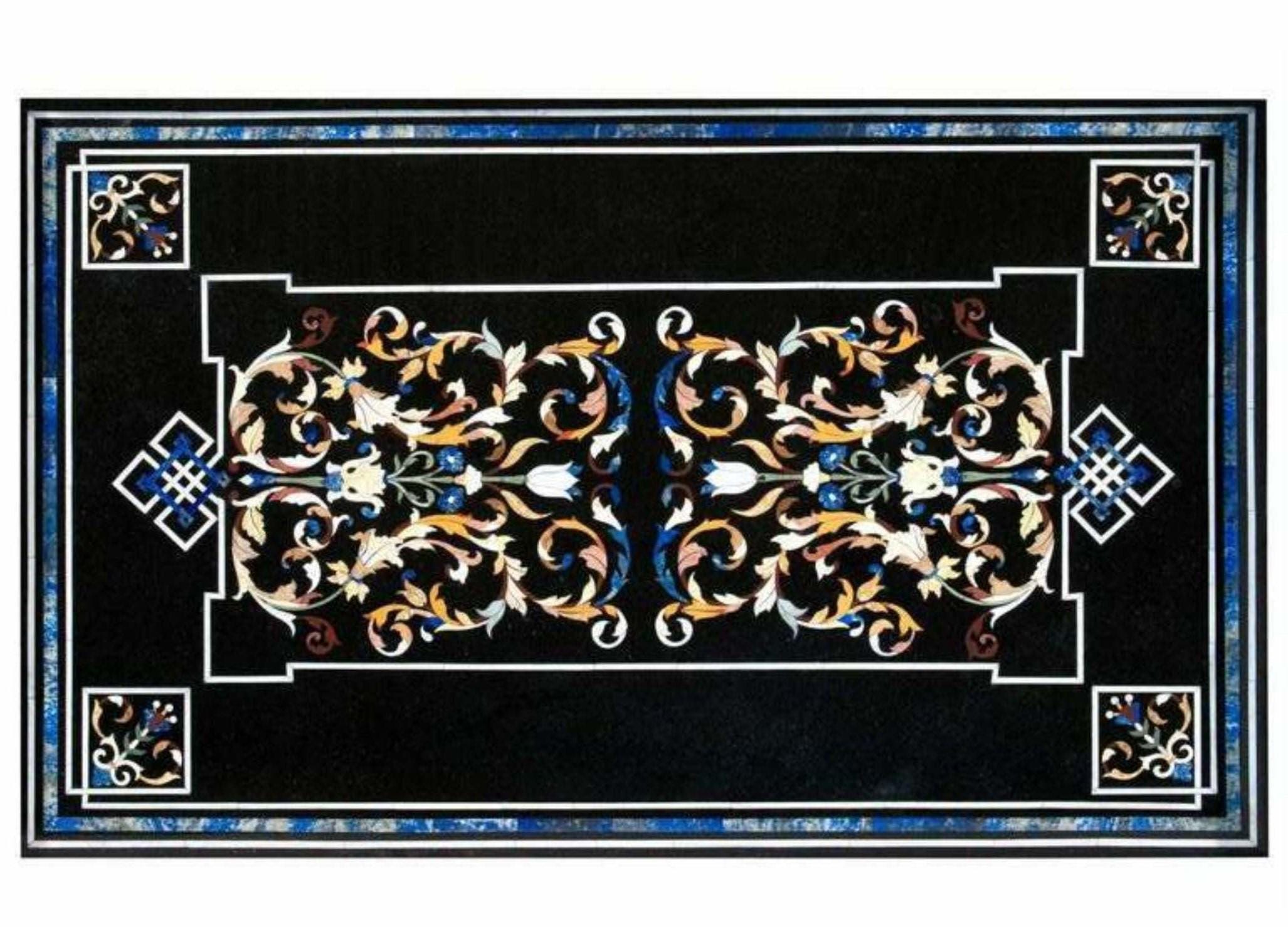 This exquisite black marble inlay table top is a handcrafted work of art inspired by traditional Pietra Dura craftsmanship. Set against a deep black marble background, the intricate floral scrollwork and geometric borders are meticulously inlaid with vibrant semi-precious stones, creating a bold and luxurious statement piece.