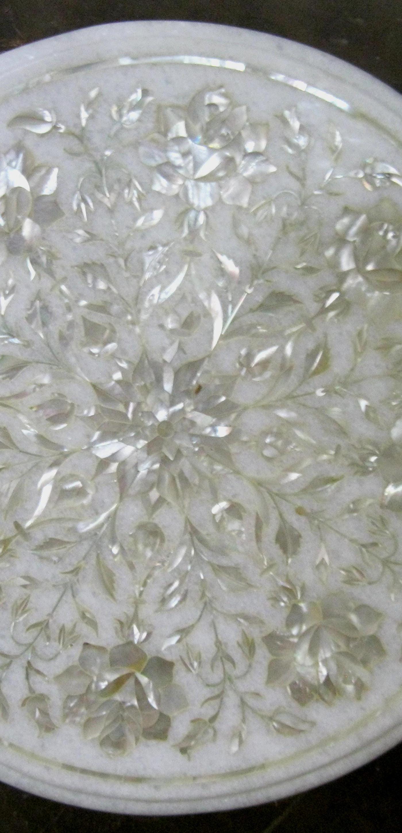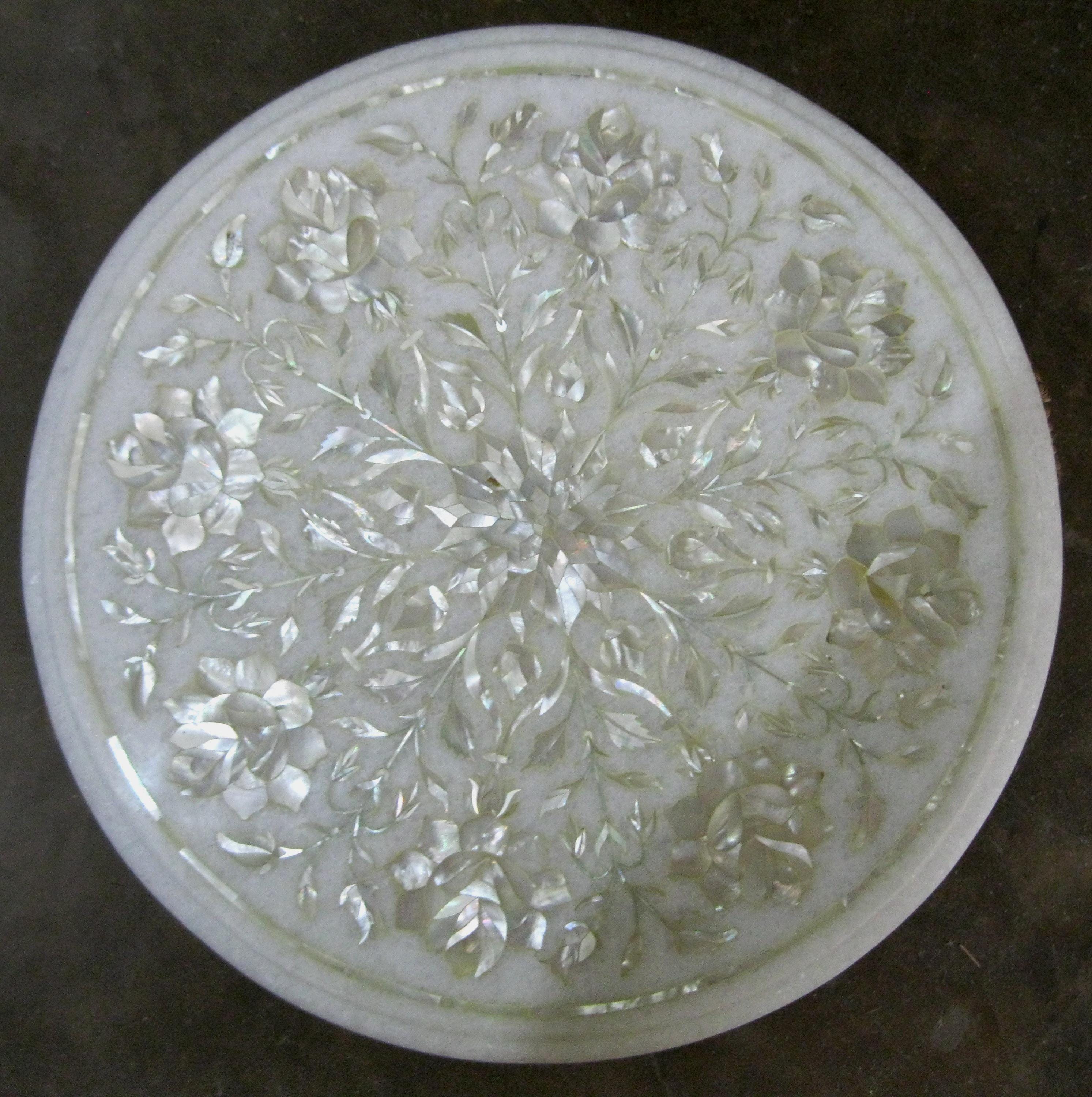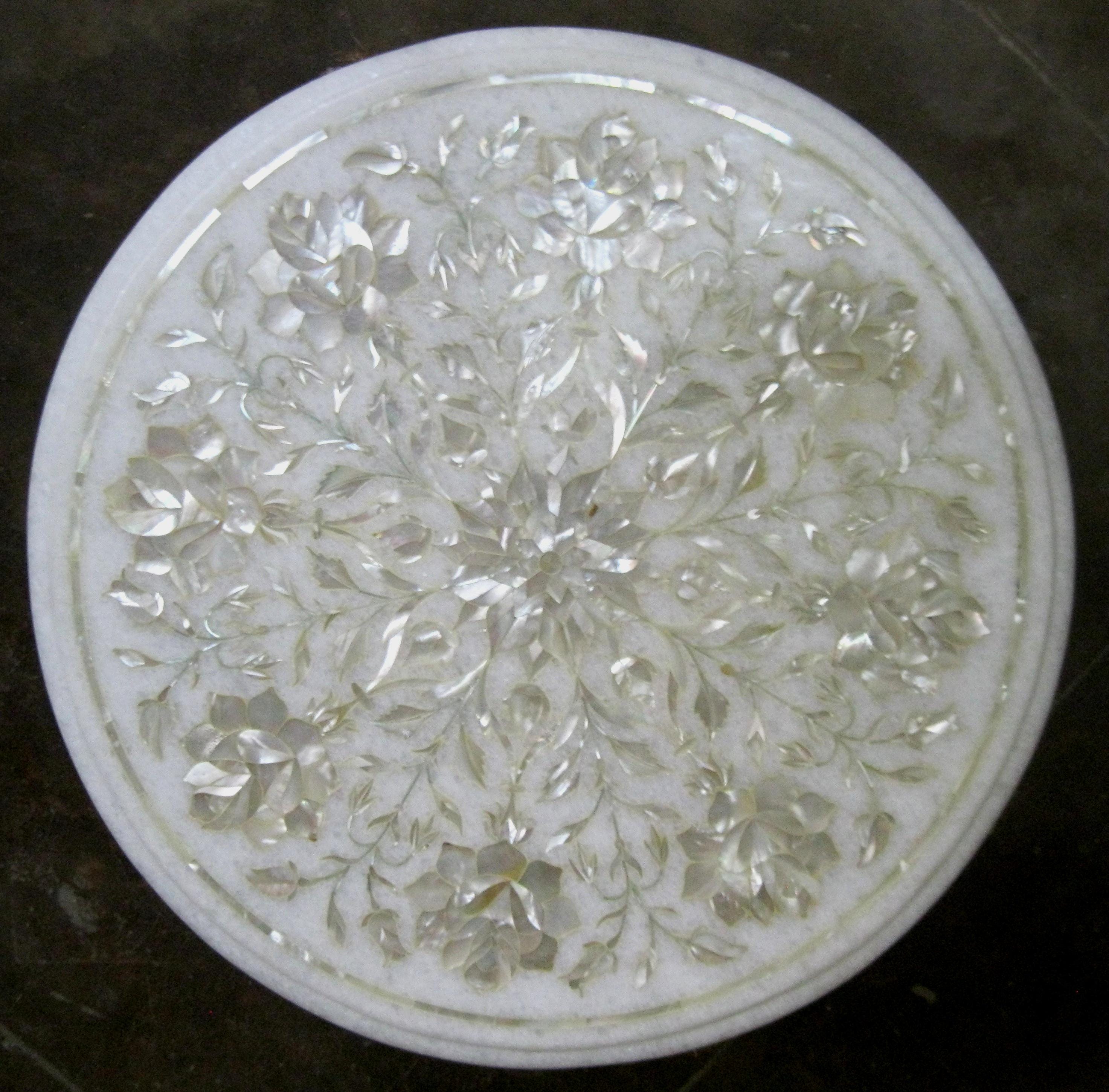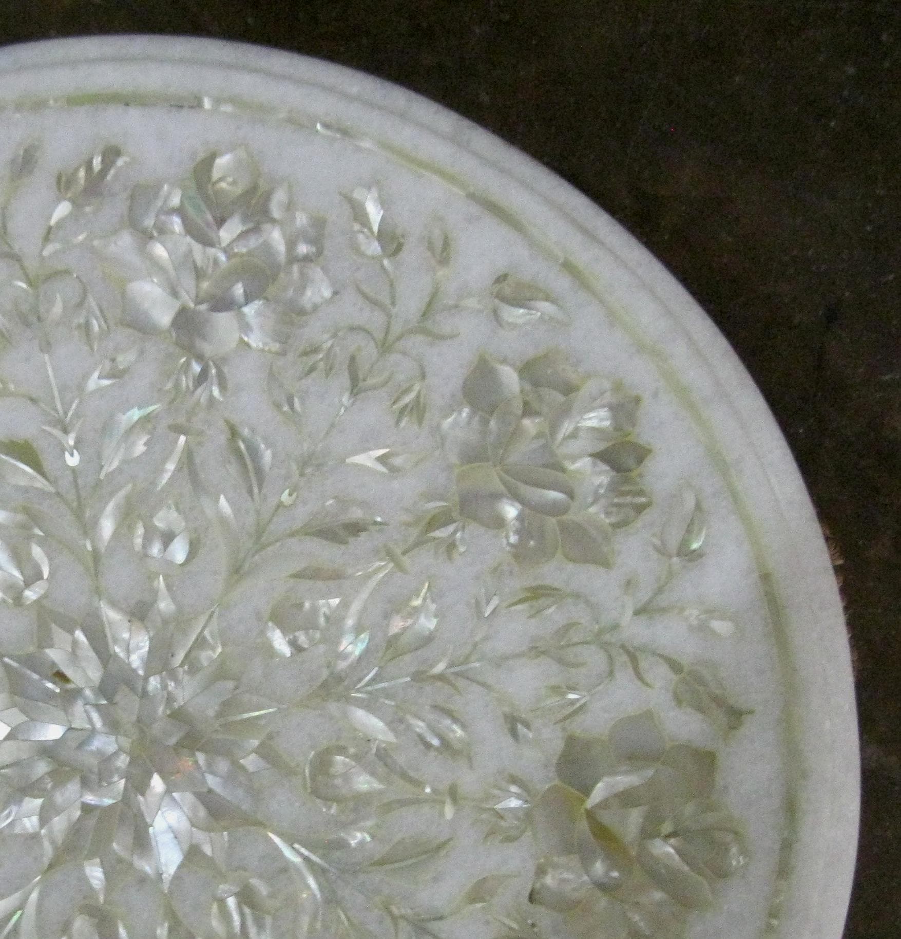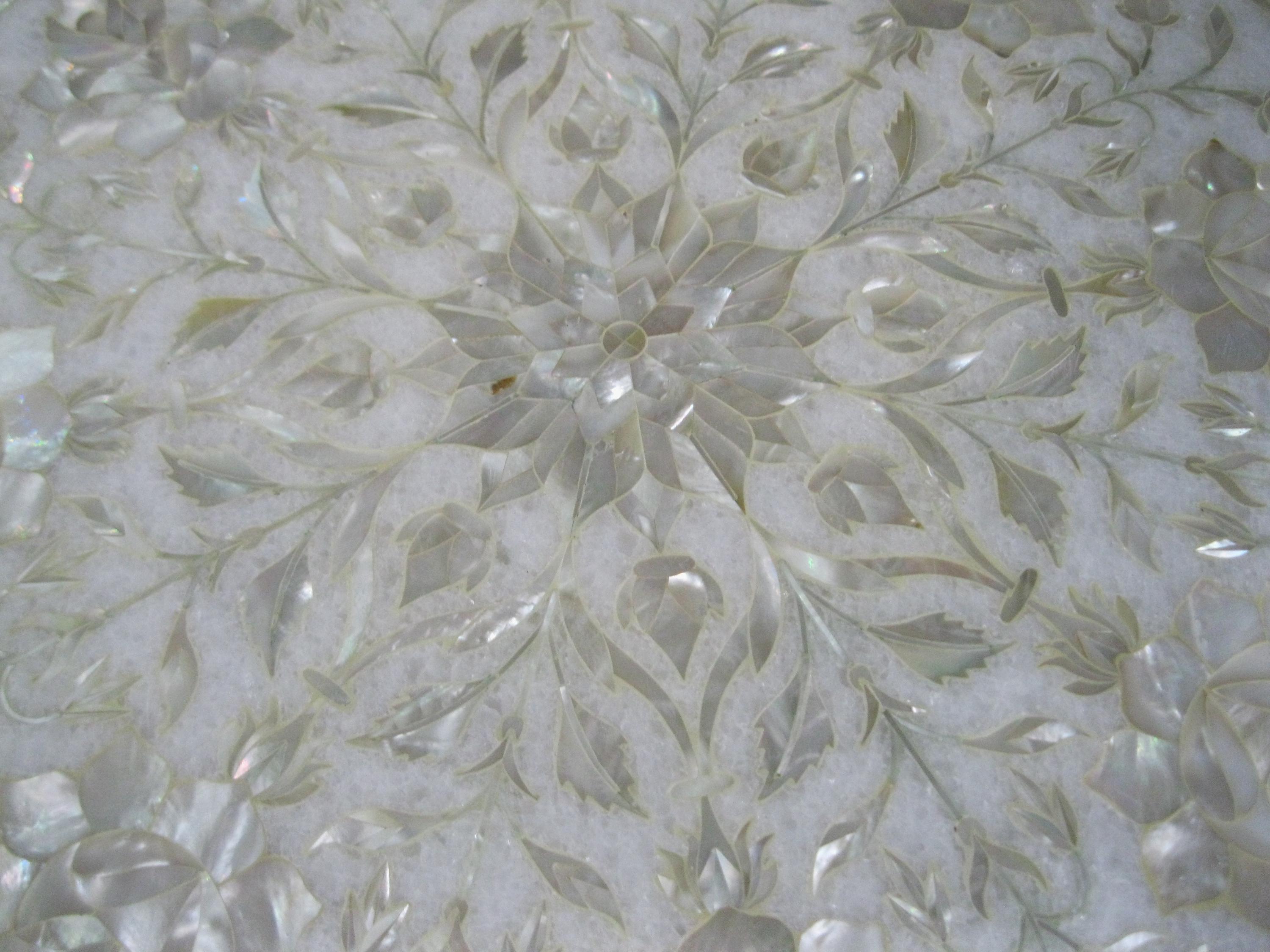 Handmade White Marble Round Table Top with Mother of Pearl Floral Inlay