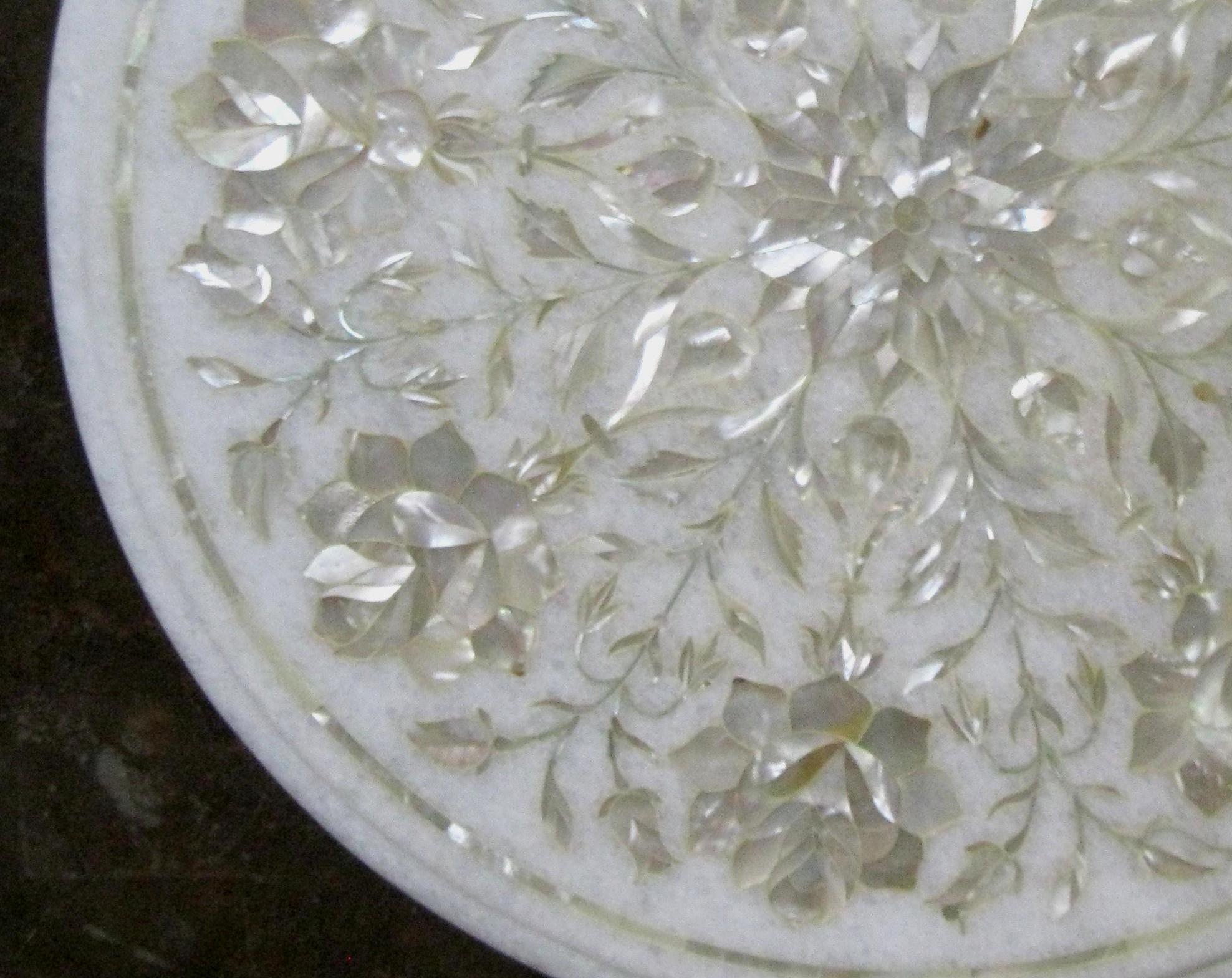 This exquisite round white marble table top features delicate floral inlay crafted from shimmering Mother of Pearl, creating an elegant and timeless statement piece. Handcrafted using traditional Pietra Dura techniques, each shell fragment is individually shaped and hand-set into fine white marble to form a symmetrical botanical composition.