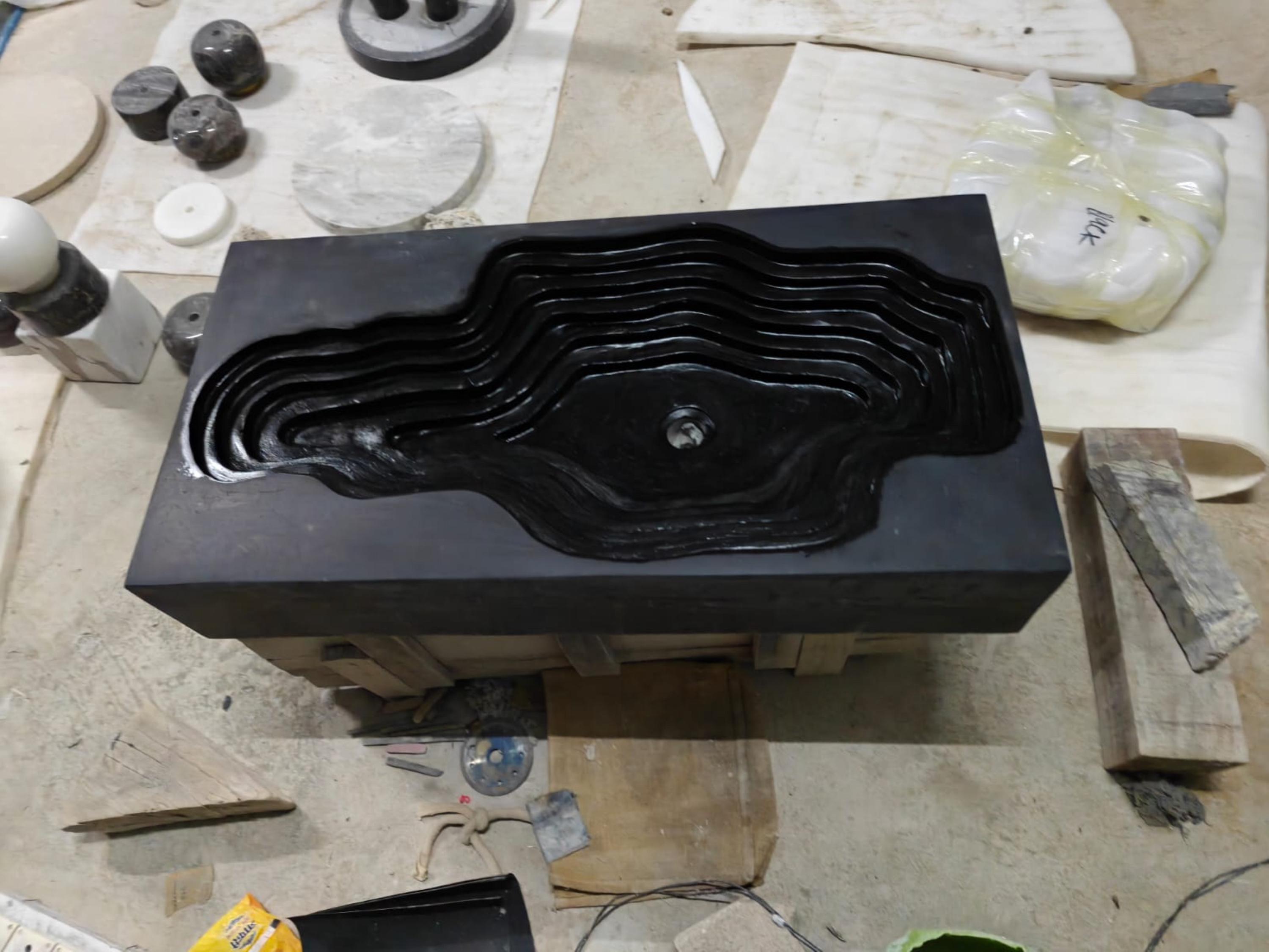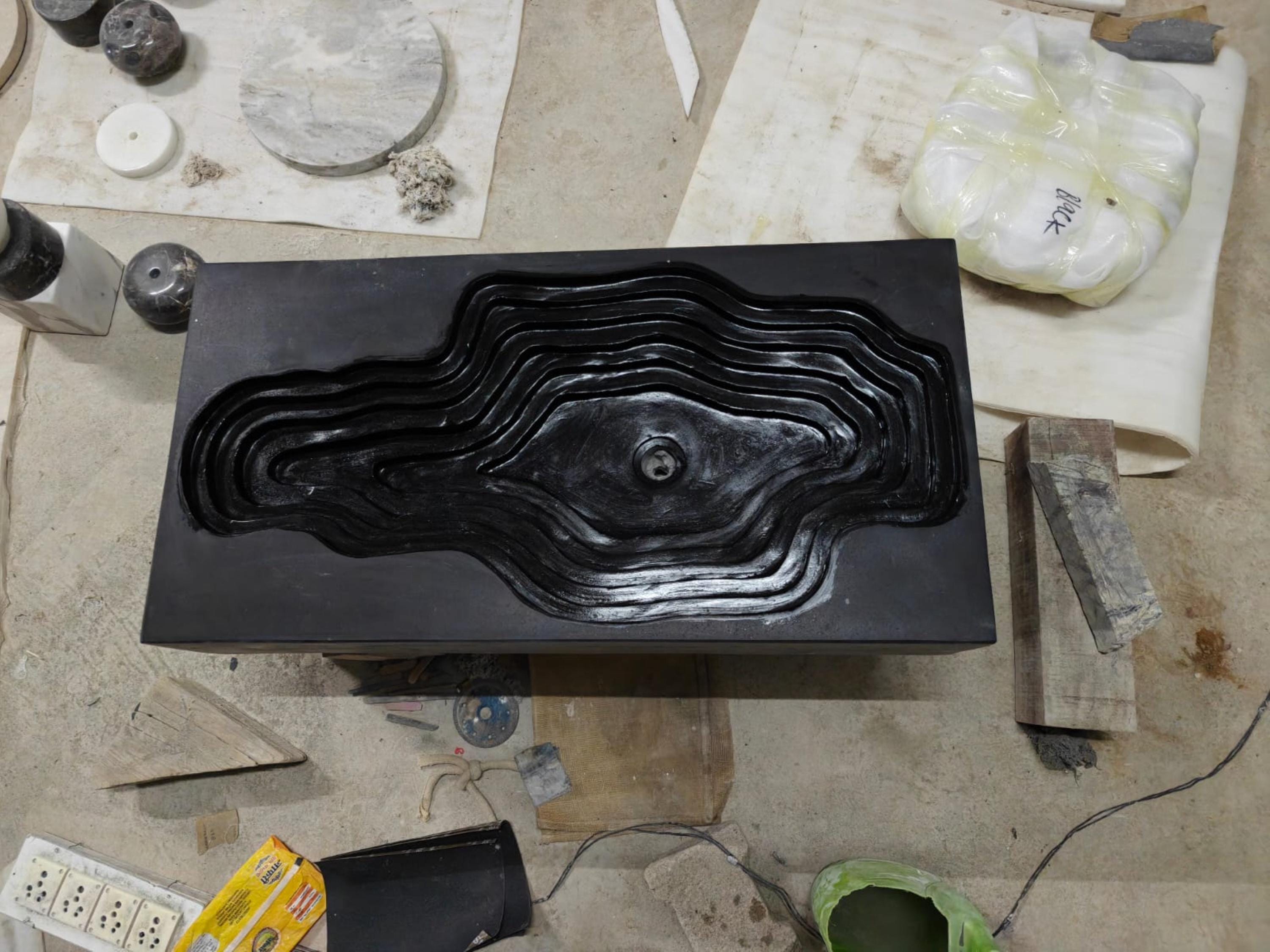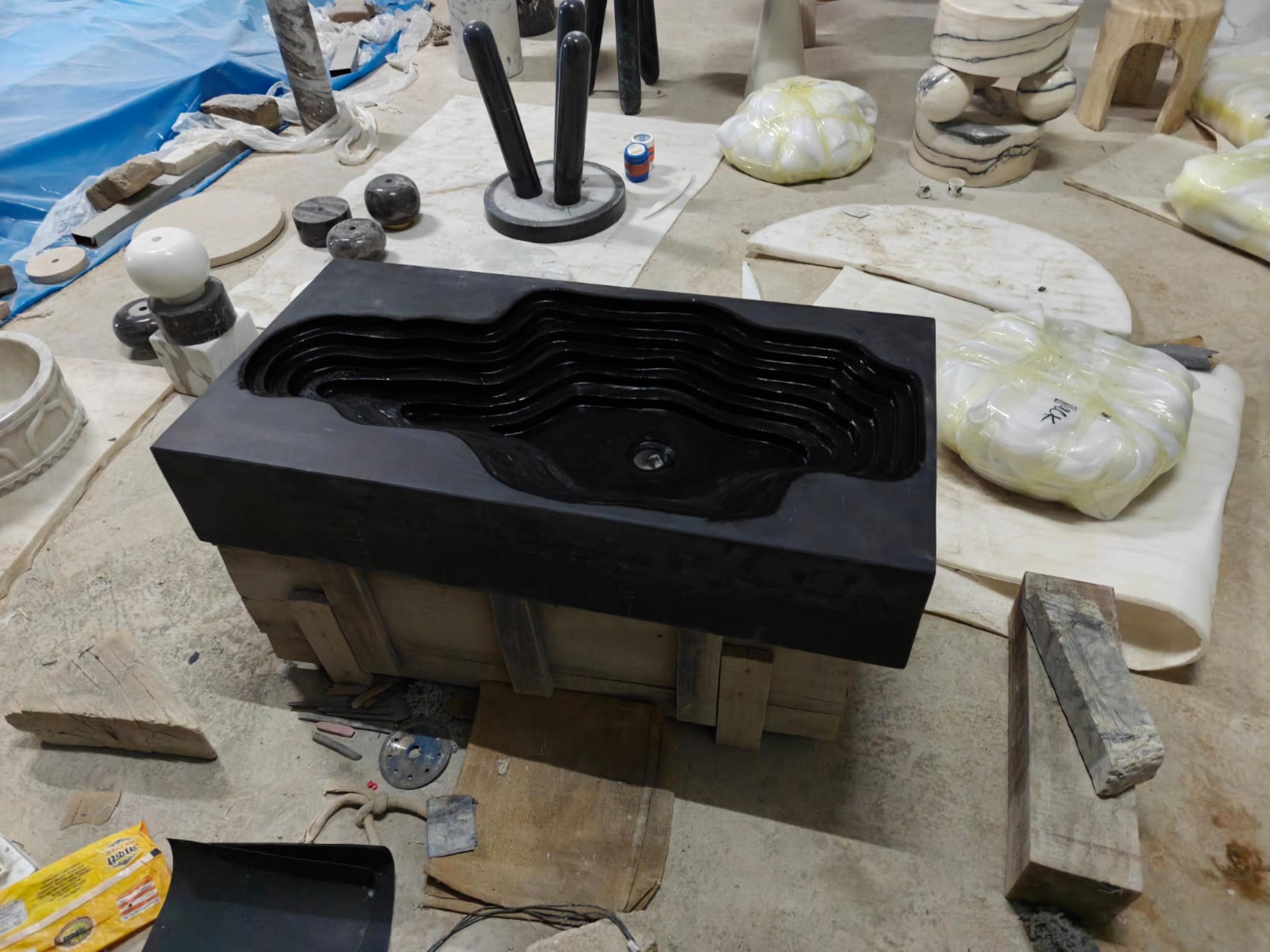 This sculptural rectangular black marble sink features a breathtaking topographic carved design, layered to resemble natural rock formations or flowing terrain. Crafted from a single block of polished black marble, this piece is a stunning fusion of natural material and artisan design. Its dramatic silhouette and matte finish bring a sense of refined luxury and modern elegance to any bathroom or powder room.