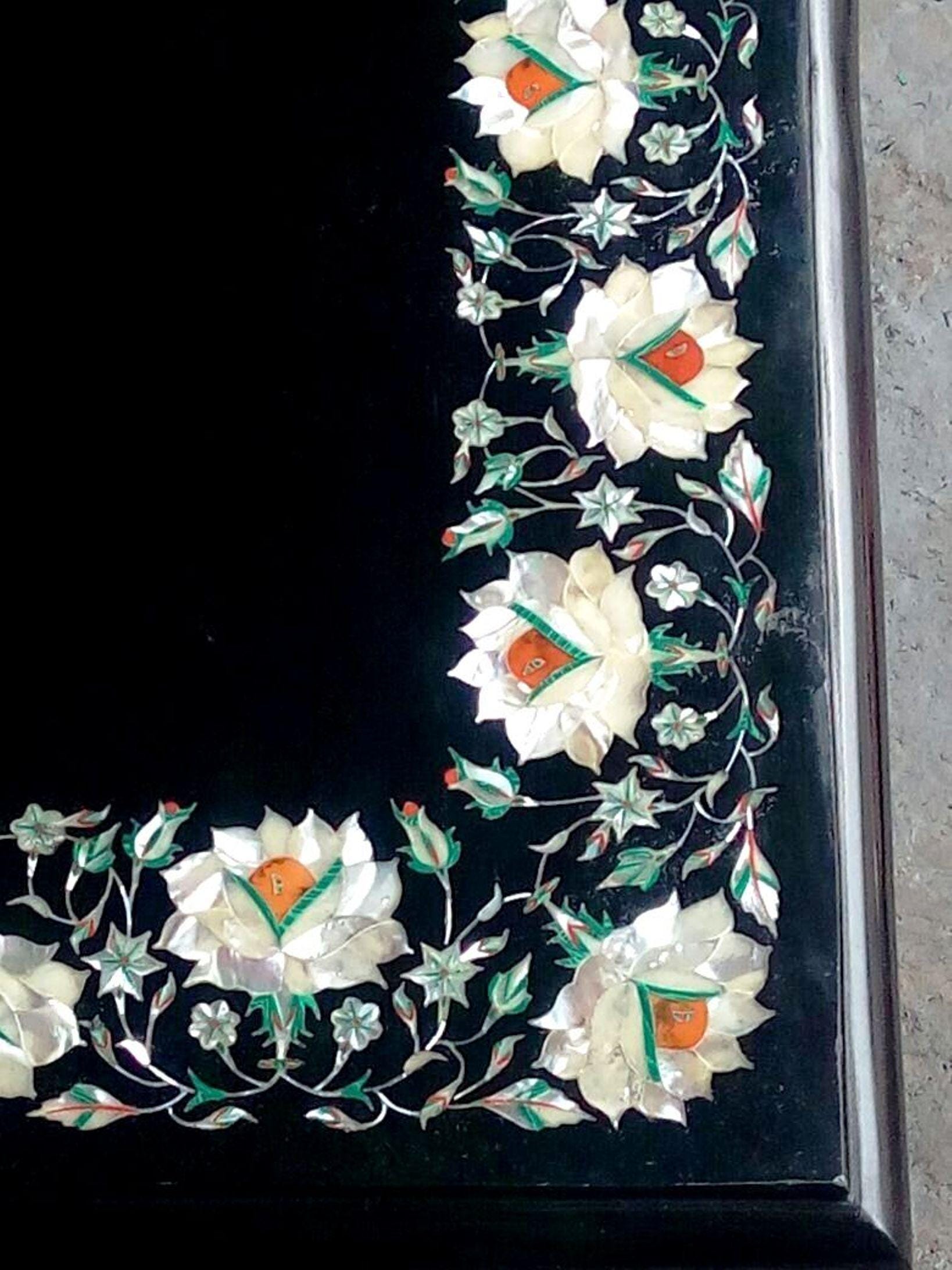 This exquisite rectangular black marble inlay table top is a timeless work of art, handcrafted using the traditional Pietra Dura technique. The deep black marble surface provides a dramatic backdrop for delicate white floral borders and an intricate central medallion composition.