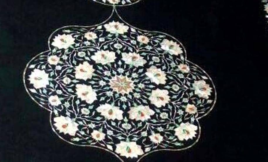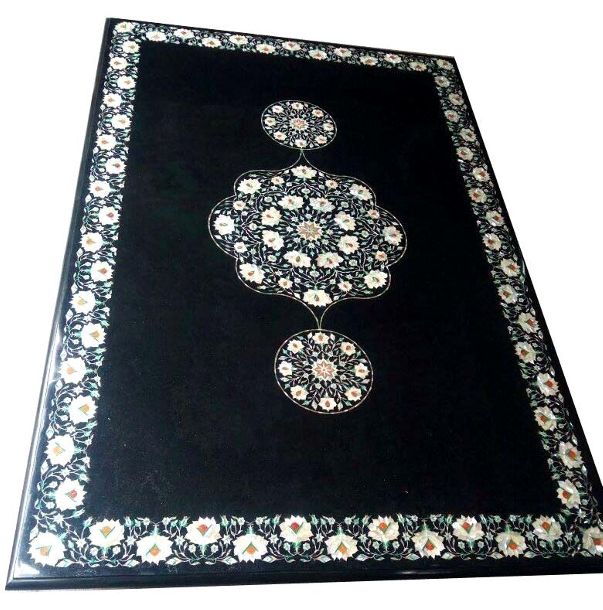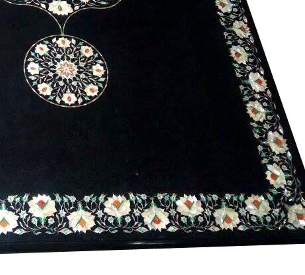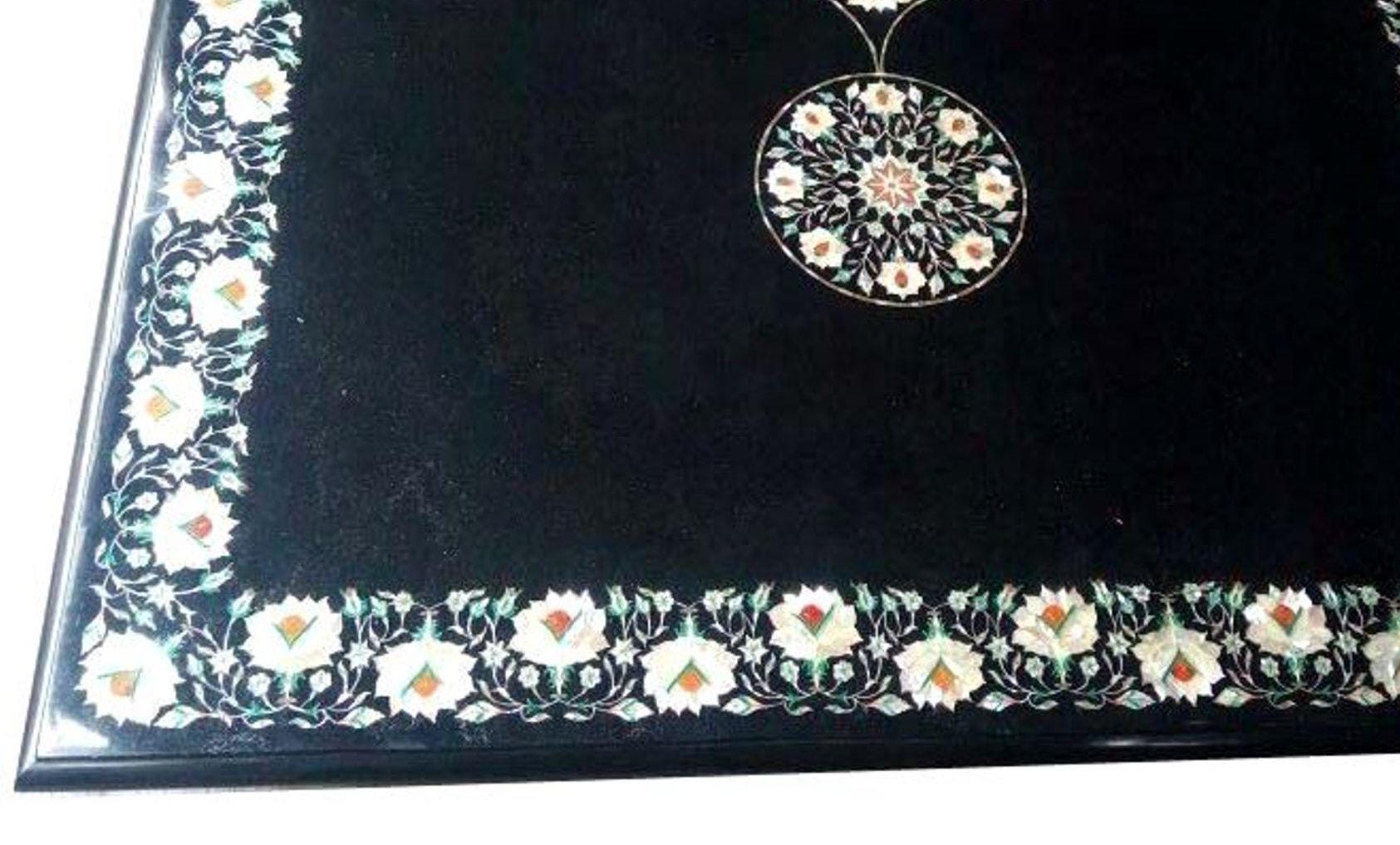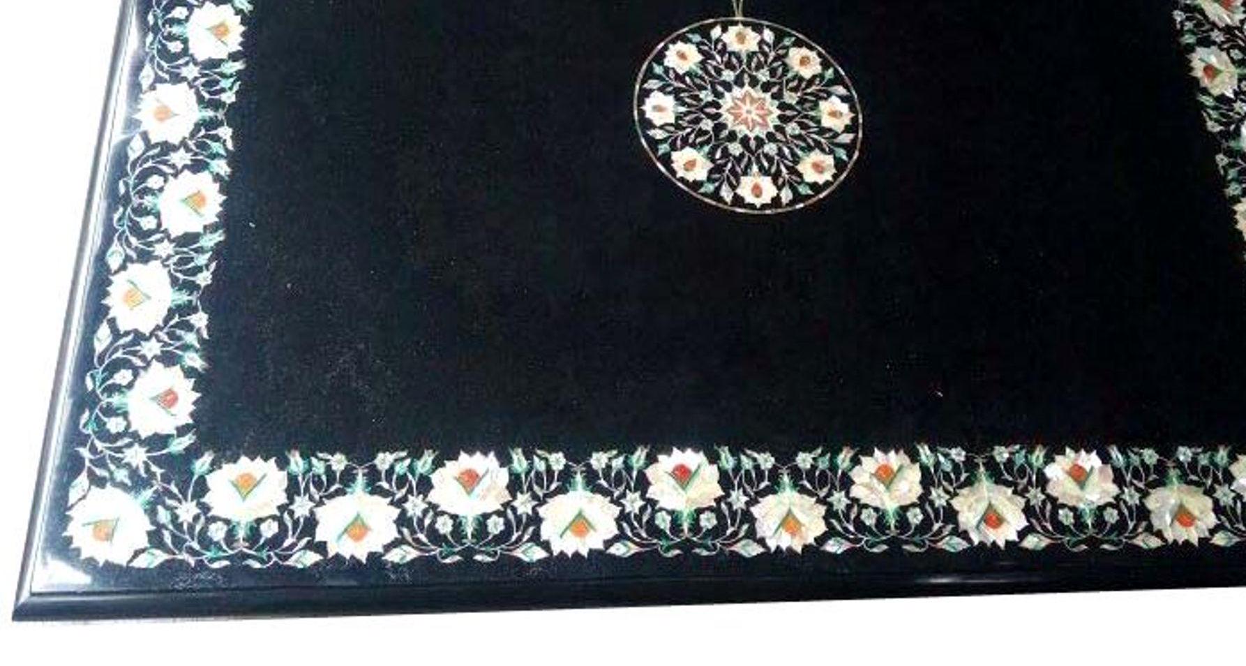Black Marble Inlay Dining Table Top – Handcrafted Pietra Dura Floral Medallion