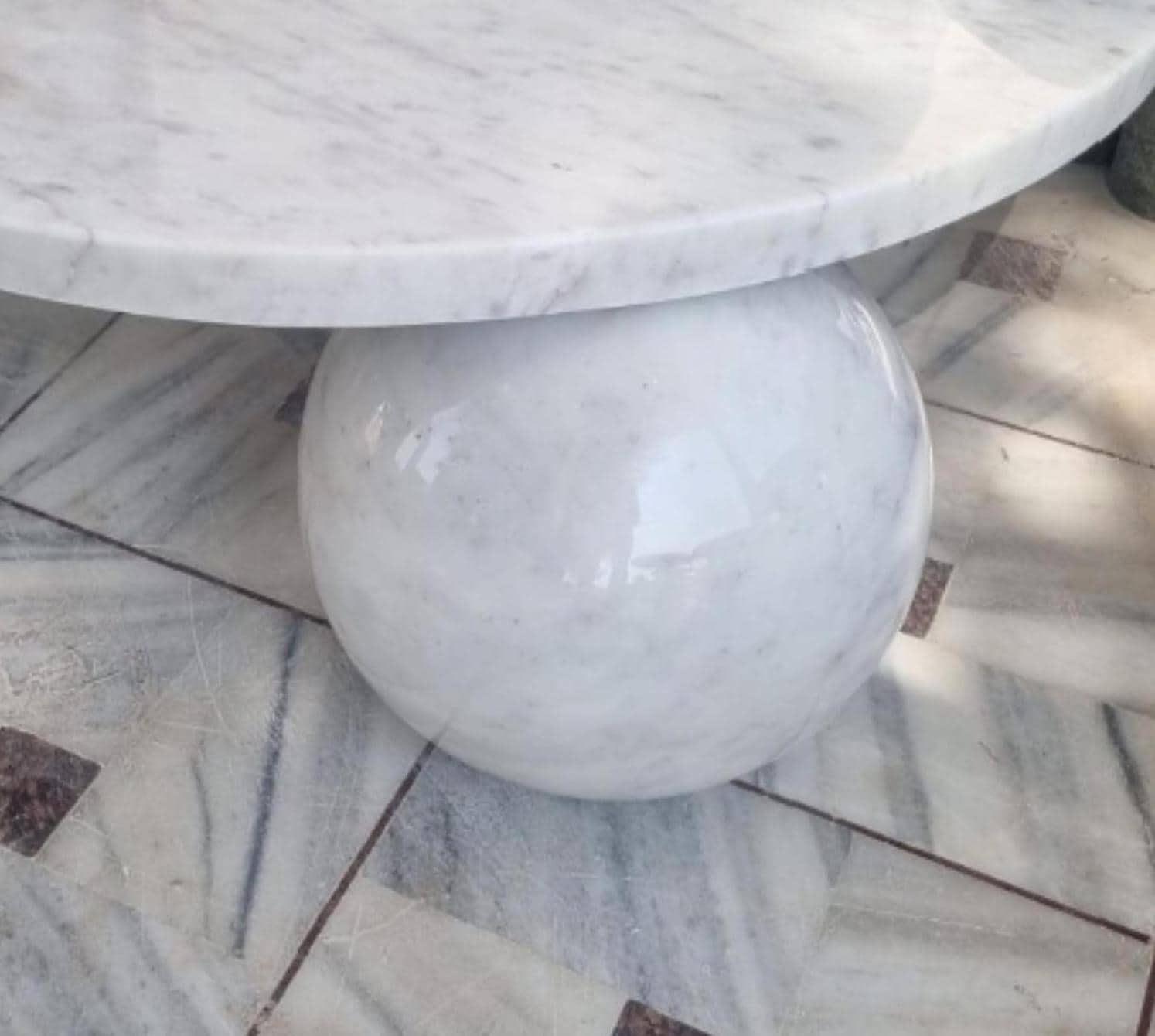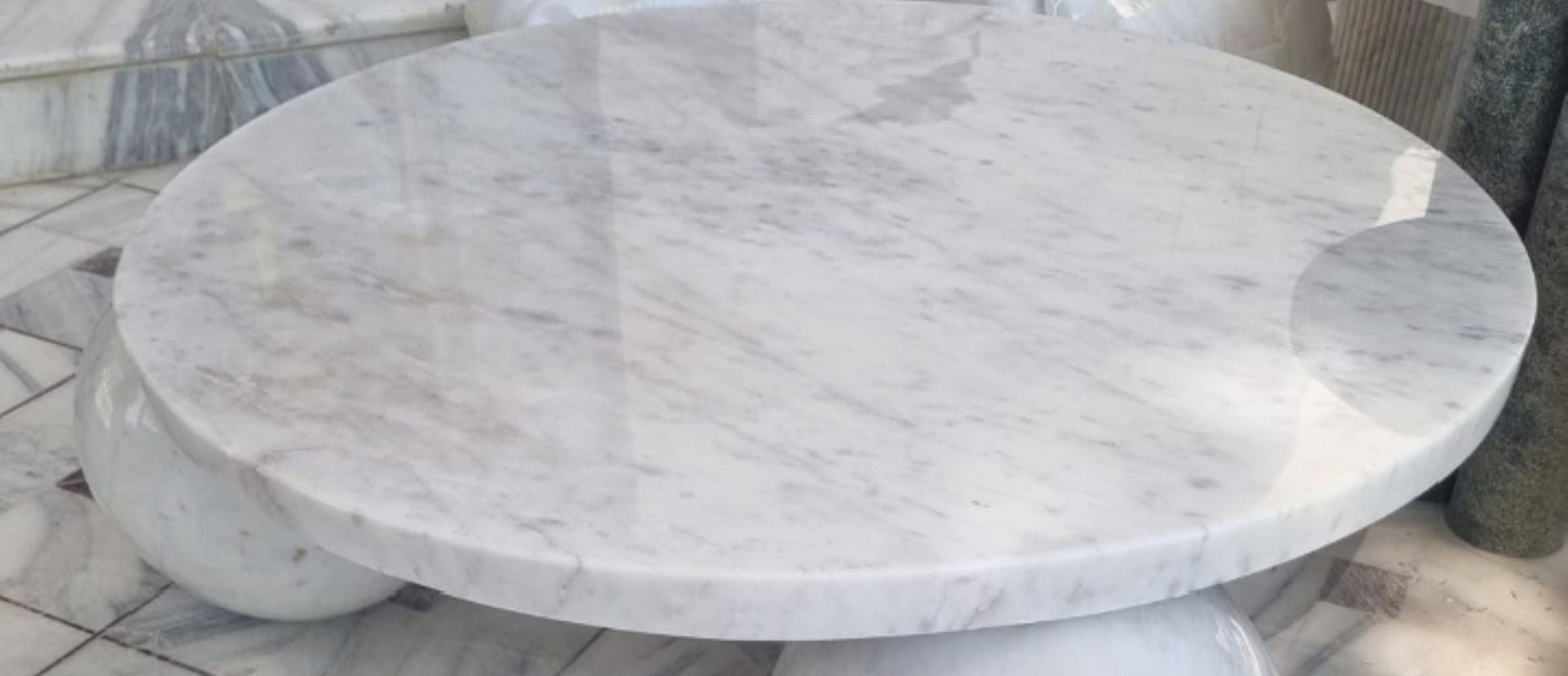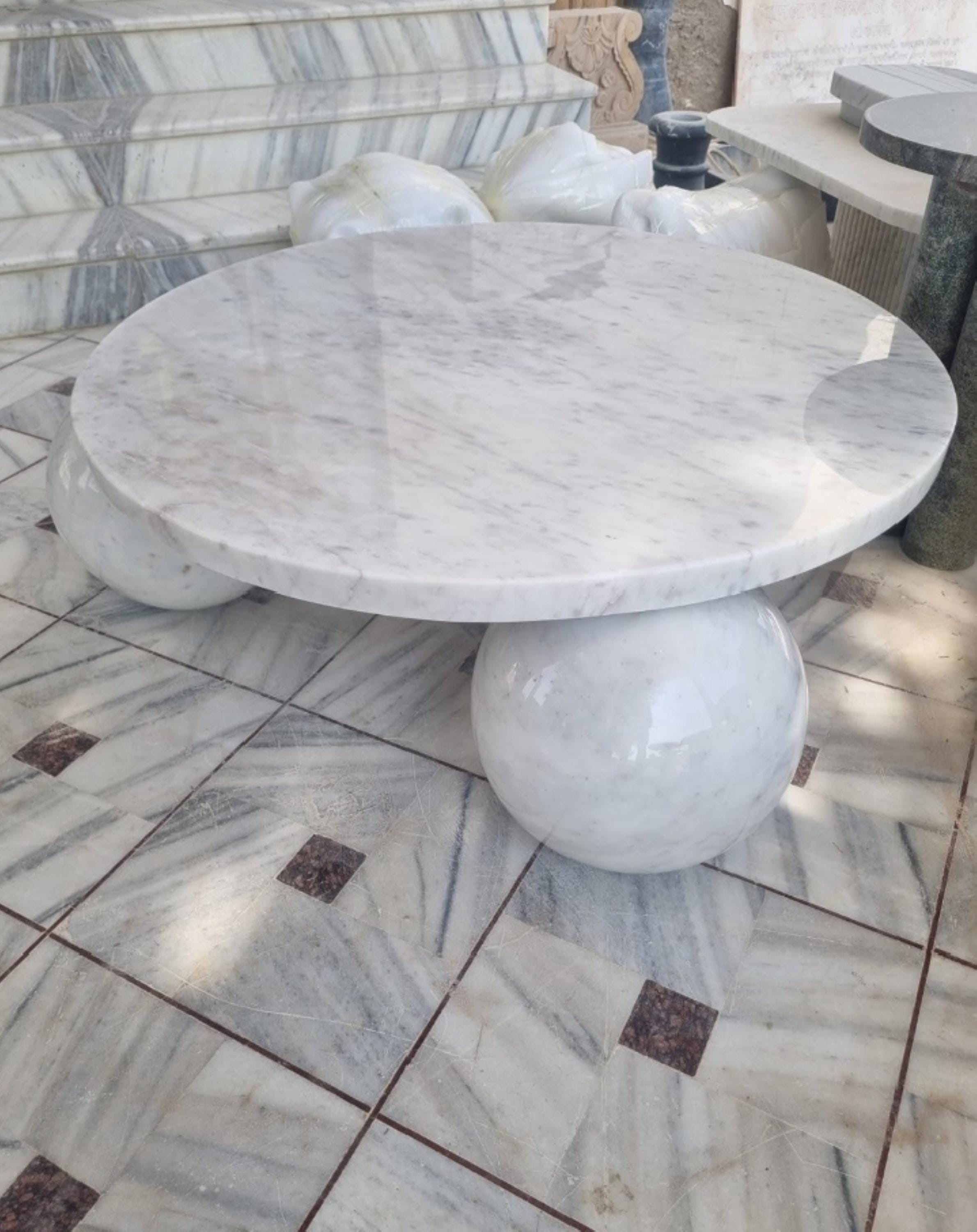This stunning round white marble coffee table is a true statement piece, featuring a beautifully polished tabletop resting on sculptural sphere-shaped legs. Crafted from premium-grade natural marble, it blends modern minimalism with timeless elegance, making it perfect for luxurious living rooms, patios, hotels, or showrooms.
