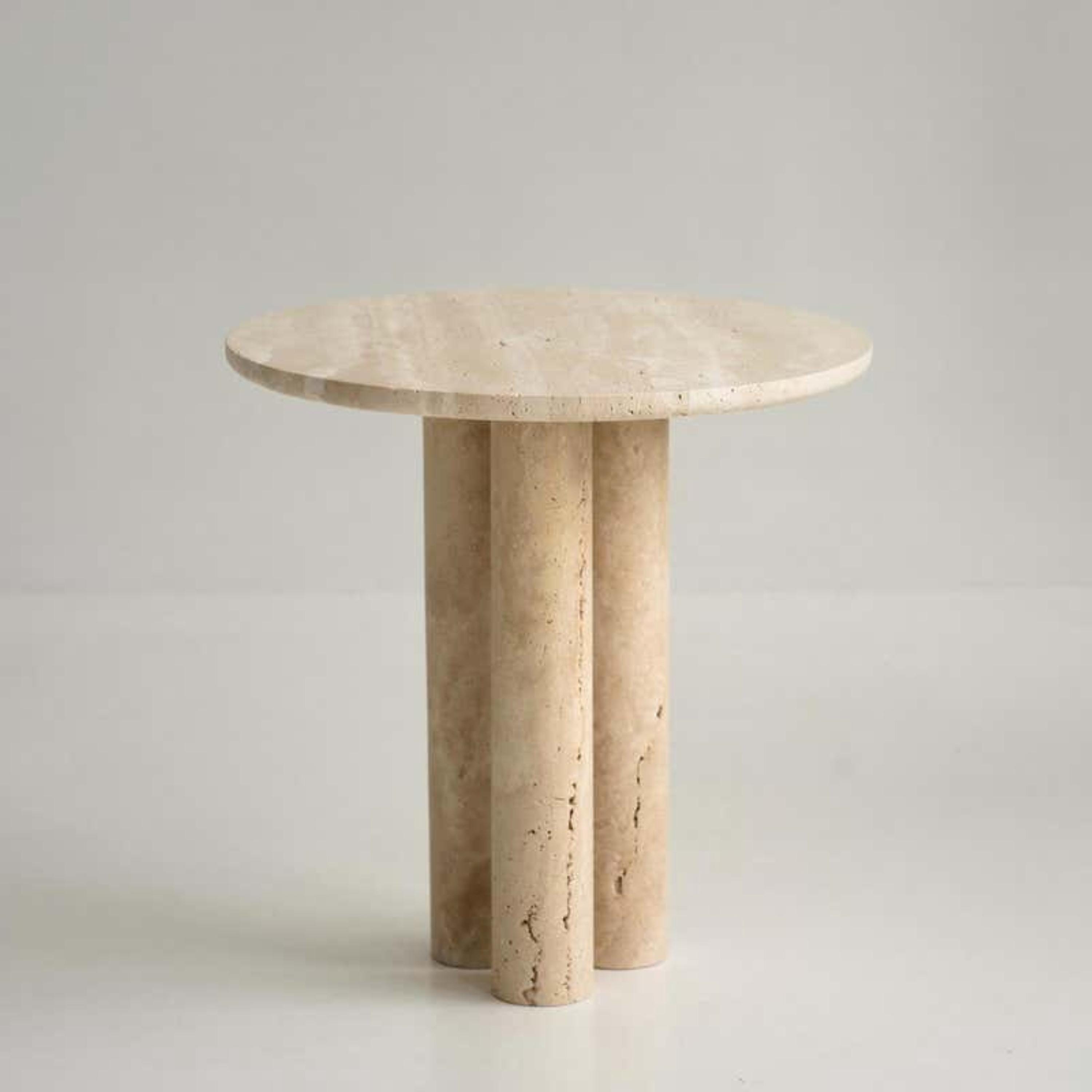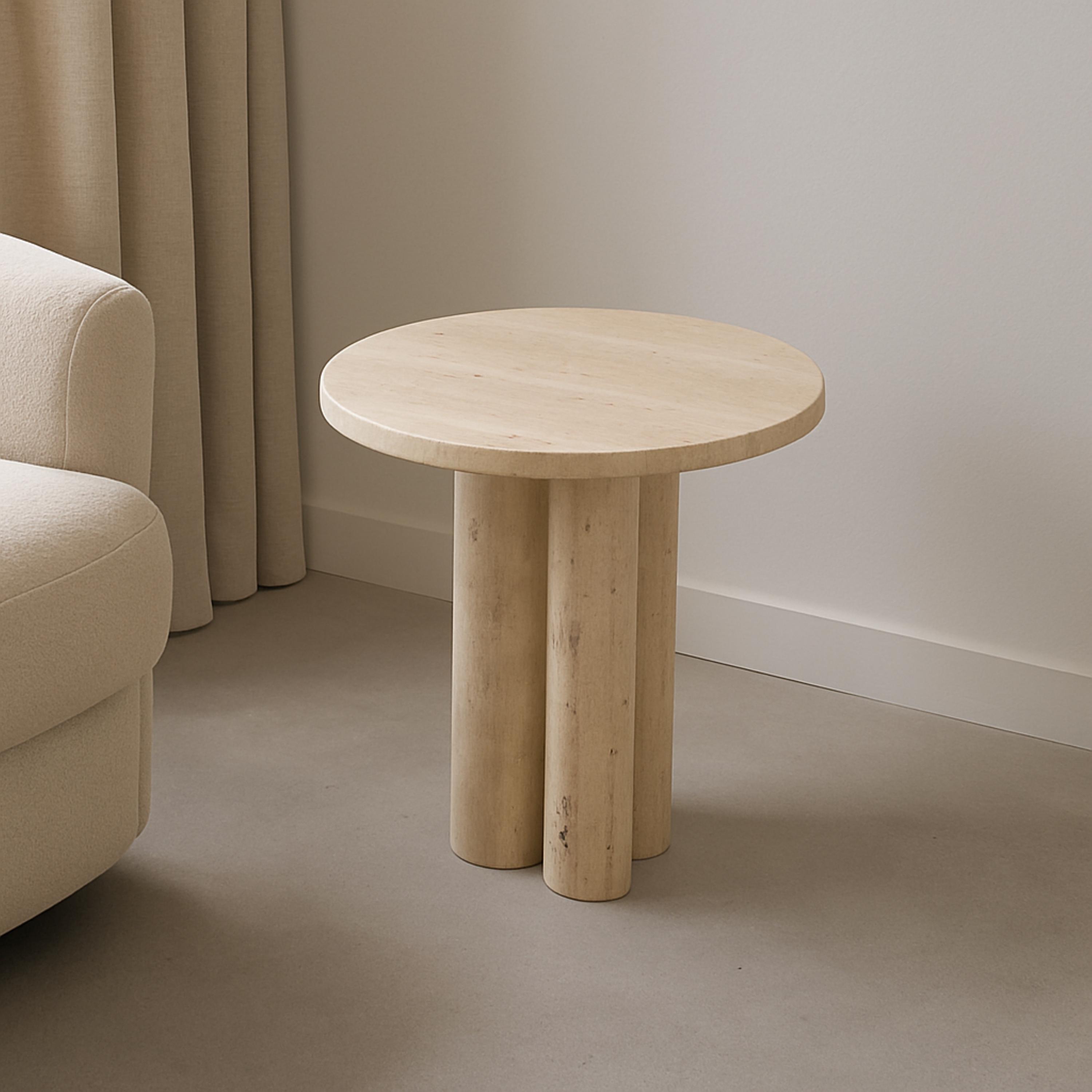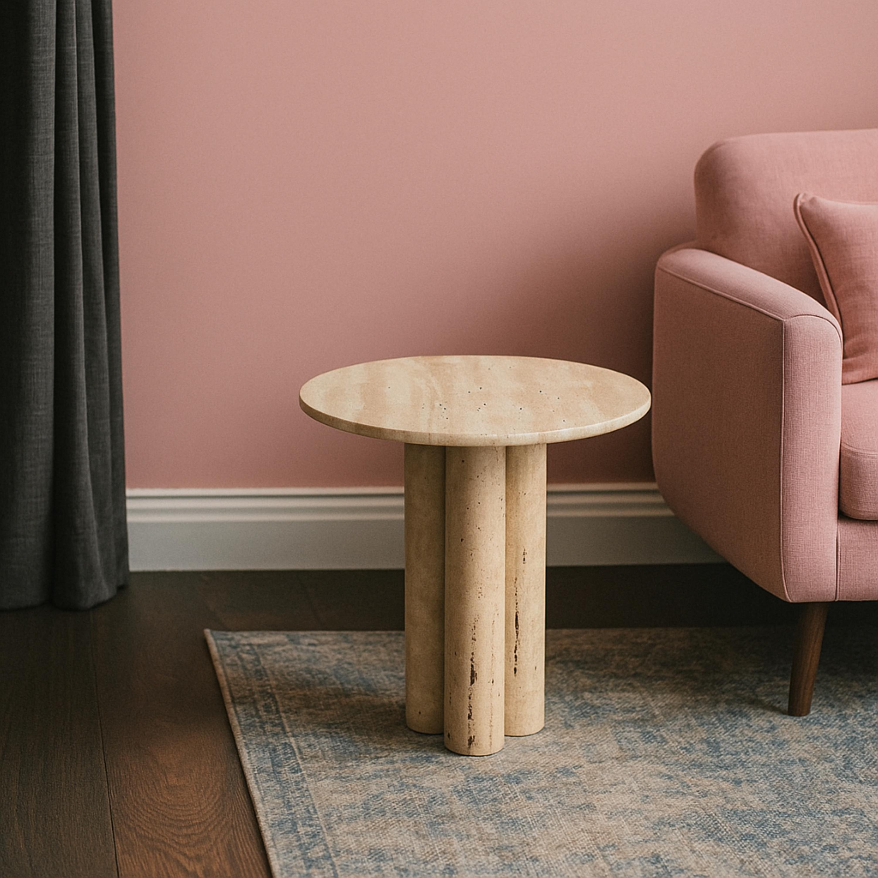 Elevate your interior with this minimalist round travertine side table, designed to bring sculptural elegance and natural warmth into your space. Featuring a smooth circular top and a bold double-cylinder pedestal base, this piece blends modern simplicity with timeless stone craftsmanship.