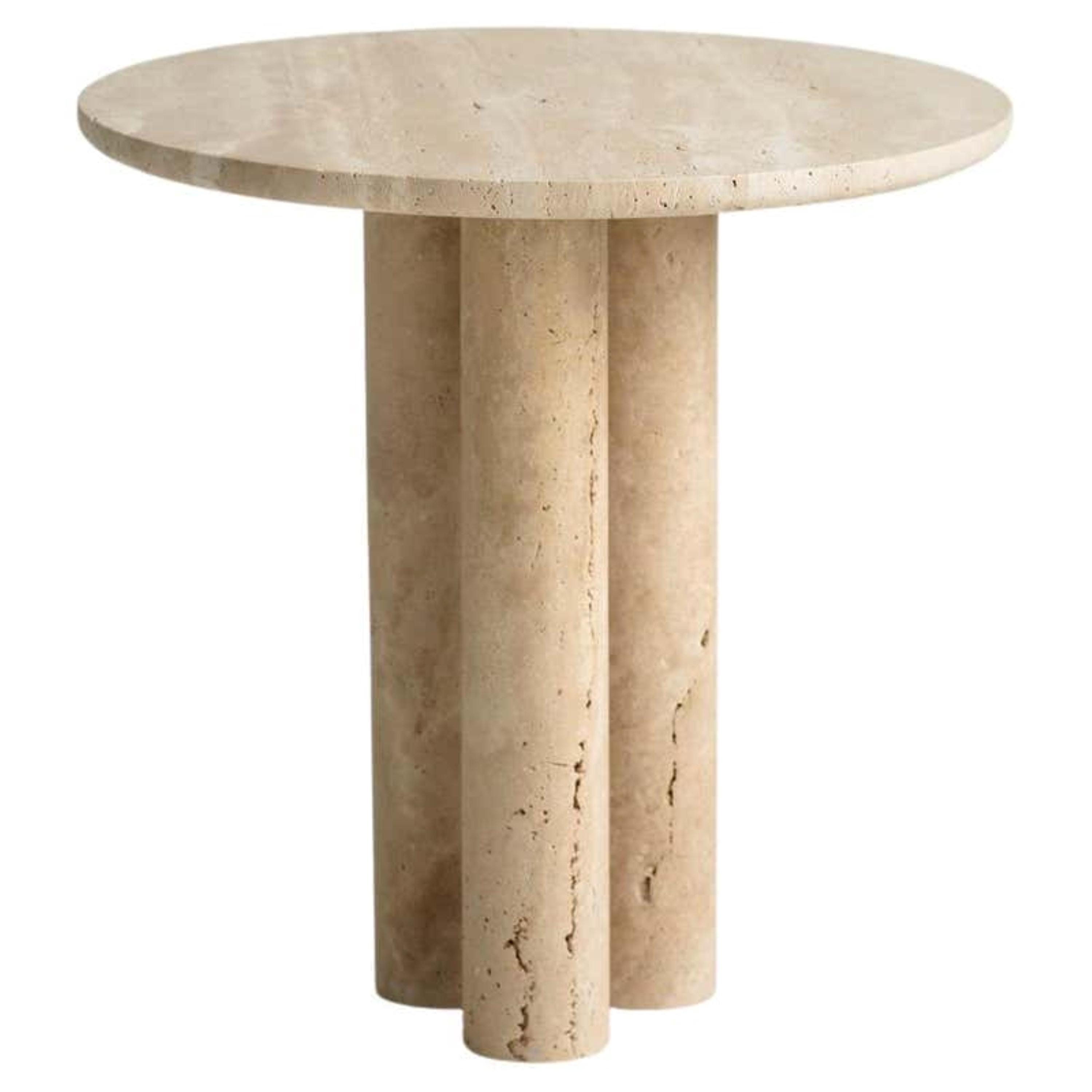 Bring sculptural sophistication and timeless design into your home with this elegant travertine accent table.