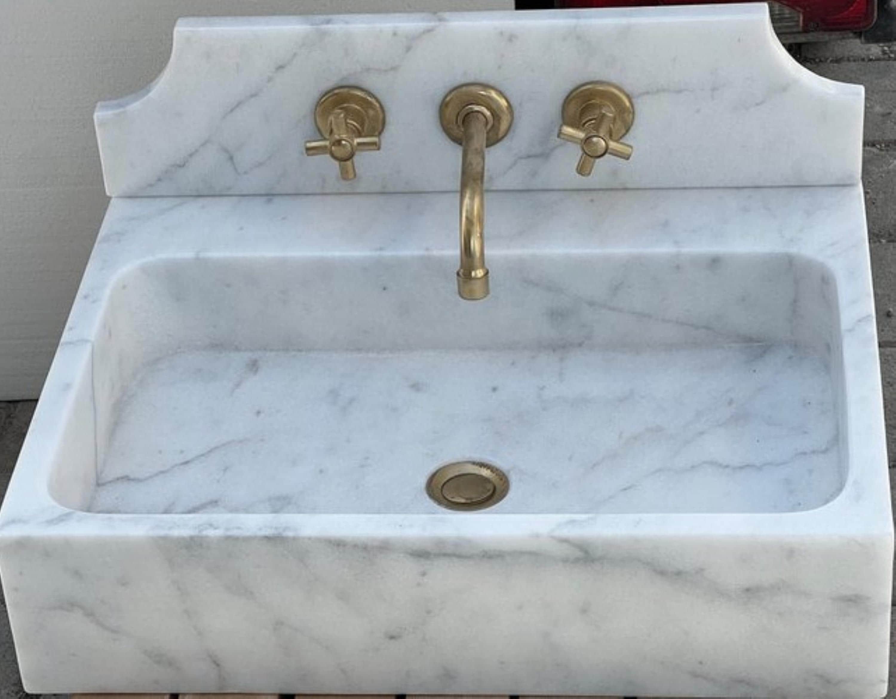 Transform your bathroom with this elegant white Carrara marble wall-mounted sink, handcrafted from a single block of genuine Italian marble. The design features a rectangular deep basin with a smooth matte or polished finish, a raised backsplash, and beautiful brass fittings, blending tradition with contemporary sophistication.
