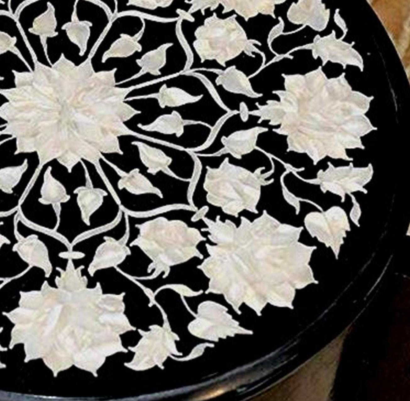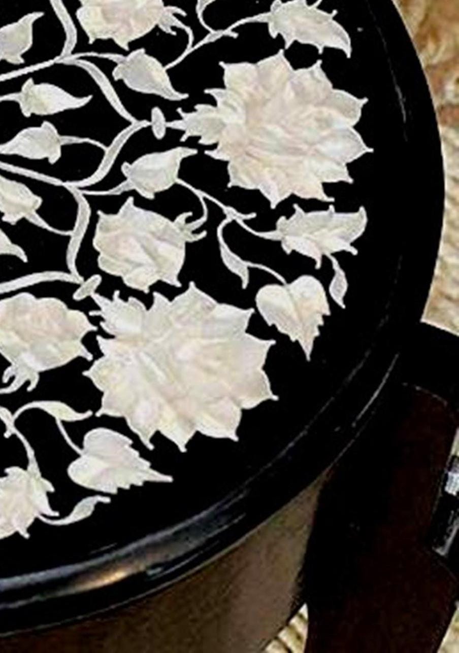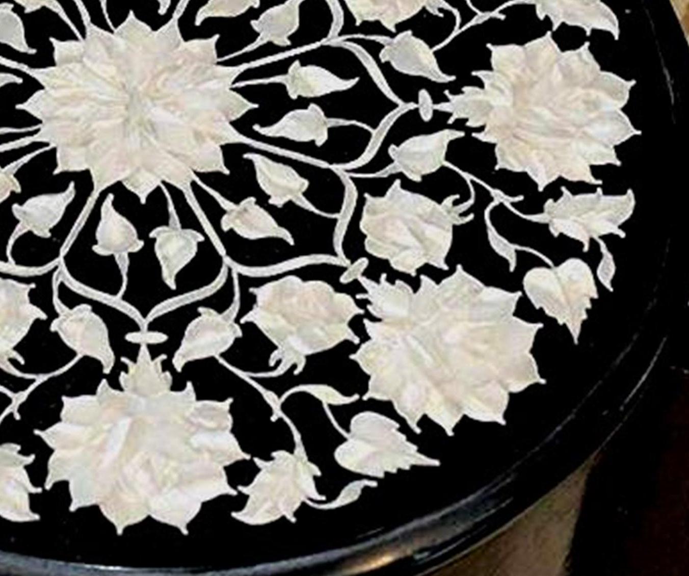 Round Black Marble Inlay Table Top – White Floral Pietra Dura Design – Handmade Mother of Pearl Accent Side Table