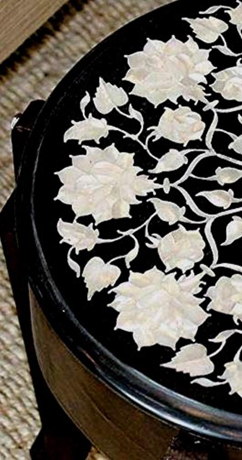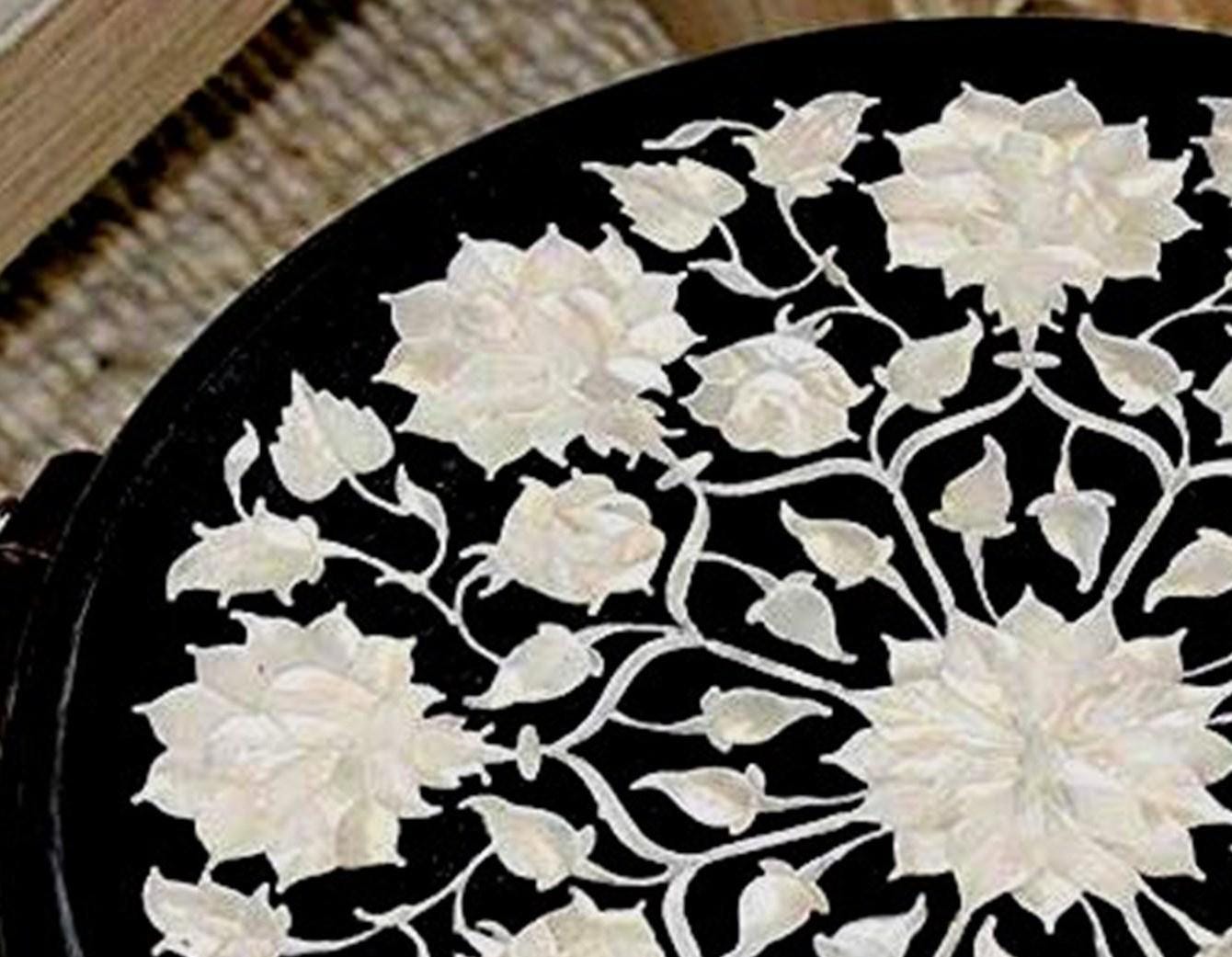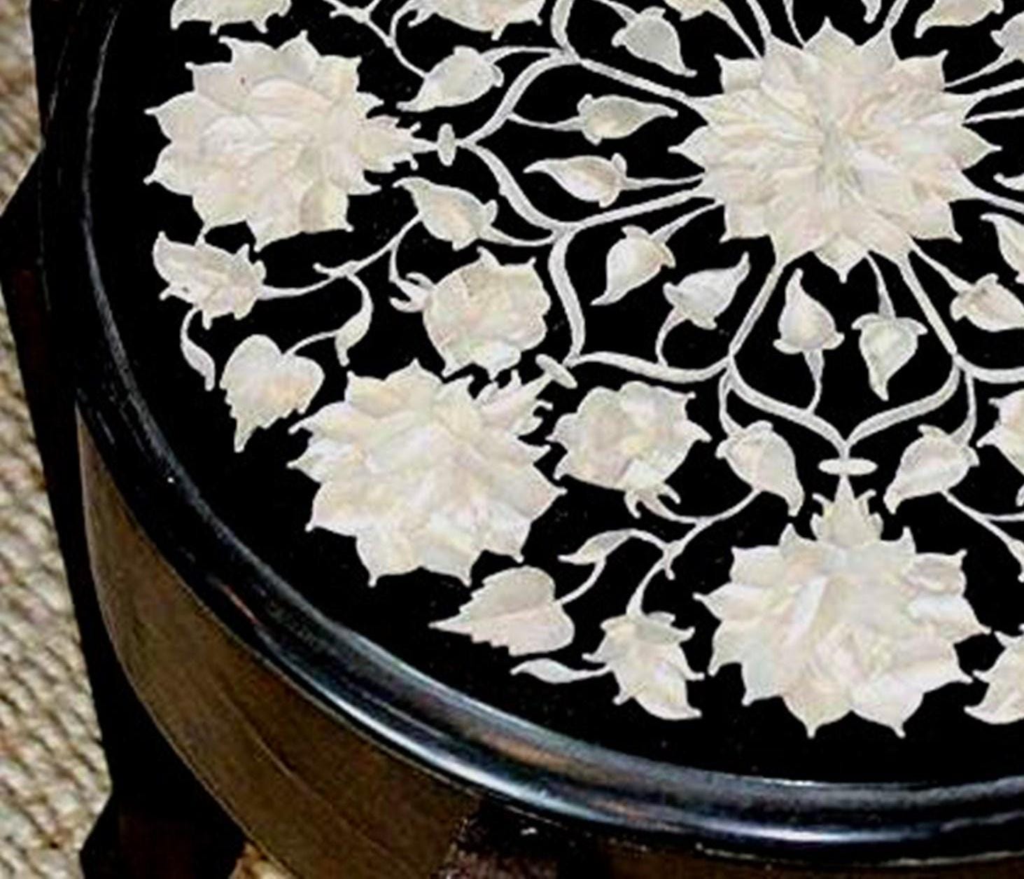 Round Black Marble Inlay Table Top – White Floral Pietra Dura Design – Handmade Mother of Pearl Accent Side Table
