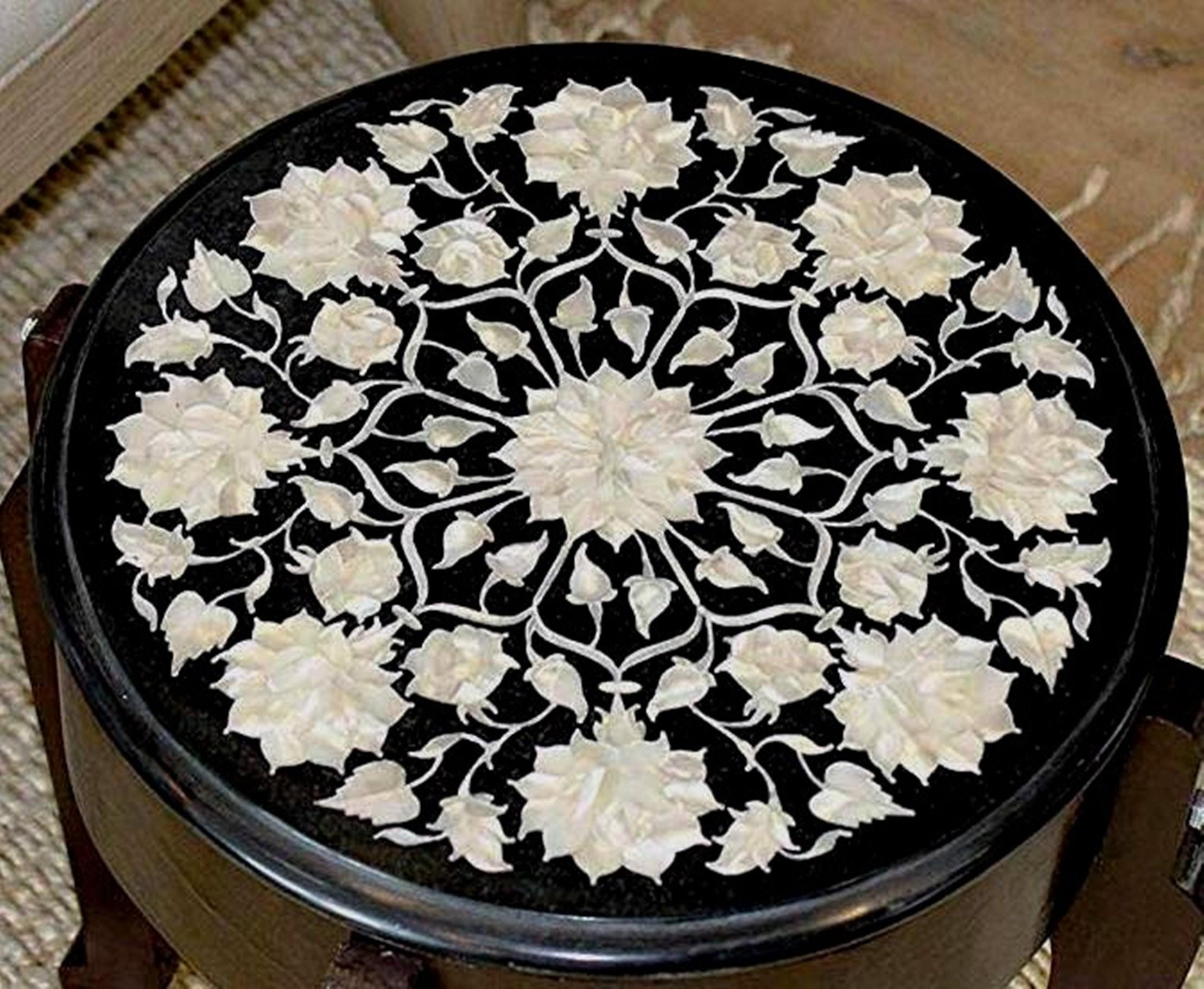 Add timeless elegance to your home with this handcrafted round black marble inlay table top, featuring a graceful white floral medallion design. The intricate pattern radiates from the center in perfect symmetry, creating a refined and calming visual balance.