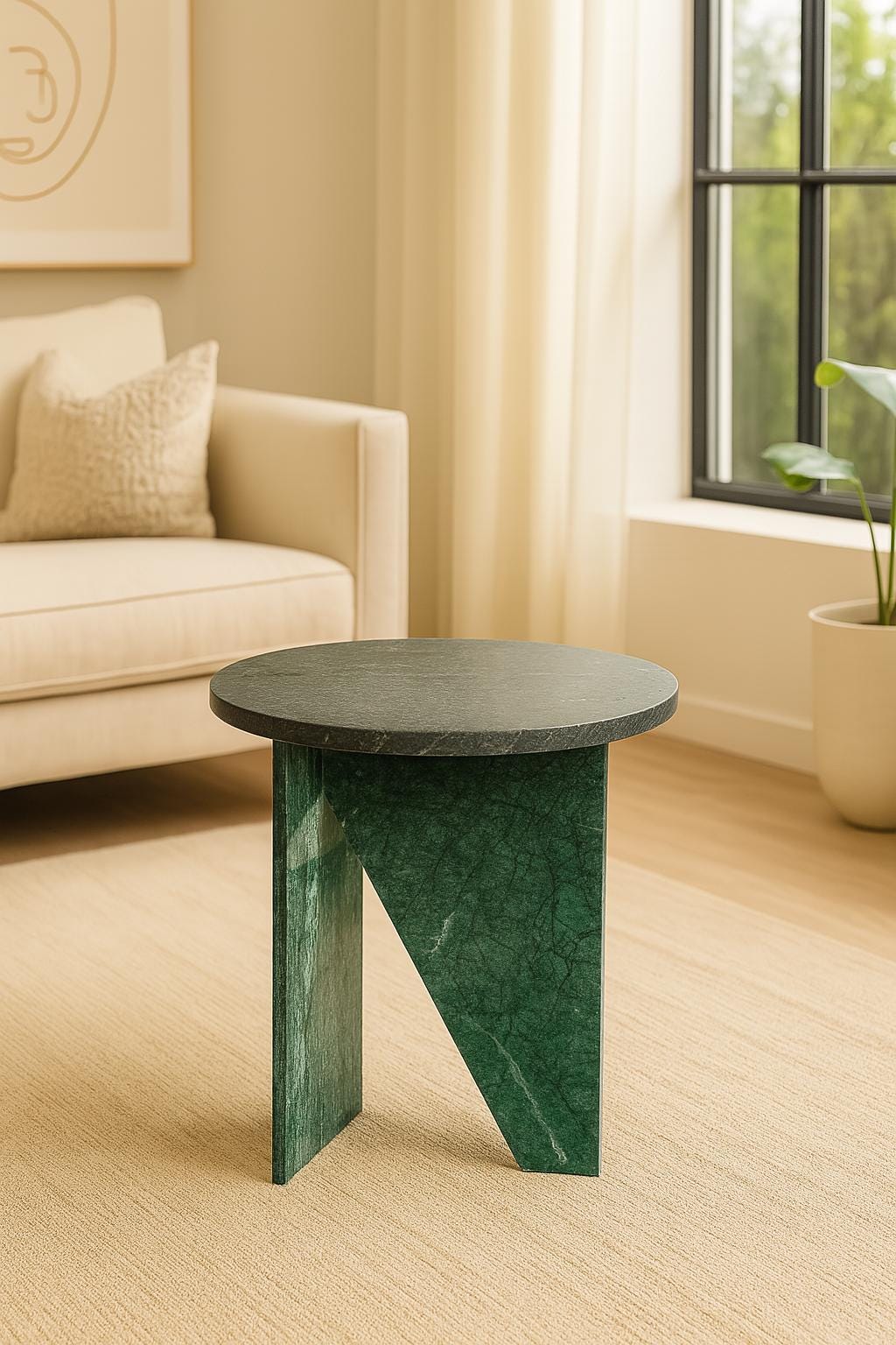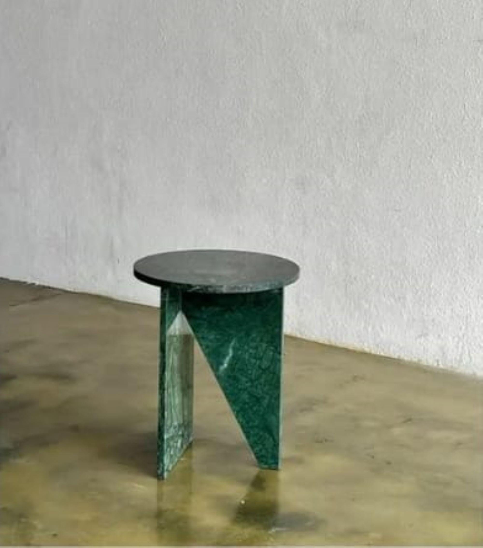 Infuse your space with the quiet sophistication of natural stone through this Modern Luxury Green Marble Side Table, a striking fusion of geometry, craftsmanship, and timeless elegance. Handcrafted by skilled artisans in Agra, India, this table showcases a smooth circular top supported by a sculptural triangular base—creating a bold architectural balance between form and function.