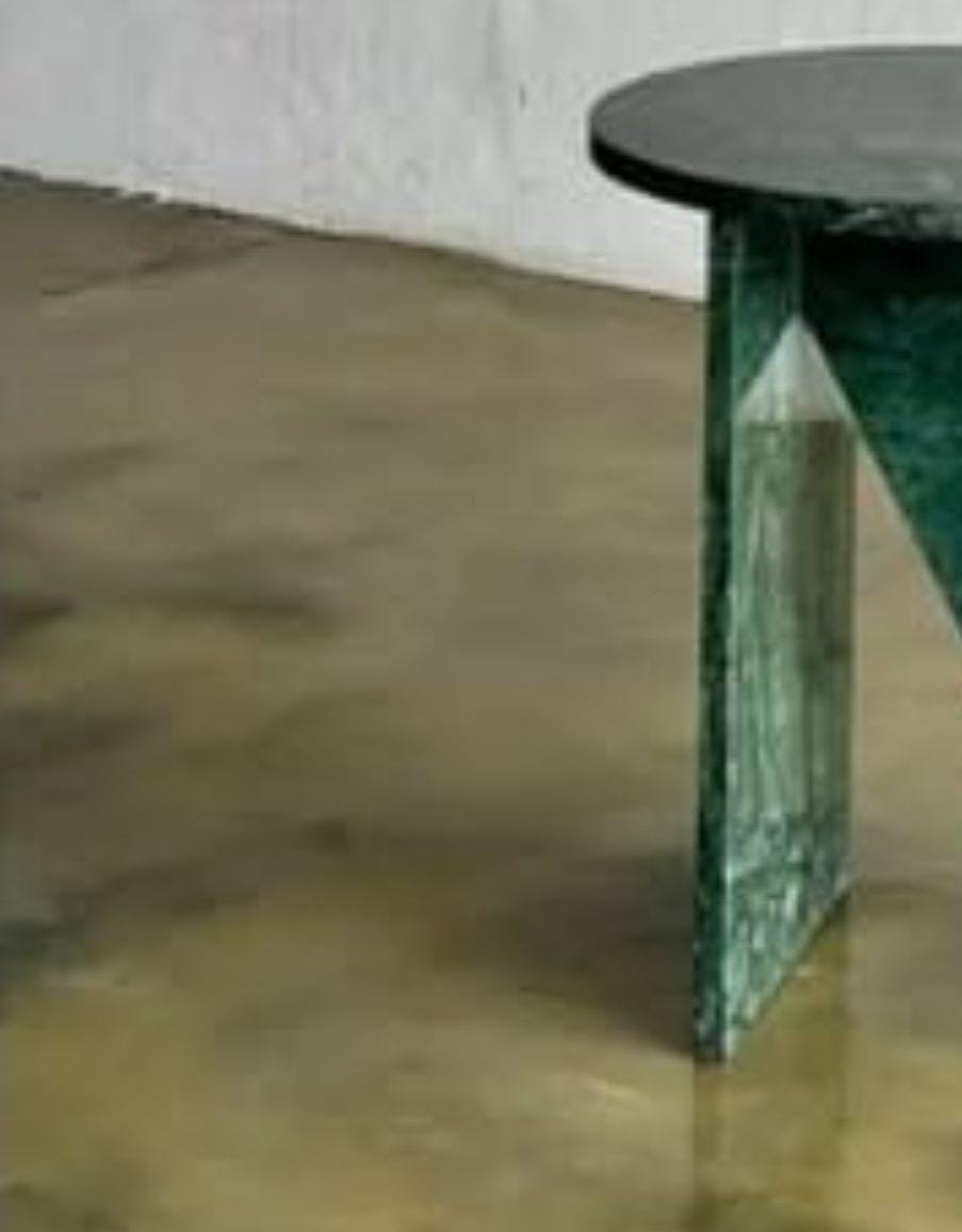 Carved from a single block of authentic green marble, the table reveals deep emerald hues accentuated by delicate white veining, giving each piece its own unique character. The polished surface reflects light beautifully, adding an understated touch of luxury to both contemporary and minimalist interiors.