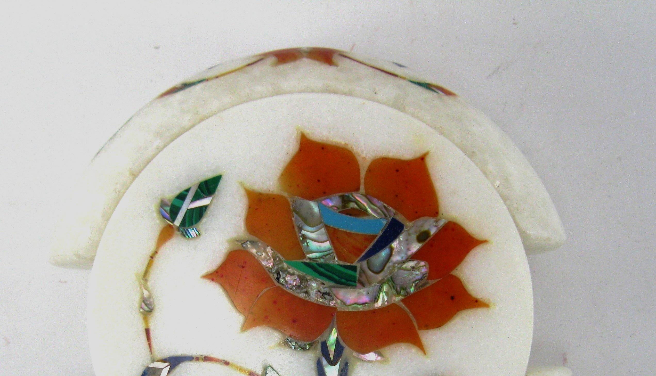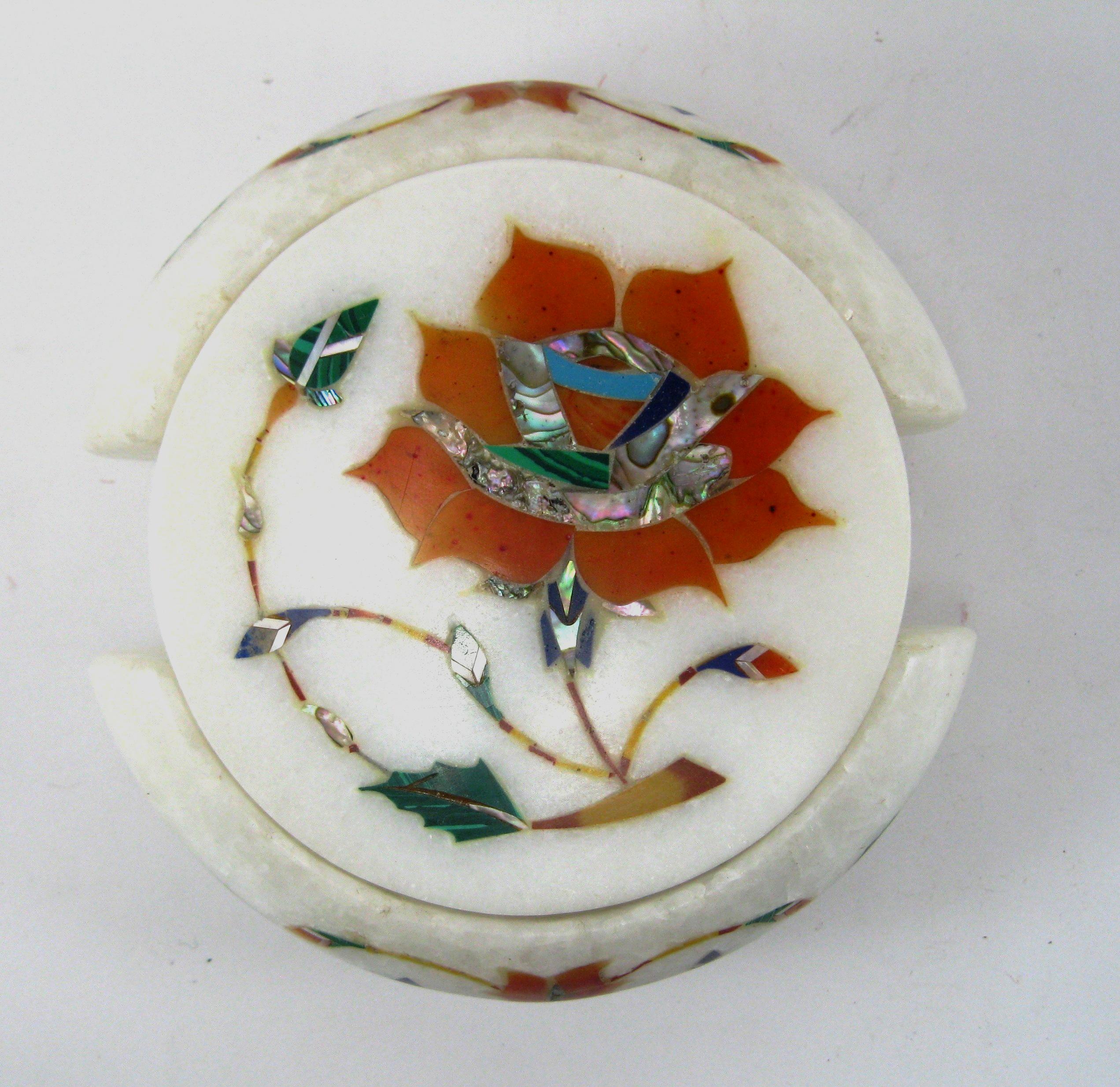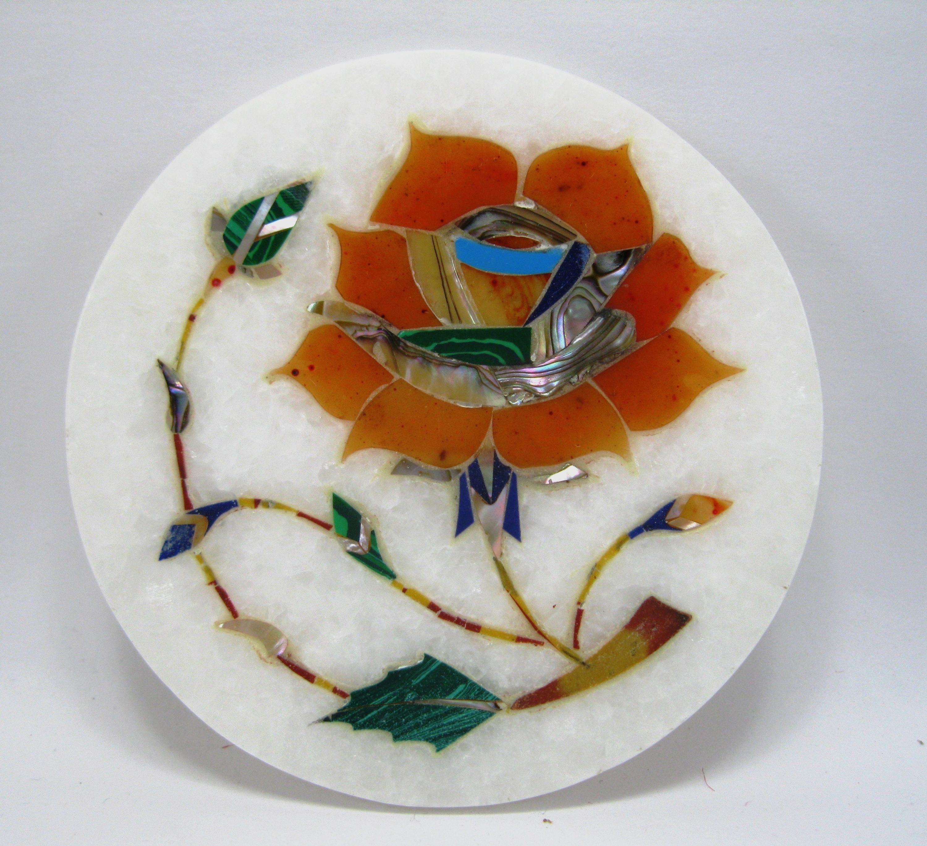The decorative surface features traditional hand-cut stone inlay, where small pieces of semi-precious stones are precisely shaped and embedded into the marble.