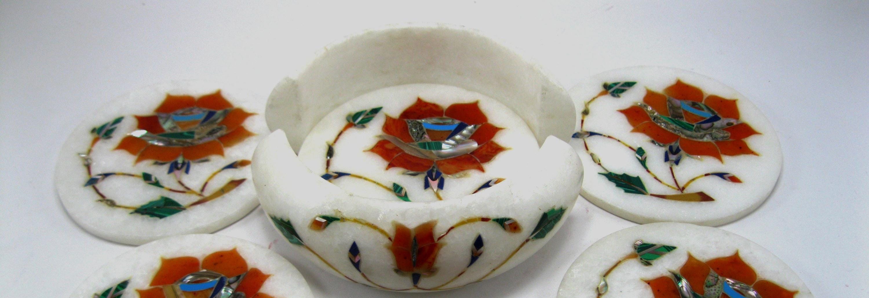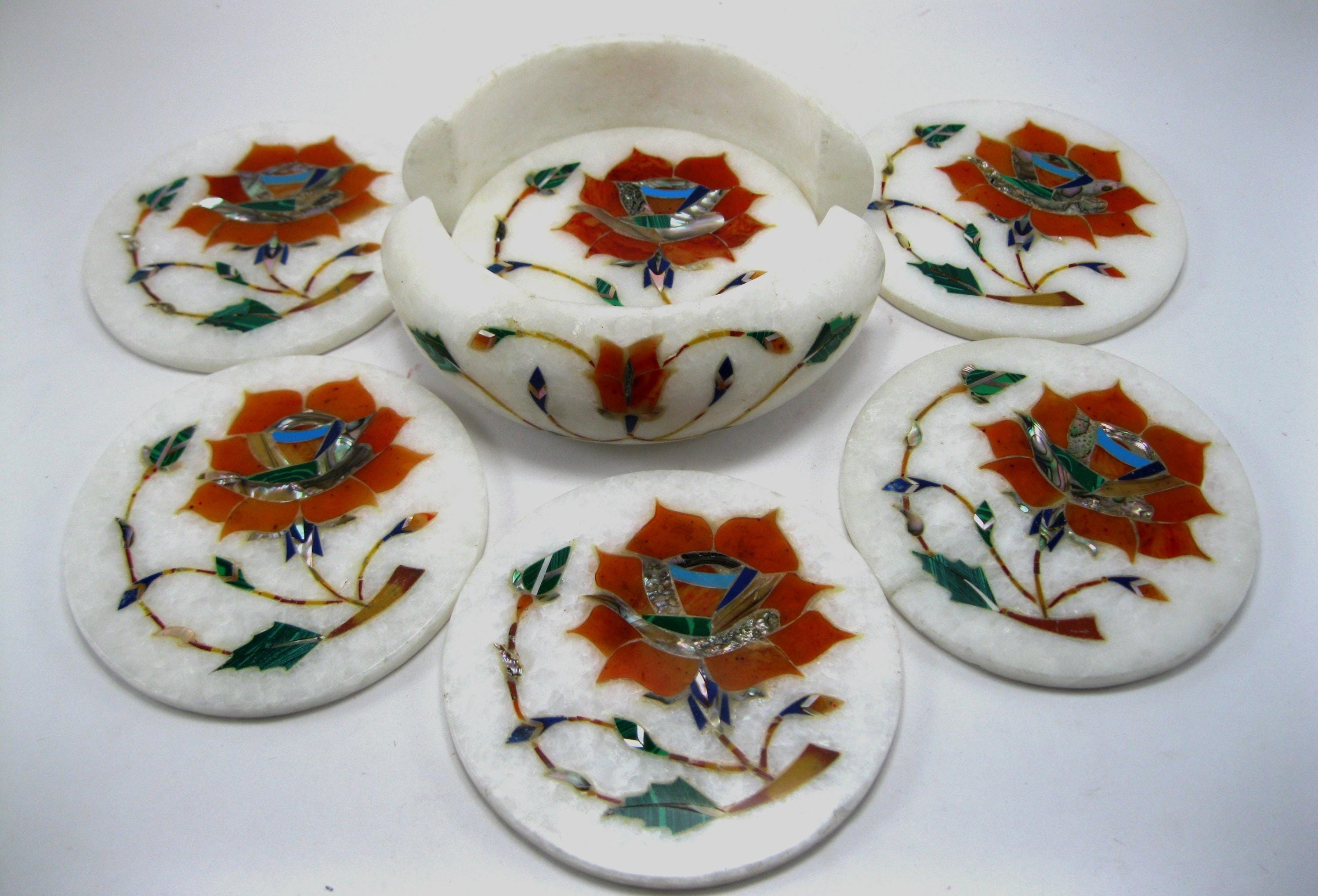 This elegant white marble bowl and coaster set features intricate handcrafted stone inlay inspired by traditional Pietra Dura artistry. The set includes a carved marble bowl surrounded by six matching round coasters, each decorated with a vibrant floral design.