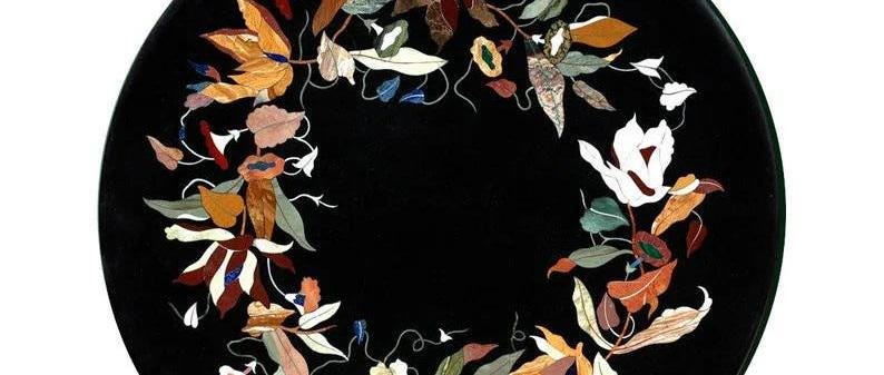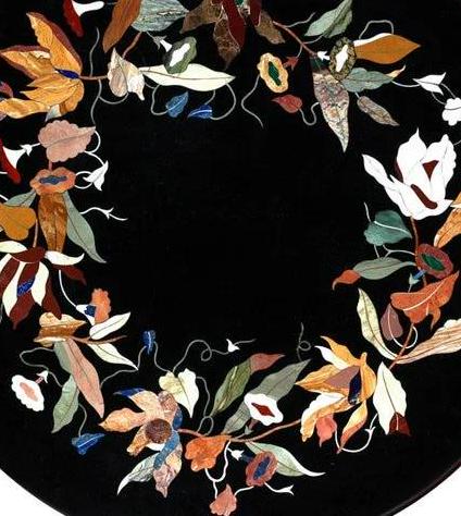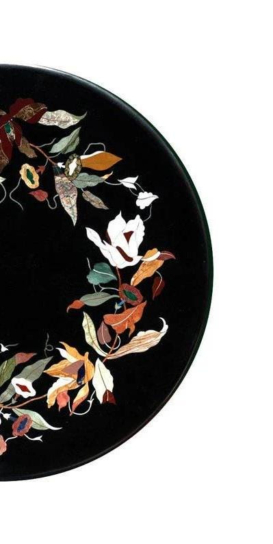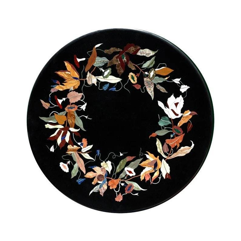 Black Marble Pietra Dura Table Top, Floral Wreath Semi-Precious Stone Inlay