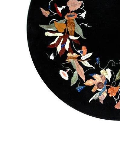 This elegant, round black marble inlay table top features a beautifully balanced floral wreath design handcrafted using the traditional Pietra Dura stone inlay technique. The vibrant arrangement of flowers and leaves forms a circular garland pattern surrounding the center, creating a striking decorative composition against the polished black marble surface.