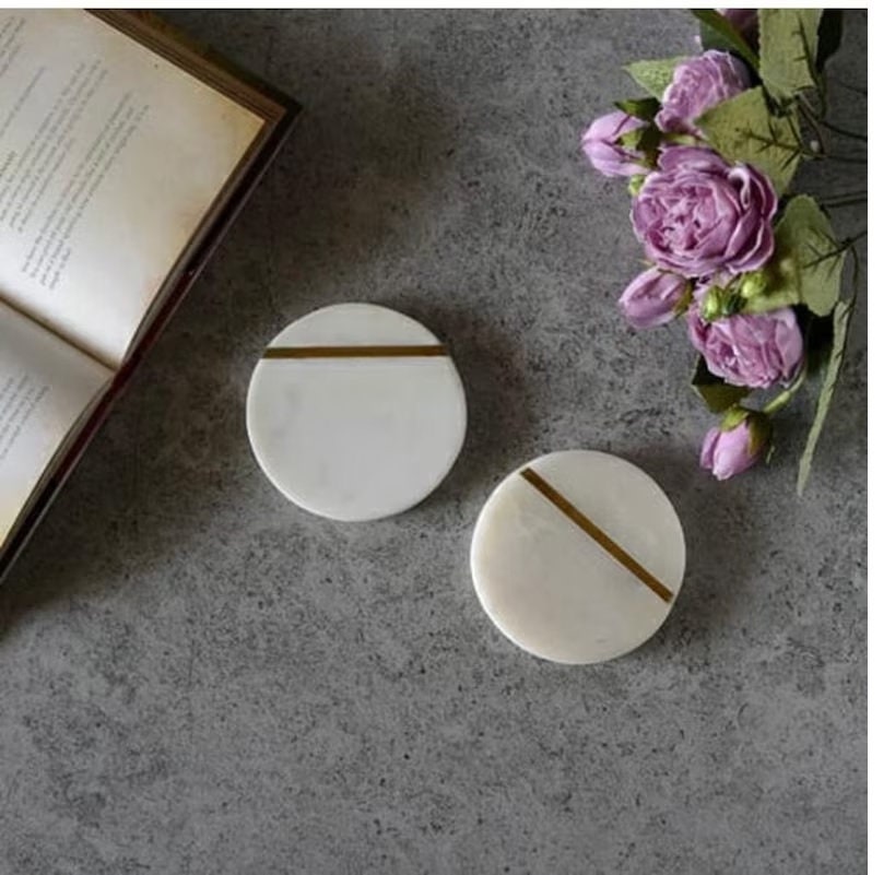 White Marble Coaster Set with Brass Inlay, Modern Marble Drink Coasters