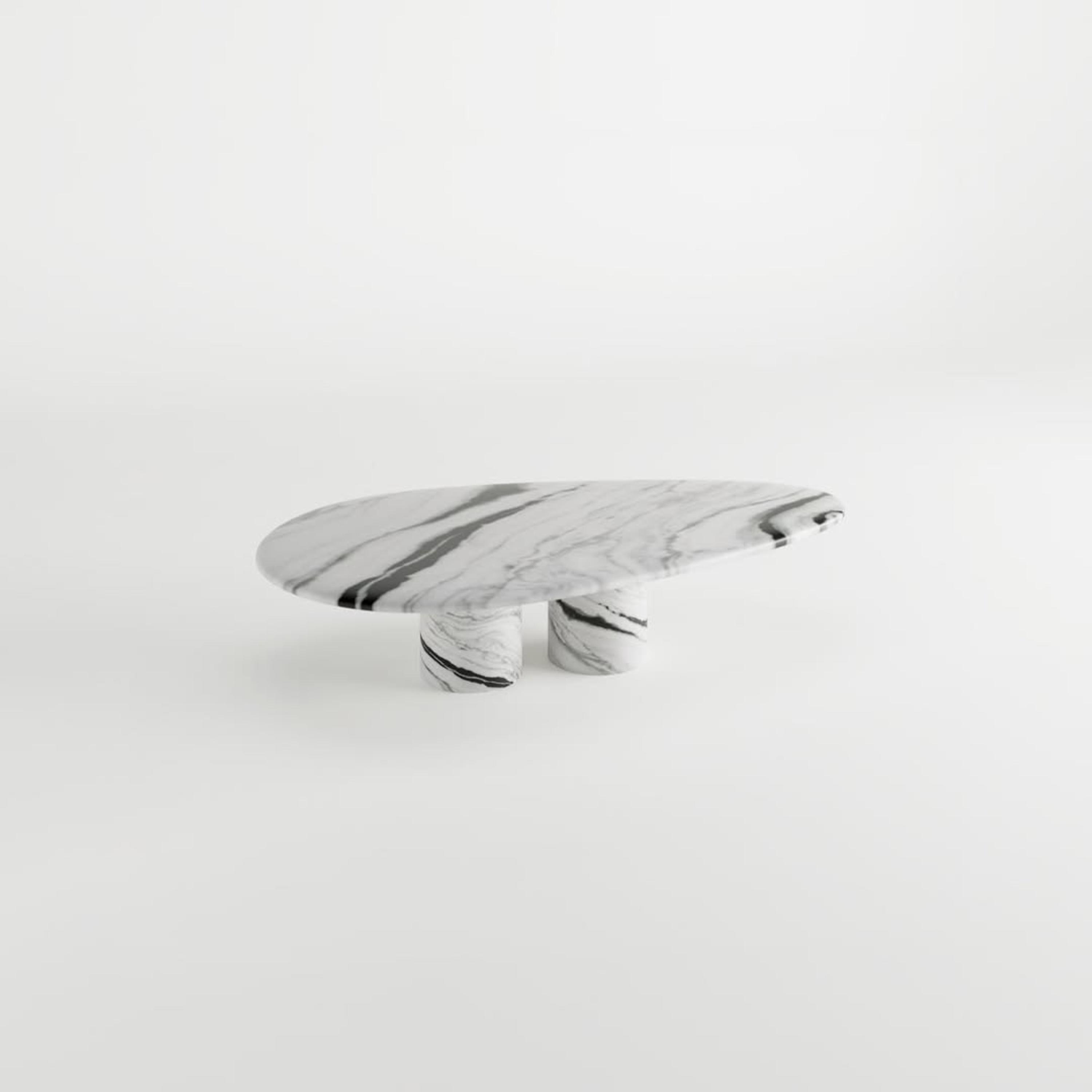 The freeform tabletop gracefully rests on two cylindrical pedestal bases, offering both stability and sculptural presence. Its neutral palette and unique stone veining make it a perfect centerpiece that complements diverse interior styles—from minimalist and contemporary to Mediterranean and wabi-sabi aesthetics.