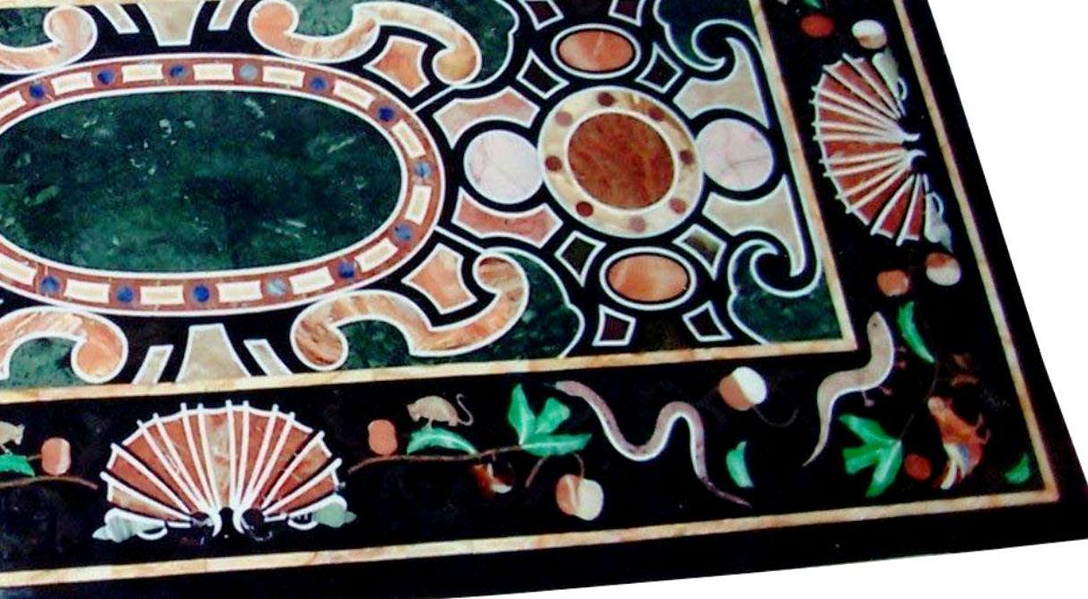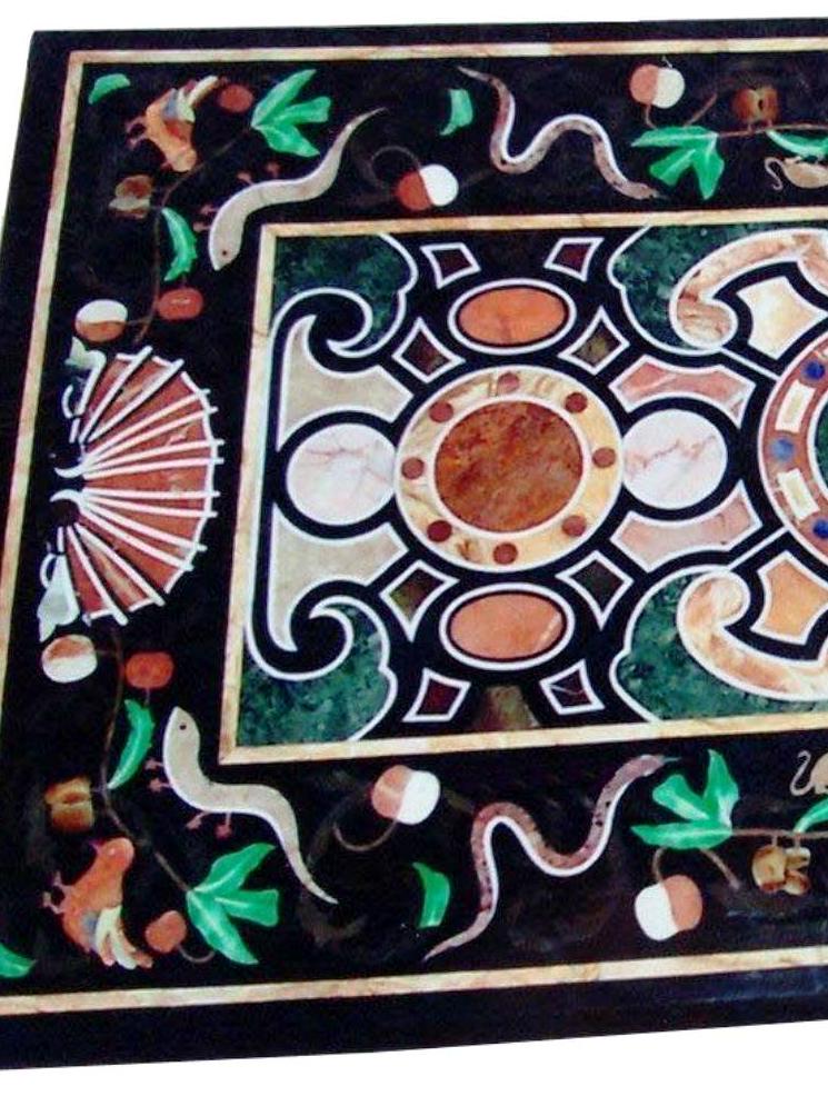 Elevate your interior with this luxurious black marble table top featuring intricate Pietra Dura inlay work. Handmade by skilled artisans, this stunning piece showcases a classic European-inspired design created with carefully cut semi-precious stones inlaid into premium black marble.