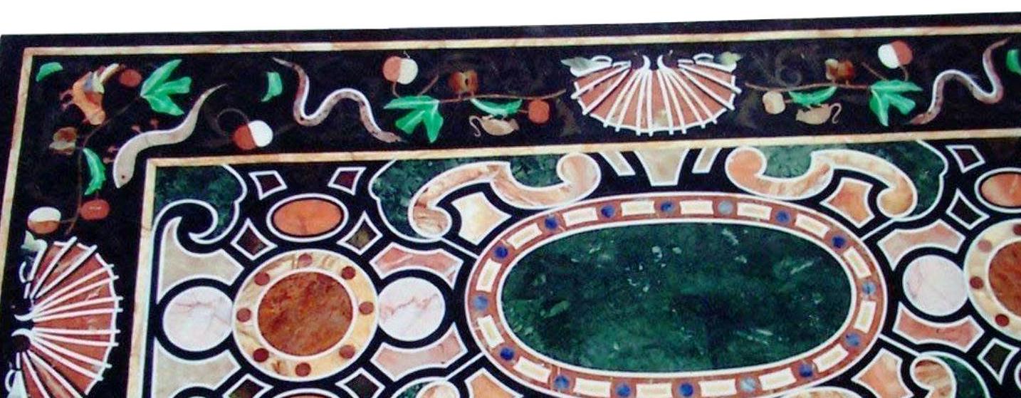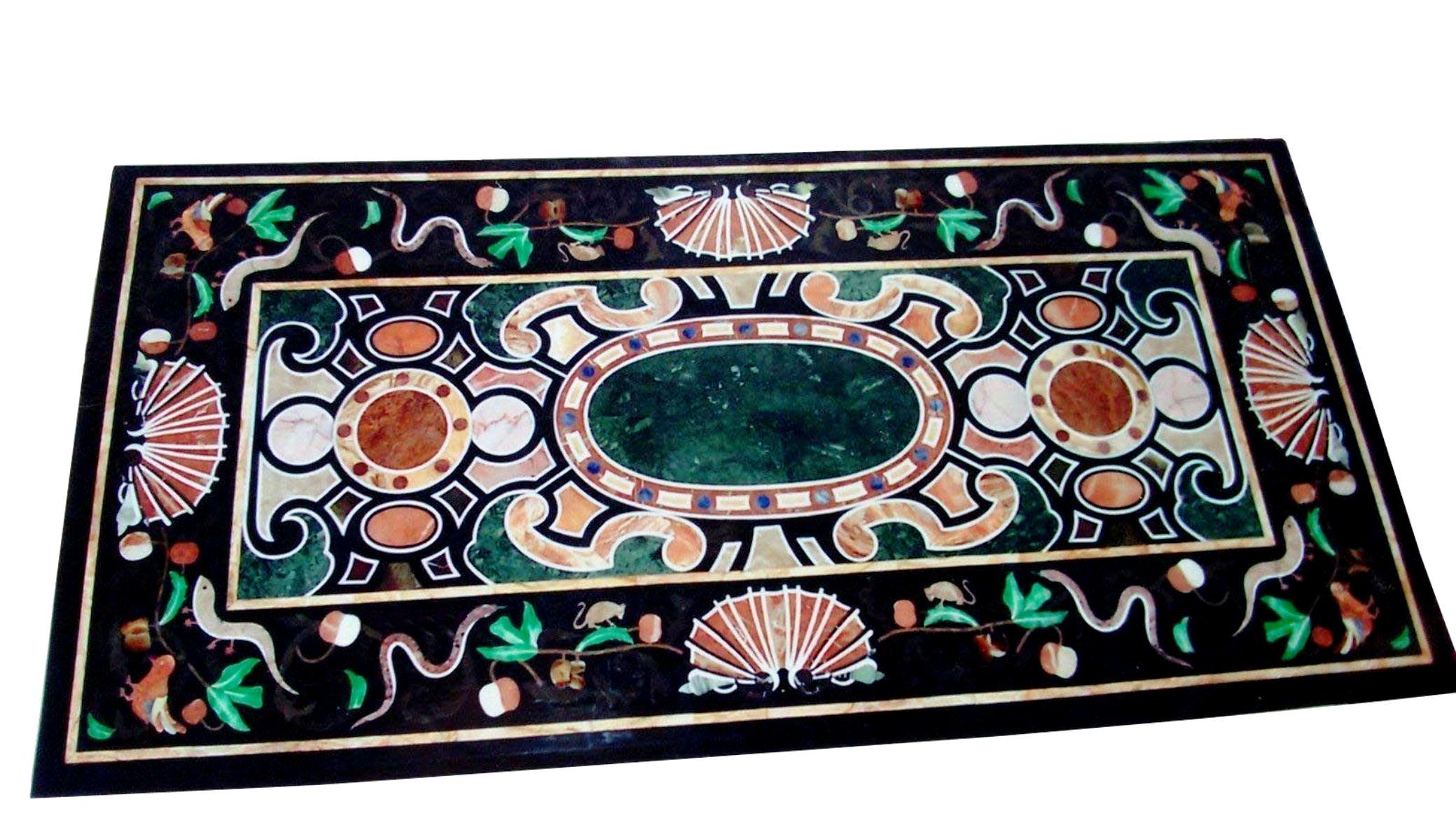The elegant rectangular layout features a central oval green marble panel surrounded by ornate geometric and scroll patterns, beautifully complemented by colorful stone inlays. The decorative border highlights delicate motifs, including fans, vines, and floral elements, giving the piece a timeless artistic character.
