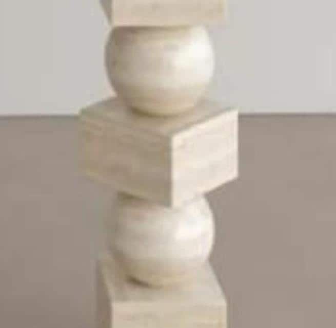 The distinctive base features a geometric stacked design with cubes and spheres, creating an architectural look that blends art with functionality. The clean rectangular tabletop balances the sculptural base, making this piece both practical and visually striking.