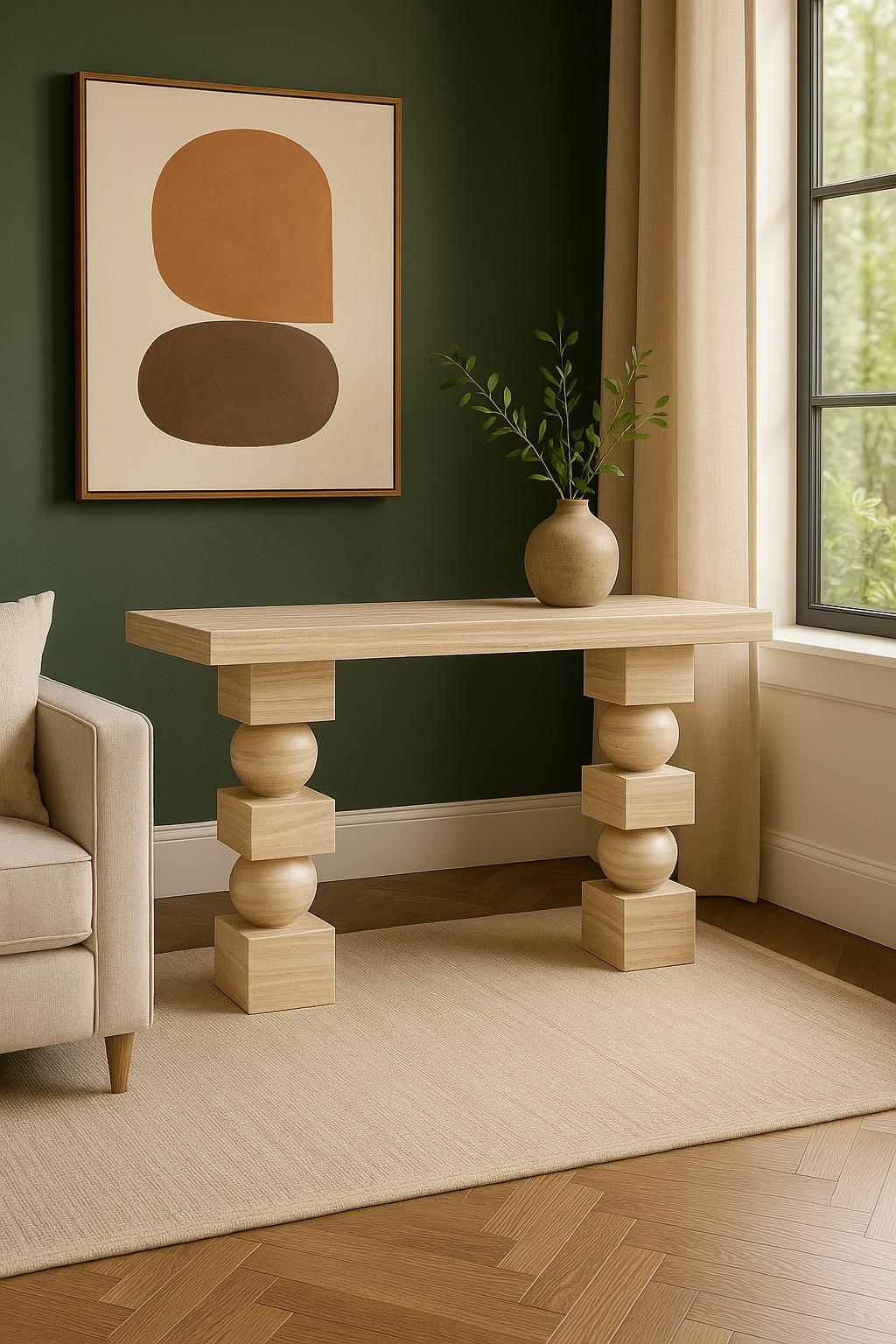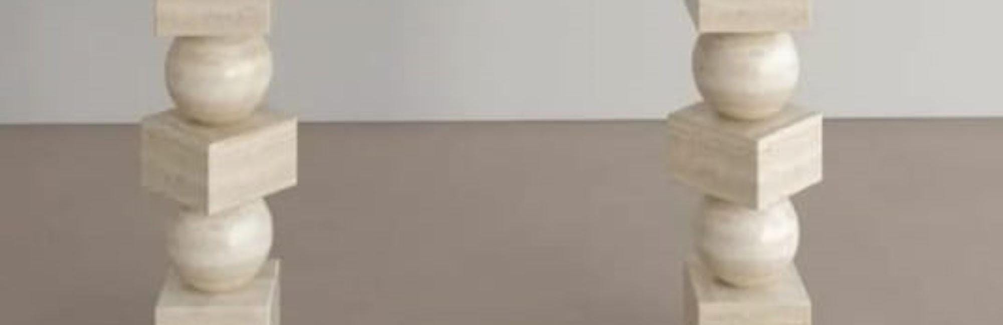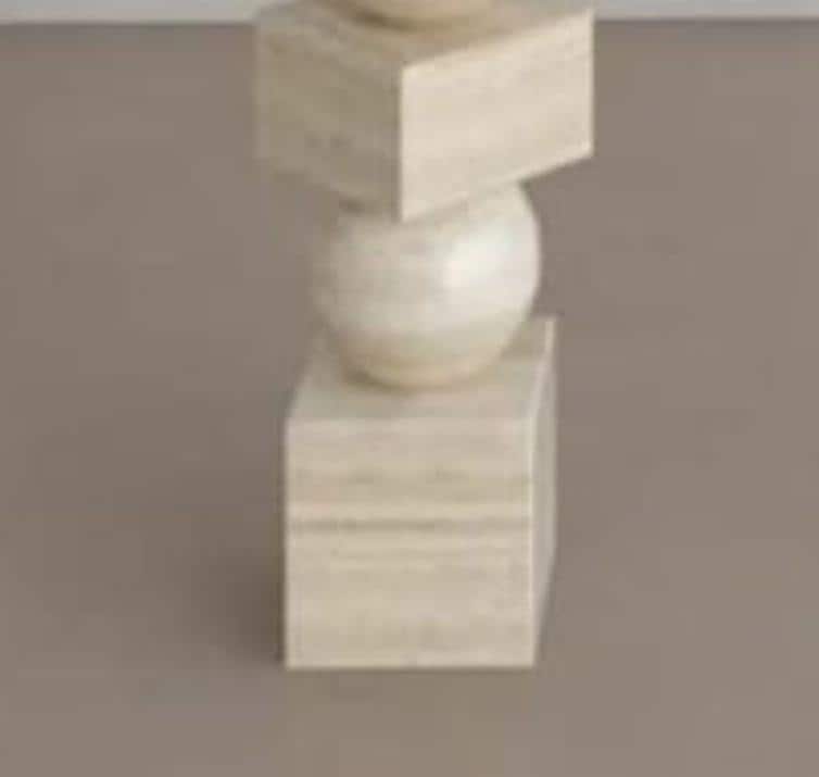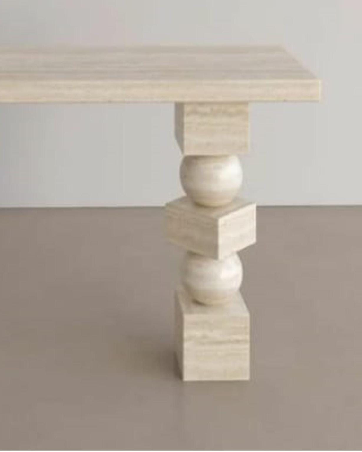 Design: Rectangular top with dual sculptural cube-and-sphere pedestal base