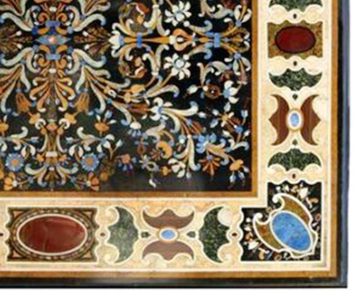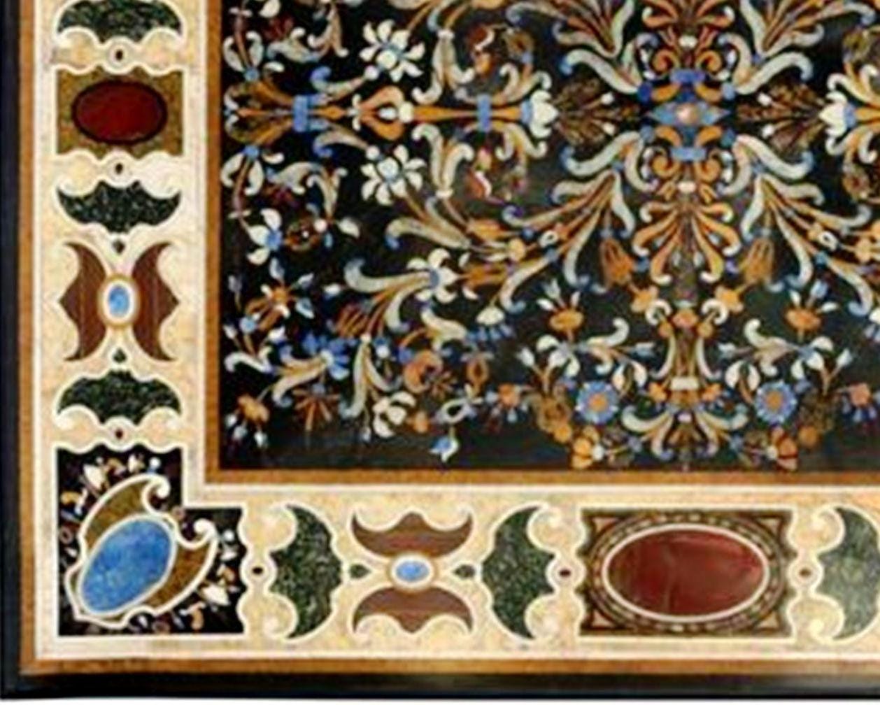 This luxury Pietra Dura marble inlay table top is a masterpiece of traditional stone craftsmanship, featuring an elaborate floral mosaic created with carefully hand-cut semi-precious stones set into natural marble.