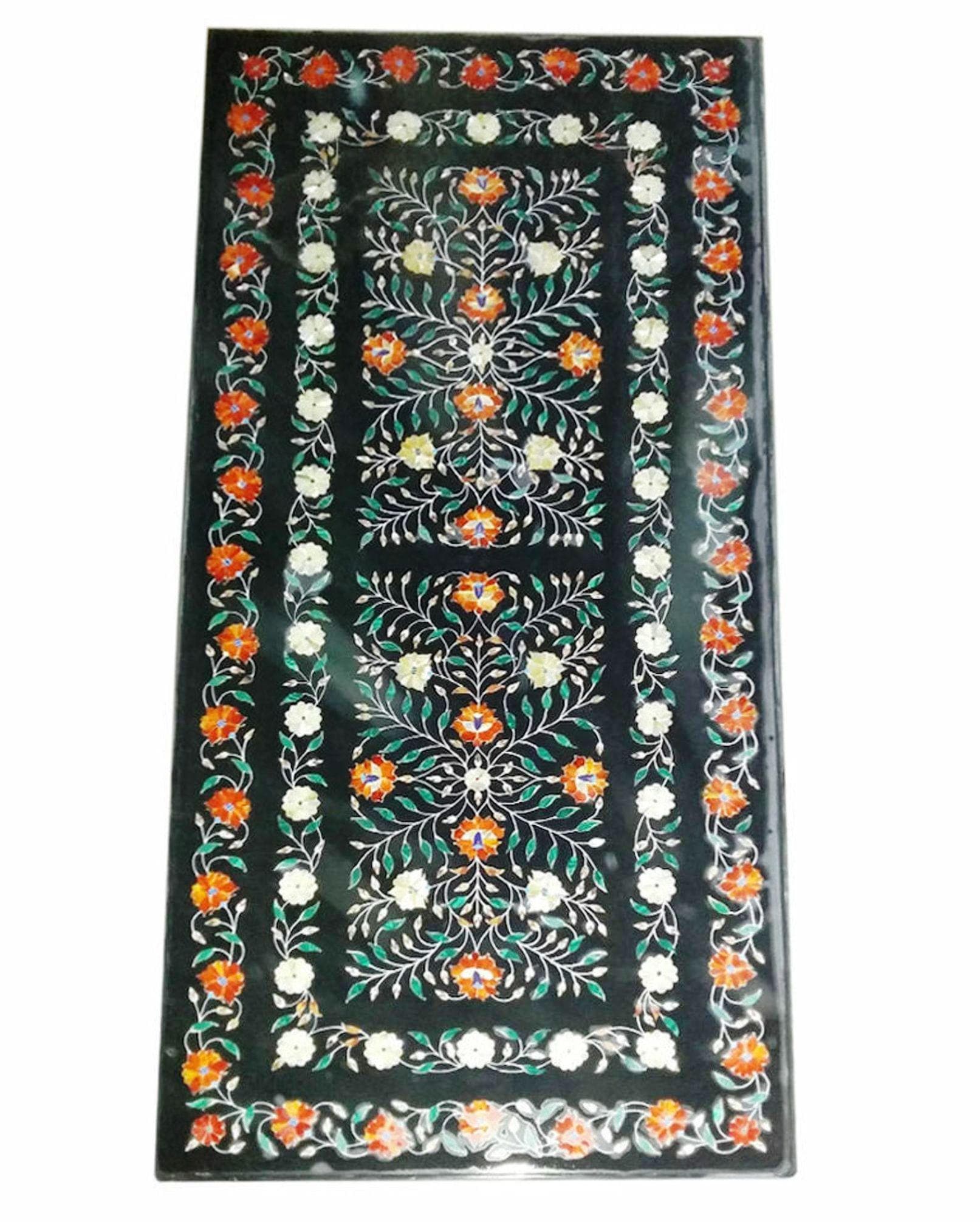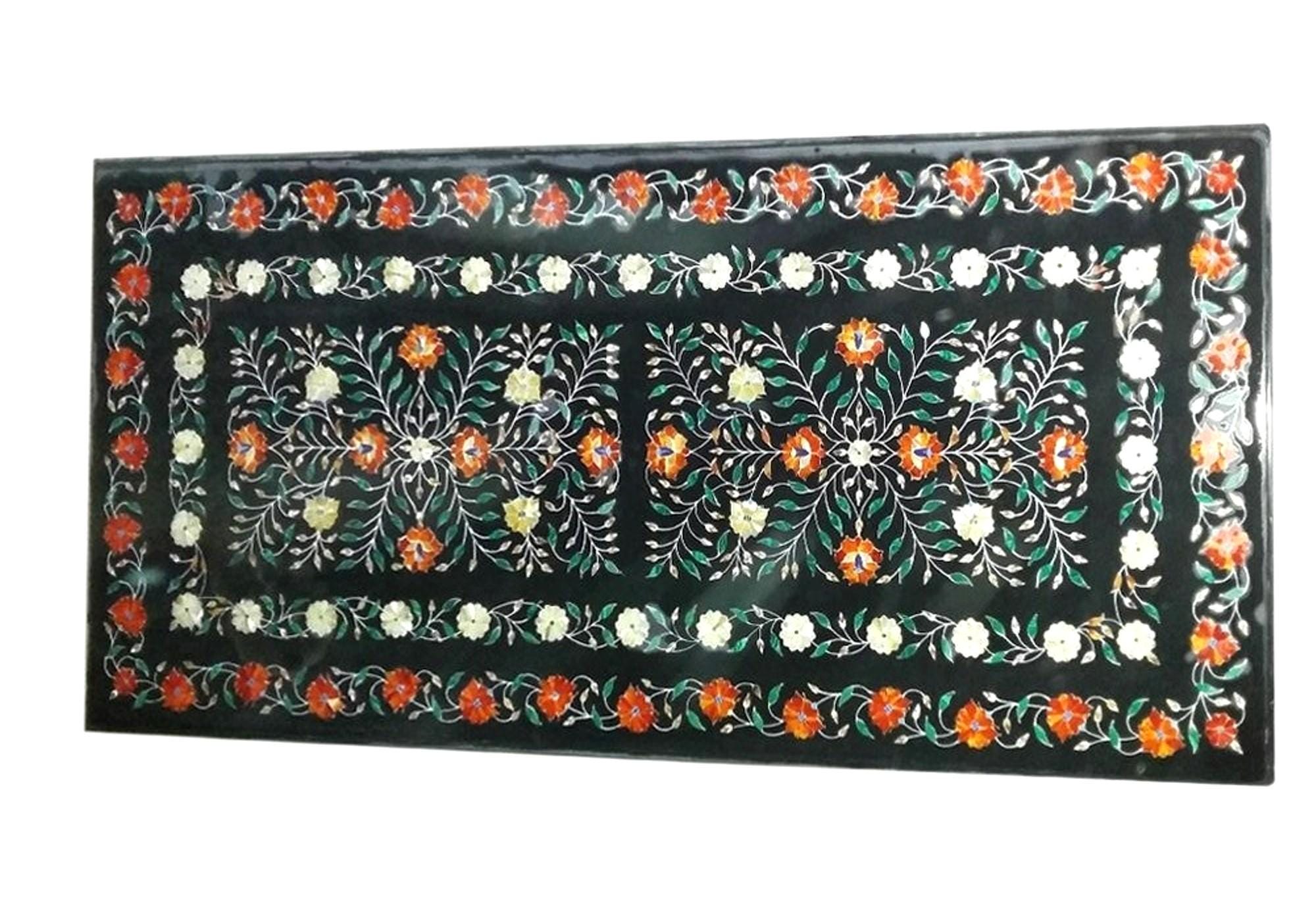 Black Marble Inlay Table Top with Floral Pietra Dura Design (30 x 72 Inches)