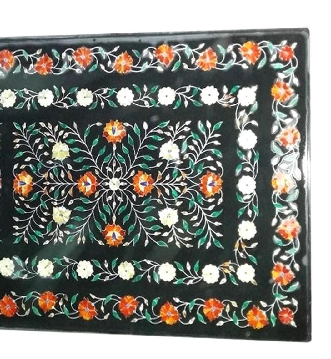 Bring timeless elegance into your space with this exquisite handcrafted black marble inlay table top, inspired by traditional Pietra Dura marble inlay art. Each piece is carefully handmade by skilled artisans who intricately set semi-precious stones into polished black marble to create a stunning floral pattern.