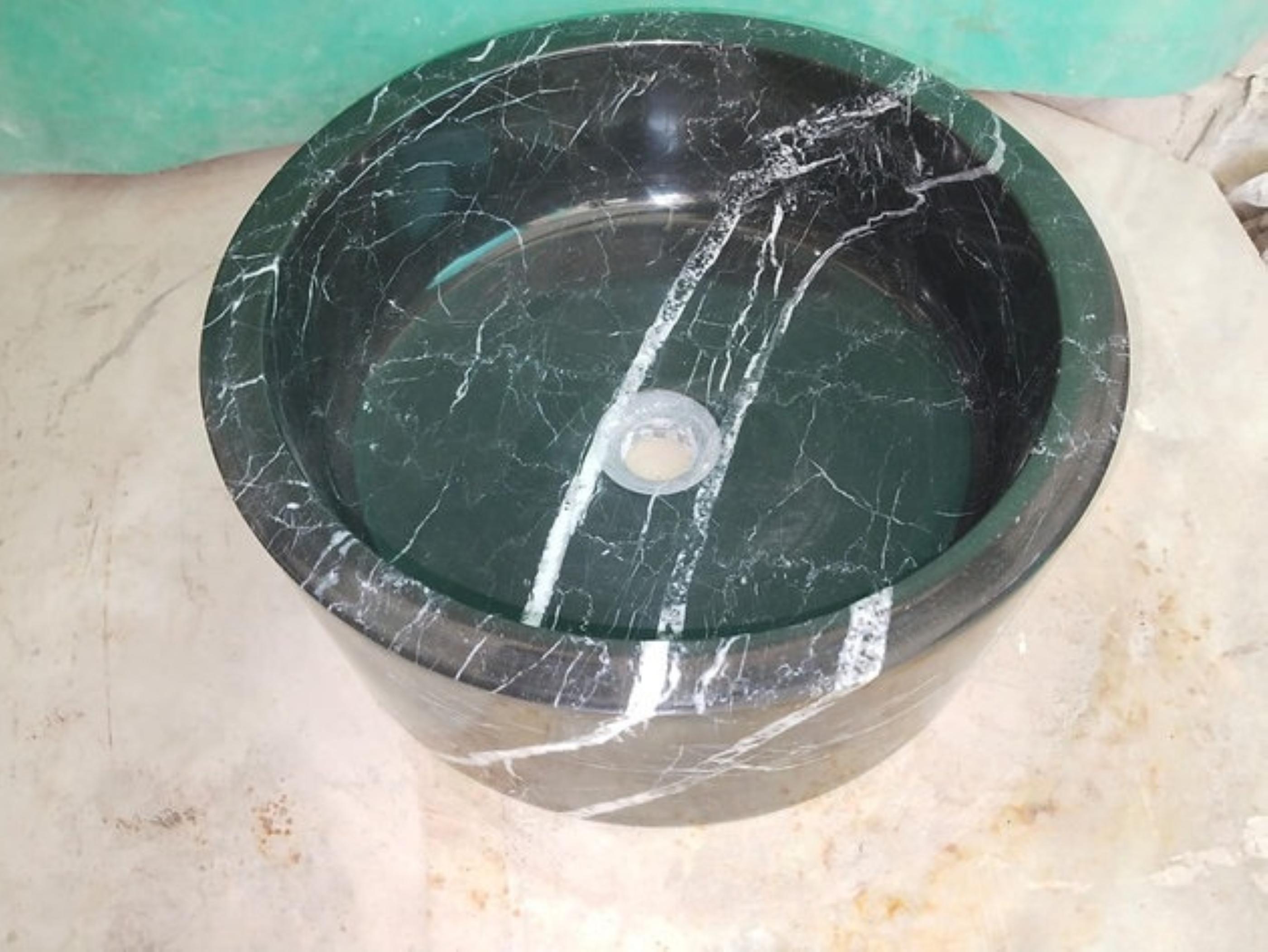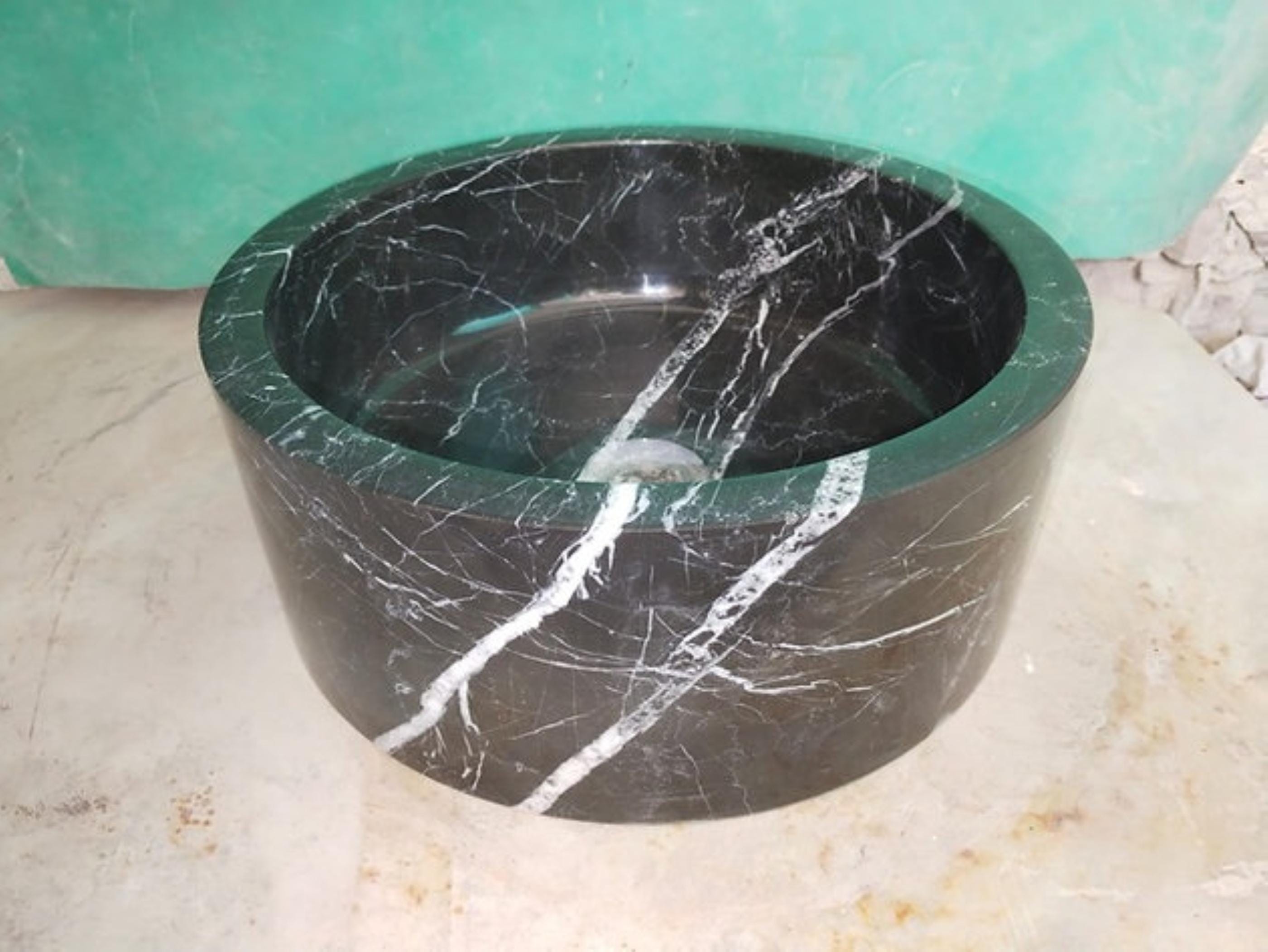 This hand-carved black marble vessel sink brings dramatic elegance and natural stone beauty to modern bathrooms. Crafted from solid marble, the basin features a deep, round bowl design with bold white veining running naturally through the dark stone, creating a striking contrast.