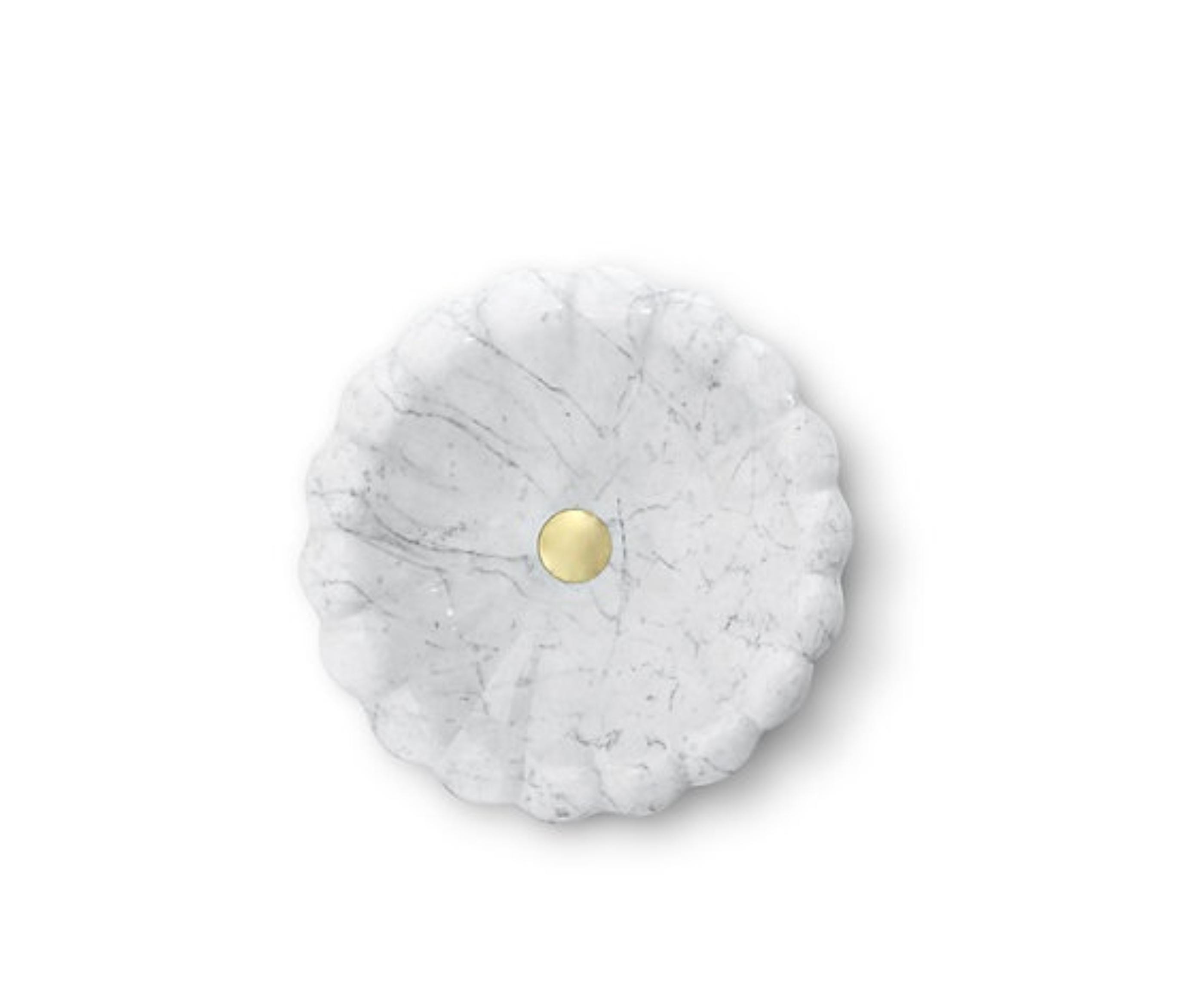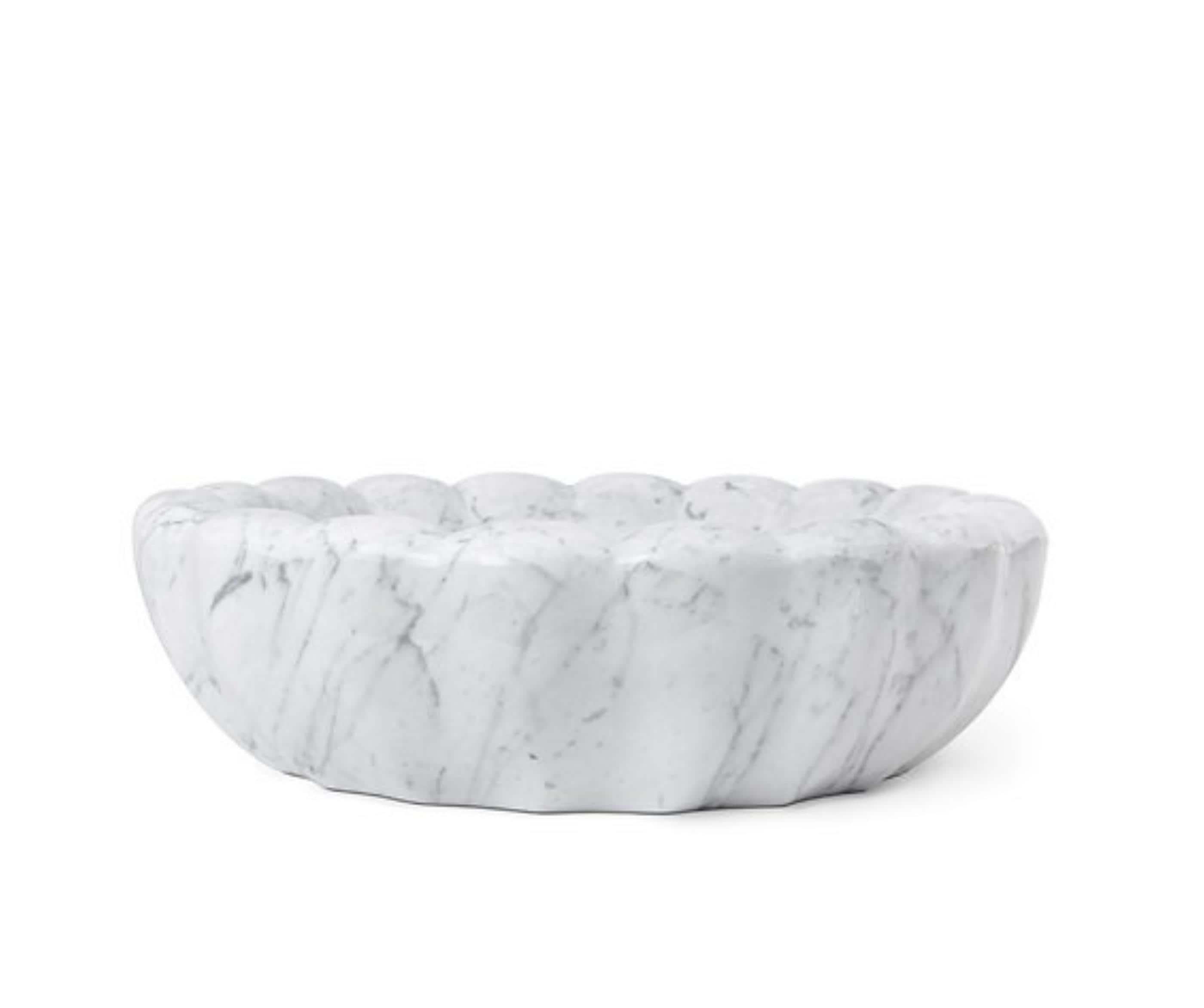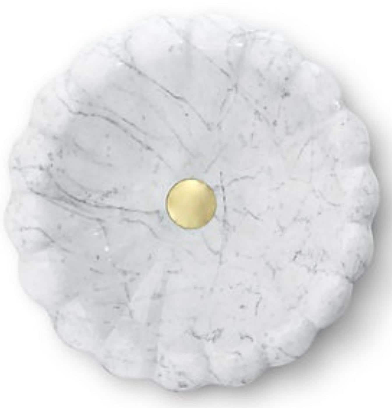 Add timeless elegance to your bathroom with this white marble vessel sink, beautifully crafted from solid natural stone. The unique scalloped exterior design creates a soft sculptural look, while the smooth round basin provides both style and functionality.