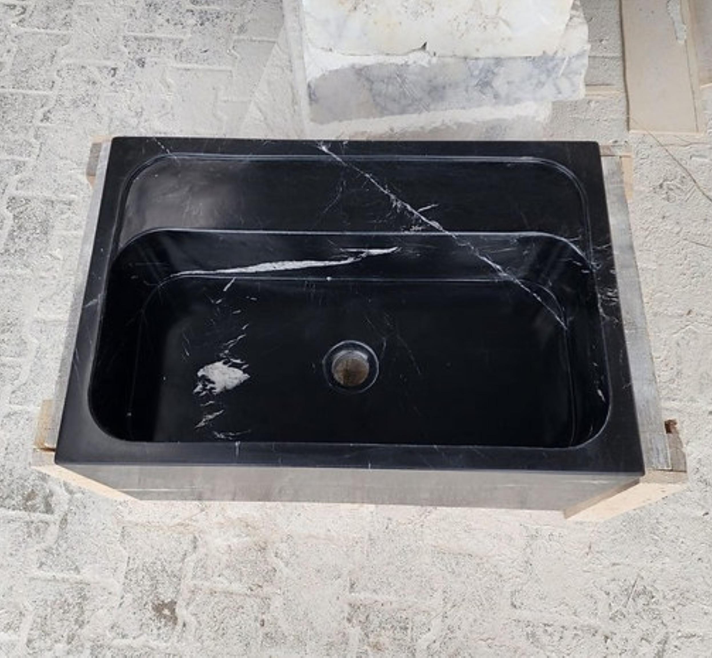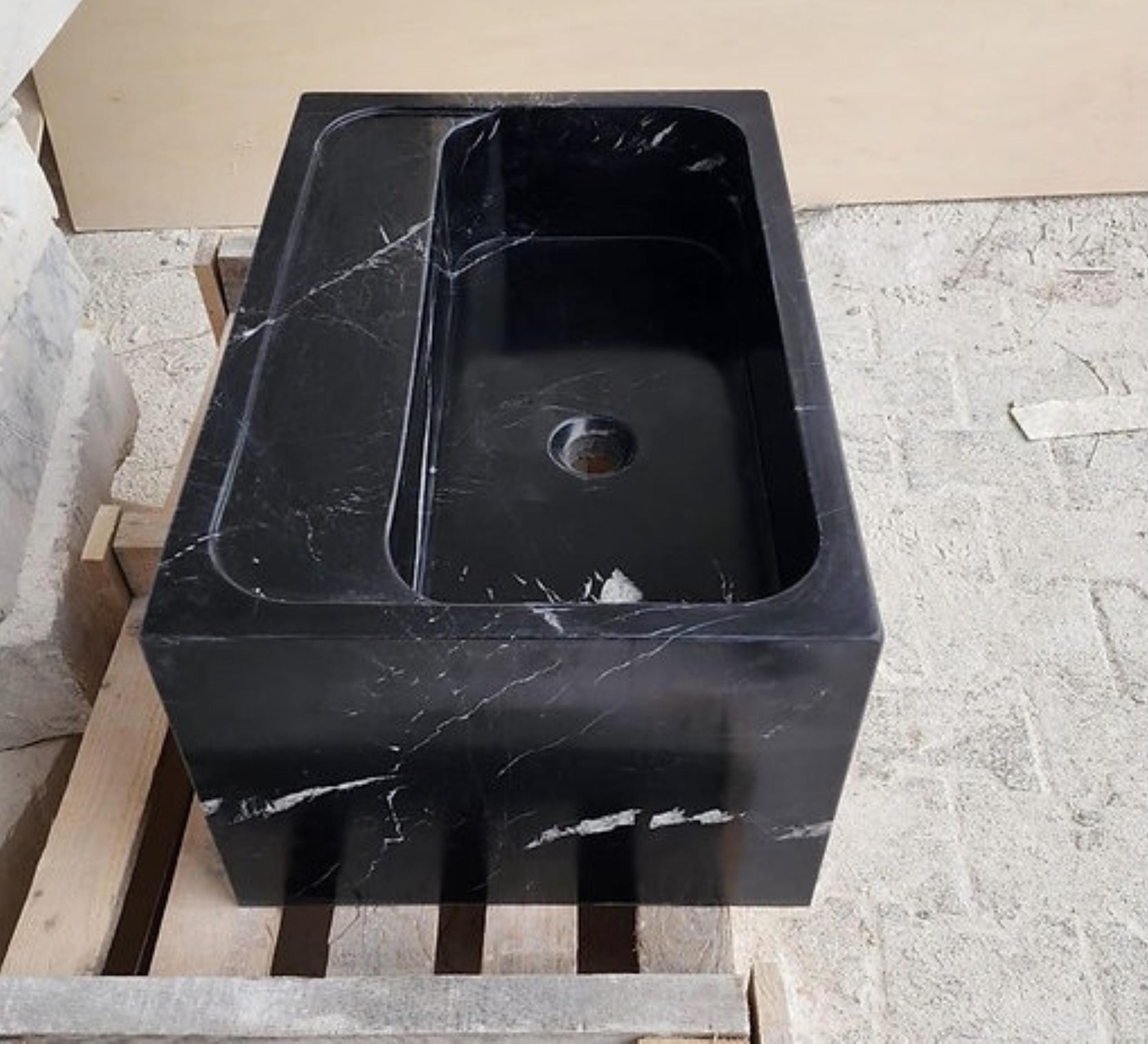 Bring bold luxury to your kitchen with this Nero Marquina marble farmhouse sink, handcrafted from premium natural stone. Known for its dramatic deep black color with striking white veining, Nero Marquina marble creates a stunning focal point in any kitchen.